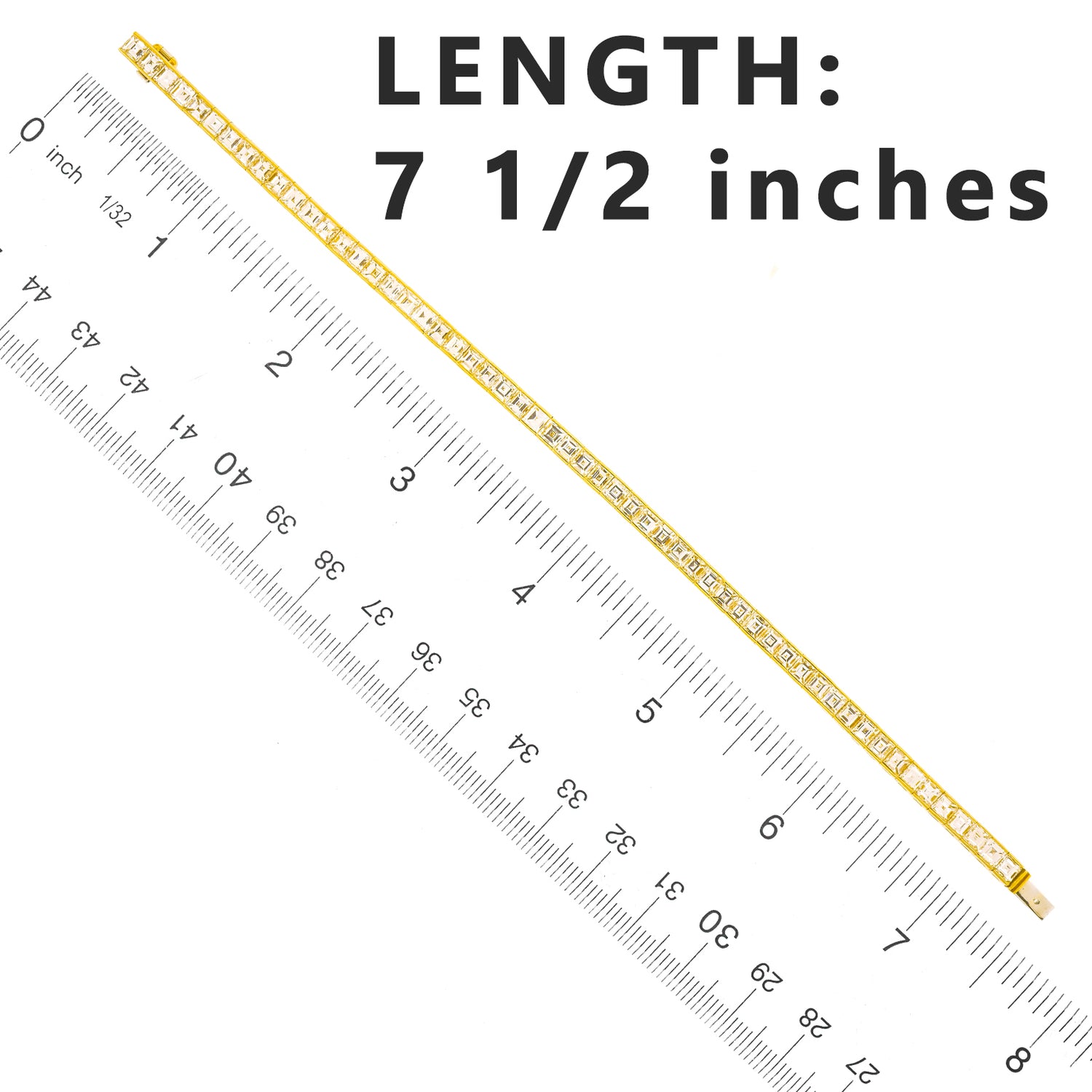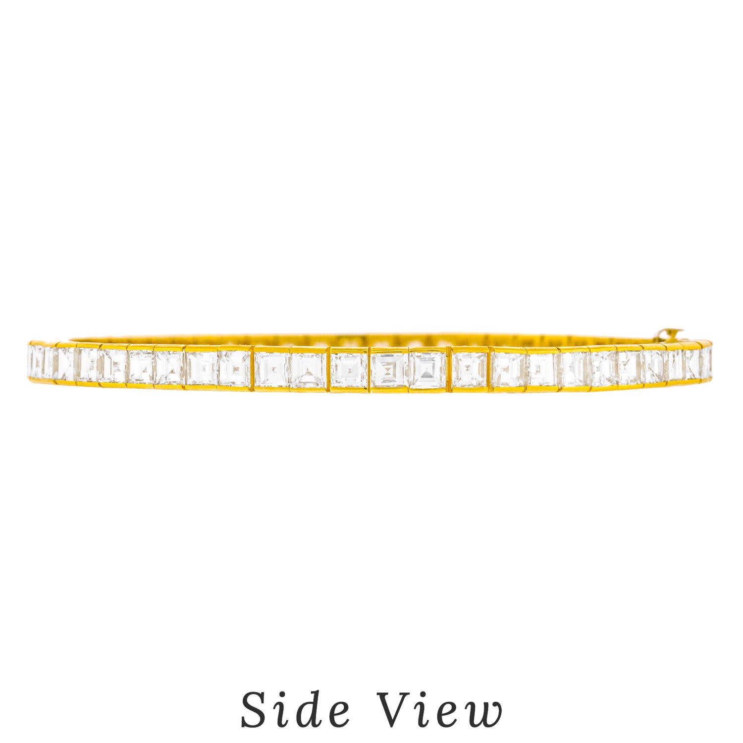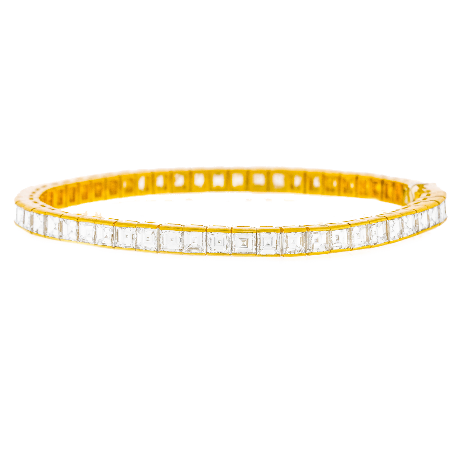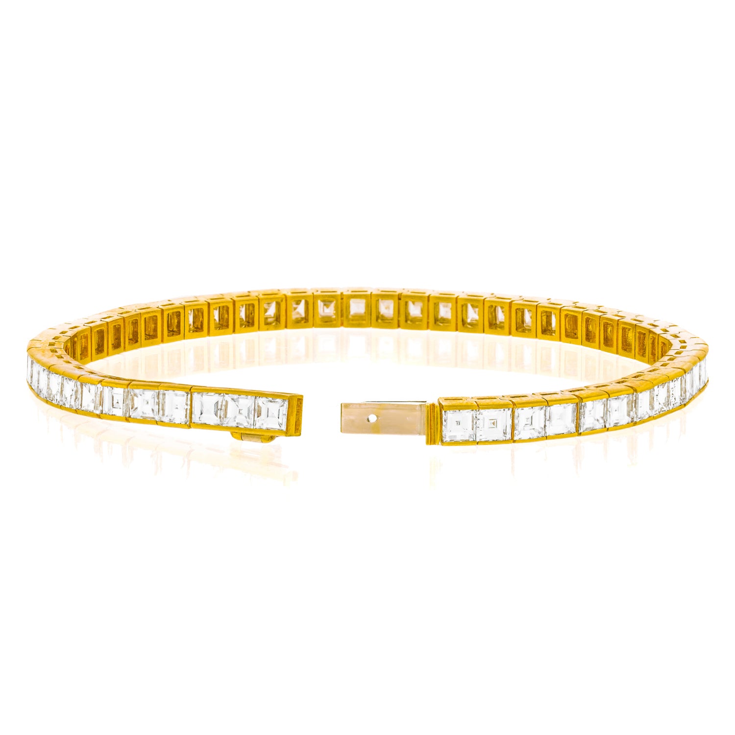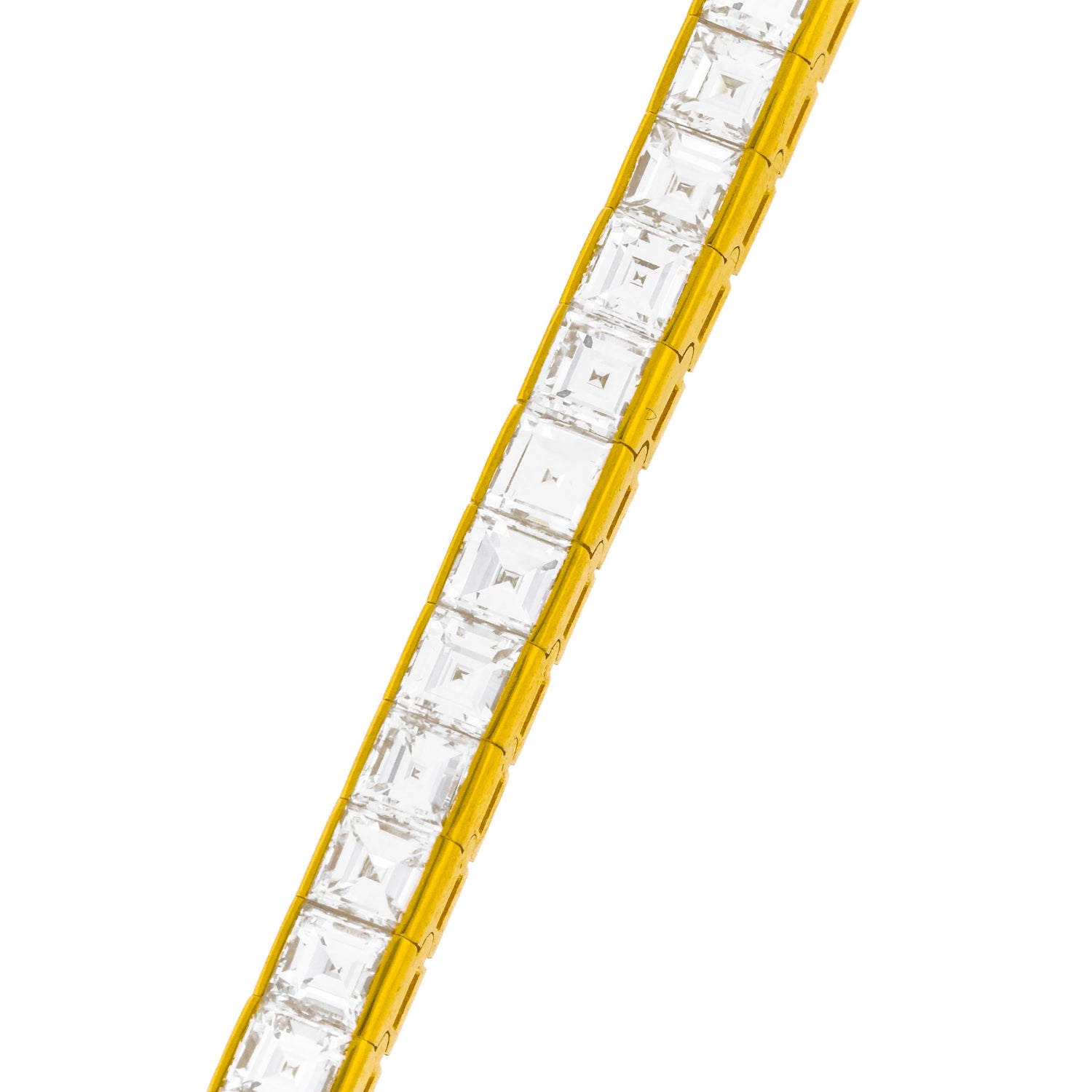 Circa 1980s, 18k, by Tannler, Zurich, Switzerland. Set with 14.0 carats of superbly matched spectacular white diamonds (E color, VVS clarity, modified Asscher cut), this ultimate line bracelet by Tannler of Zurich is sublime. Its classic look is so exquisitely understated that it becomes transcendently, hyper-modern. The meticulously fine fabrication that Tannler is renowned for completes the visual narrative. Excellent condition.