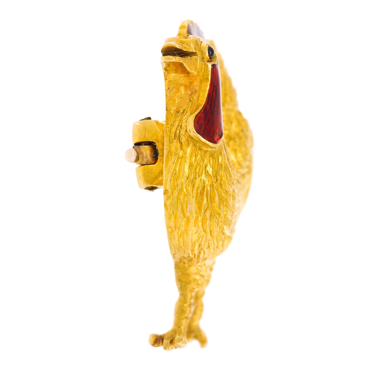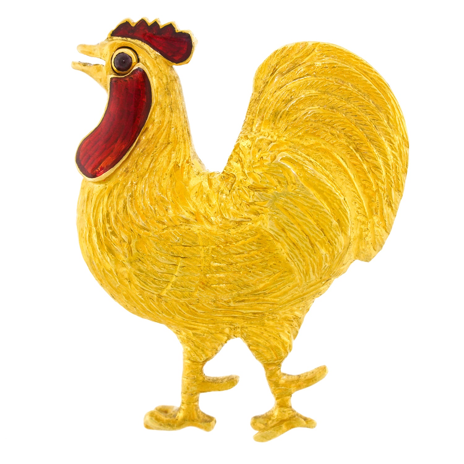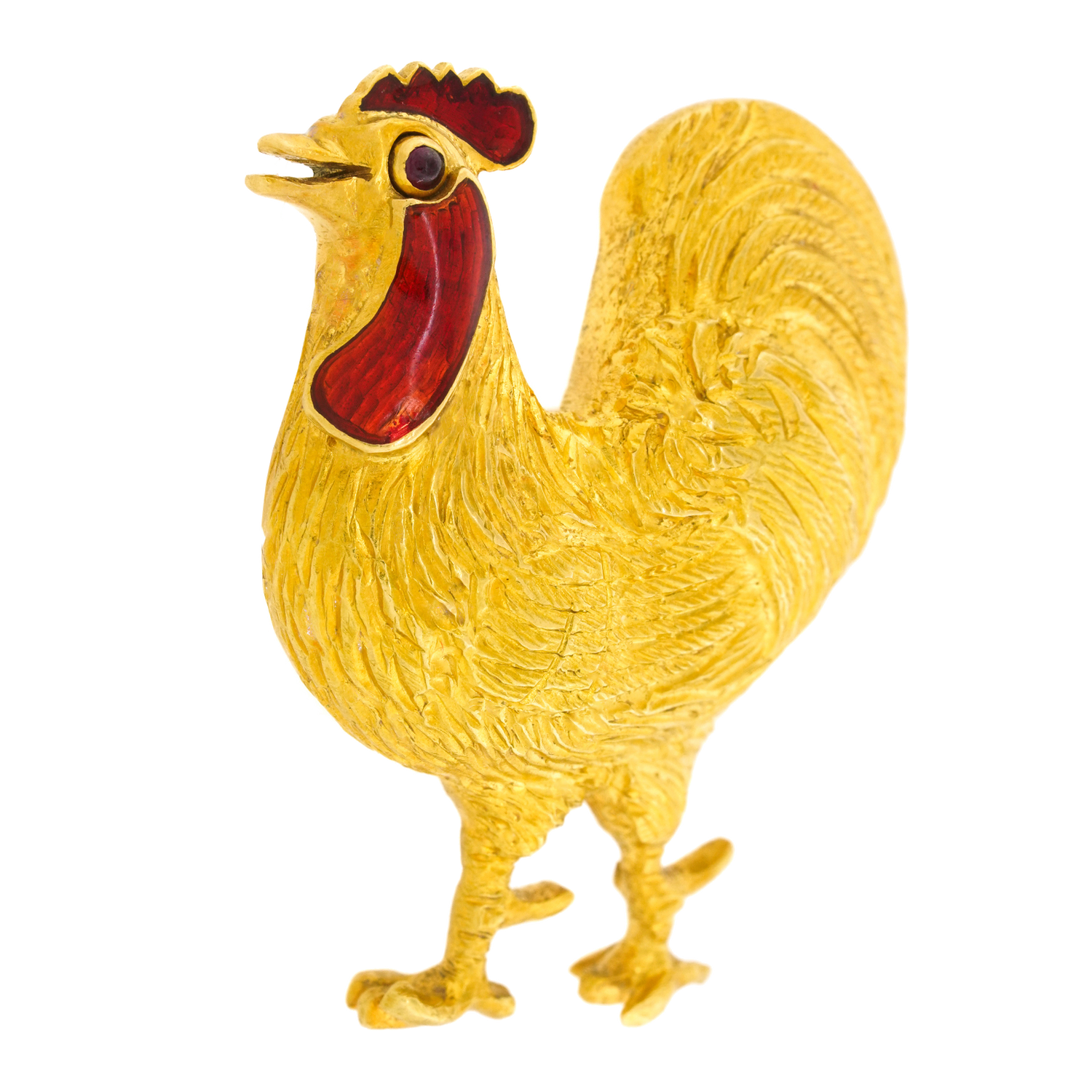 Circa 1969, 18k, by Tessier, London. This charming Chanticleer pin is beautifully figured, well-sized, and finely fabricated. Set with a ruby eye and accented with bright red enamel, the look is smart town and country. Chic! Excellent condition.