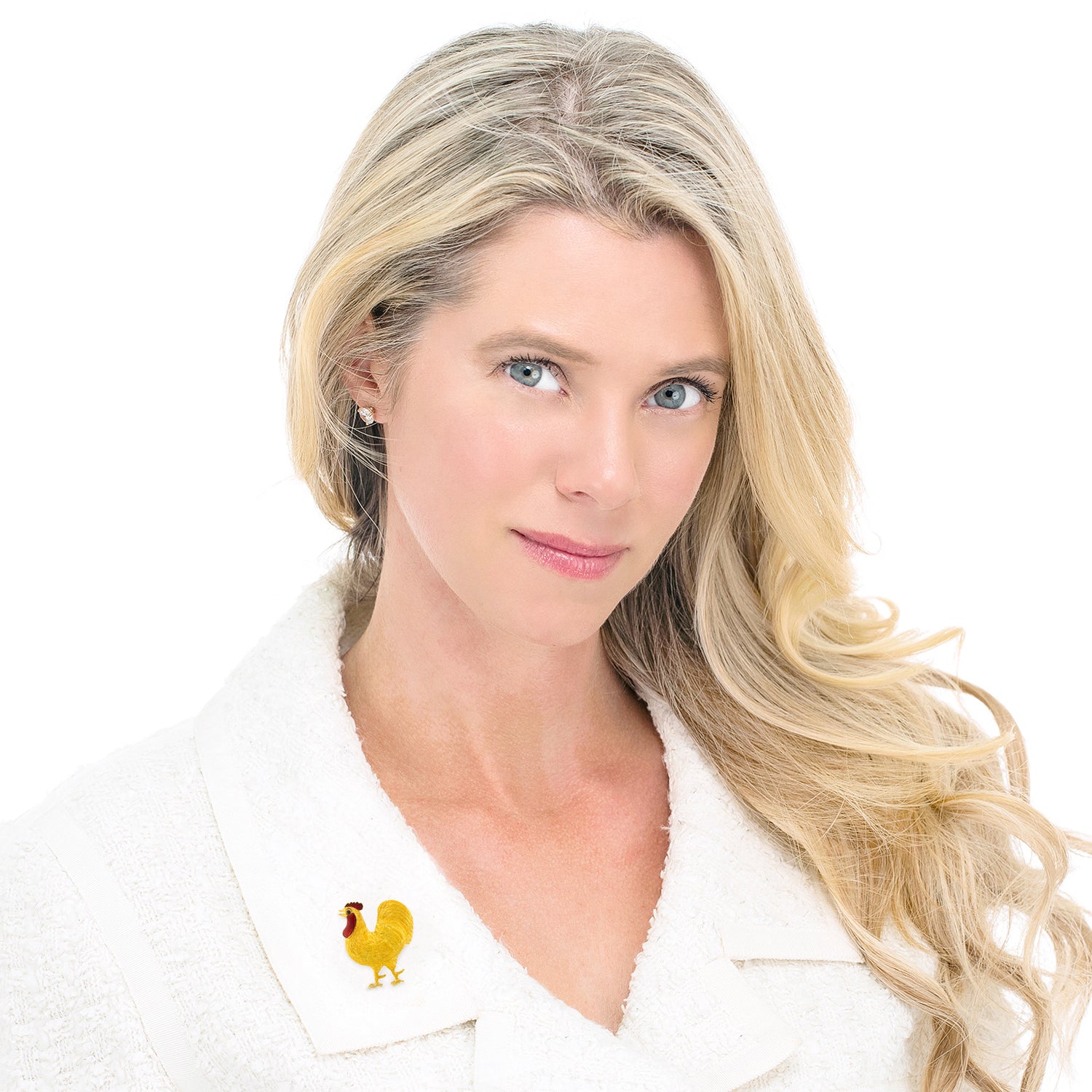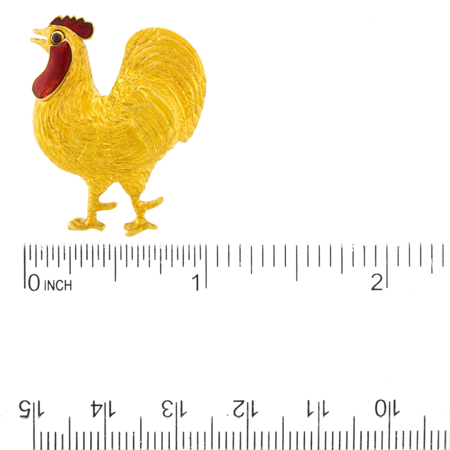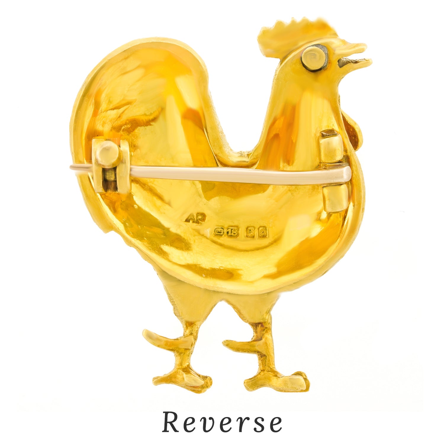 Circa 1969, 18k, by Tessier, London. This charming Chanticleer pin is beautifully figured, well-sized, and finely fabricated. Set with a ruby eye and accented with bright red enamel, the look is smart town and country. Chic! Excellent condition.