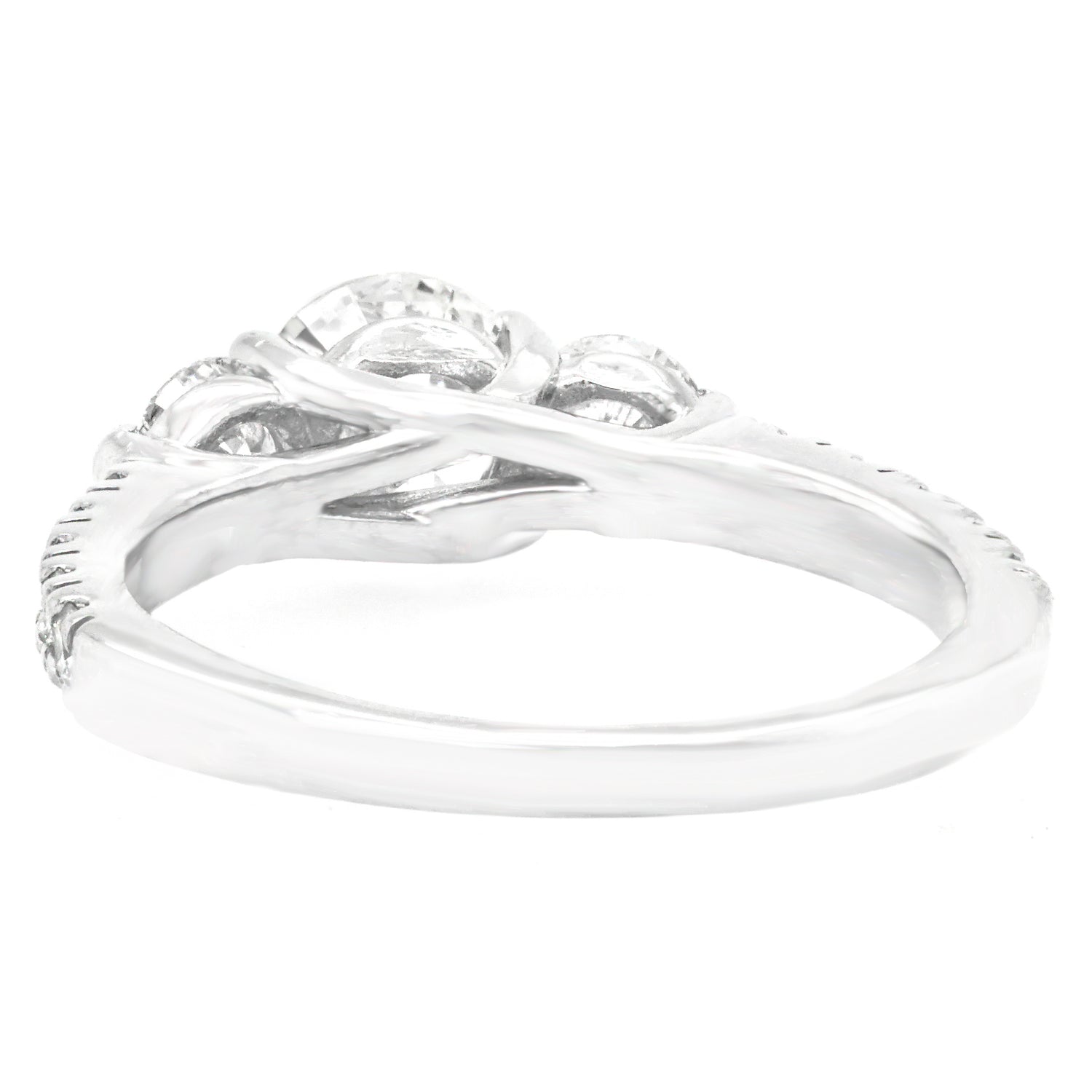 Circa 2000s, Platinum, by Lieberfarb, American. This fabulous twist on the classic three-stone ring features brilliant white stones and balanced proportions. Finely fashioned in platinum, this contemporary design is set with a fine white 1.01 carat center diamond (I color, VS1 clarity GIA), with a .26ct diamond on each side. Additionally, there are .30 carats of accent stones on the sides. Delightful as an engagement ring or right-hand ring. Excellent condition.