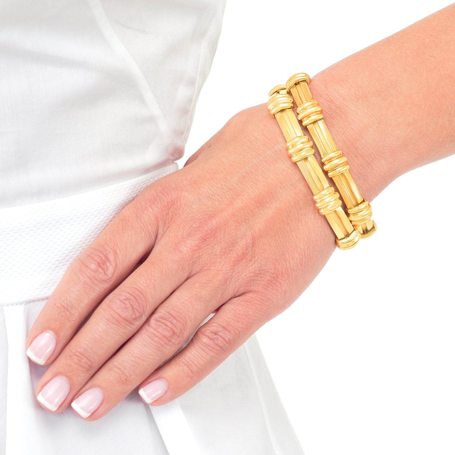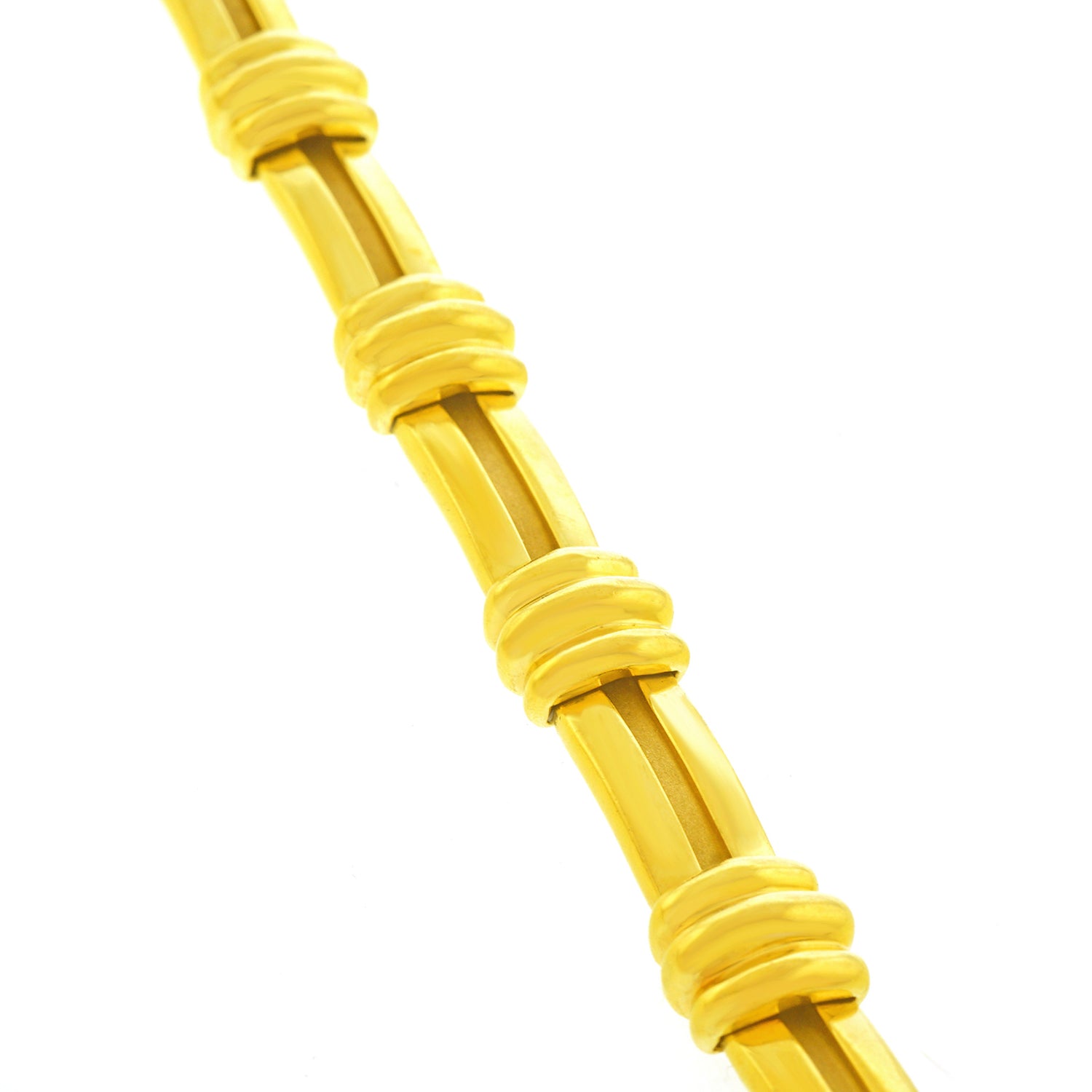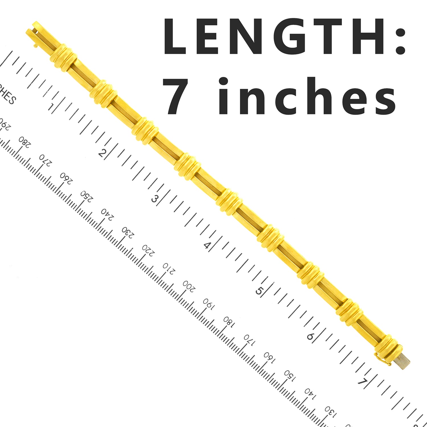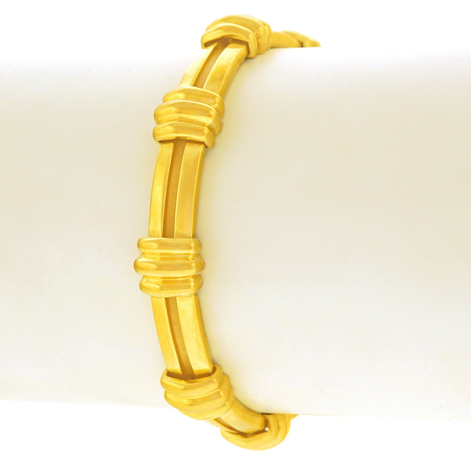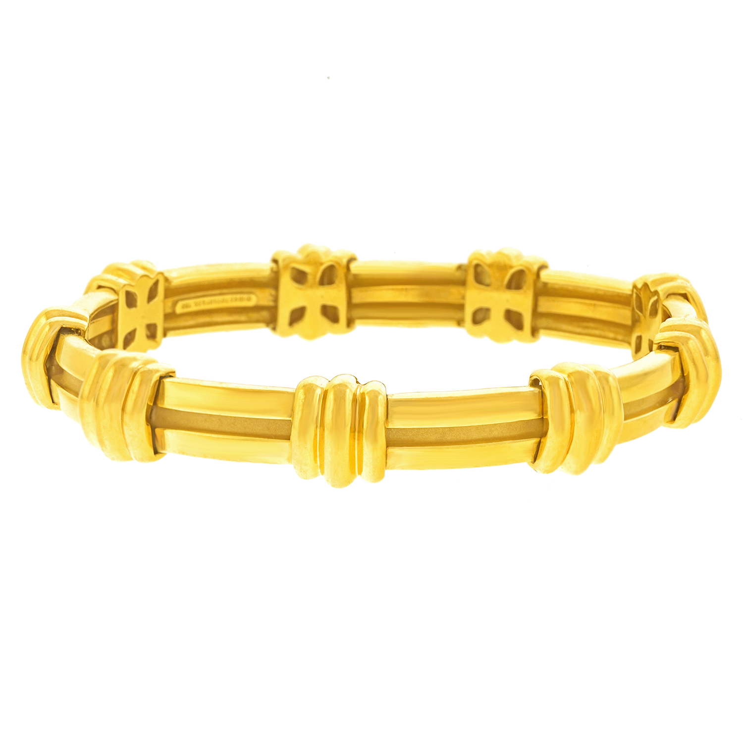 Circa 1995, 18k, by Tiffany & Co., New York. Catwalk to sidewalk this fabulous Tiffany bracelet is a brilliant everyday accessory. An early example of their iconic Atlas motif, these chic bracelets take their design cues from Tiffany's famous Atlas clock. Its look is stylishly understated, pure American girl glamour, …offhand, breezy and posh. Finely fabricated in 18k yellow gold to Tiffany's exacting standards, it is in excellent condition.