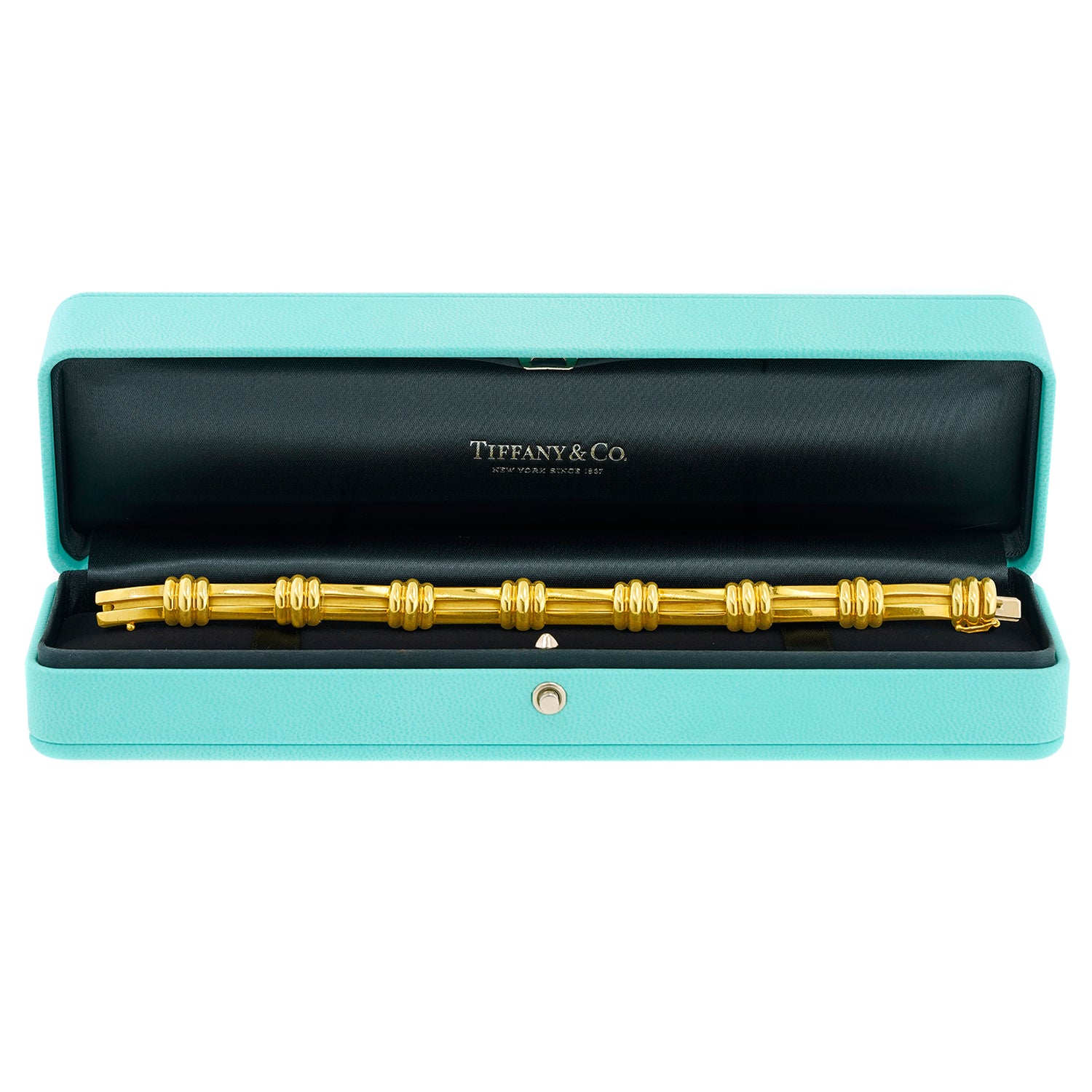 Circa 1995, 18k, by Tiffany & Co., New York. Catwalk to sidewalk this fabulous Tiffany bracelet is a brilliant everyday accessory. An early example of their iconic Atlas motif, these chic bracelets take their design cues from Tiffany's famous Atlas clock. Its look is stylishly understated, pure American girl glamour, …offhand, breezy and posh. Finely fabricated in 18k yellow gold to Tiffany's exacting standards, it is in excellent condition.
