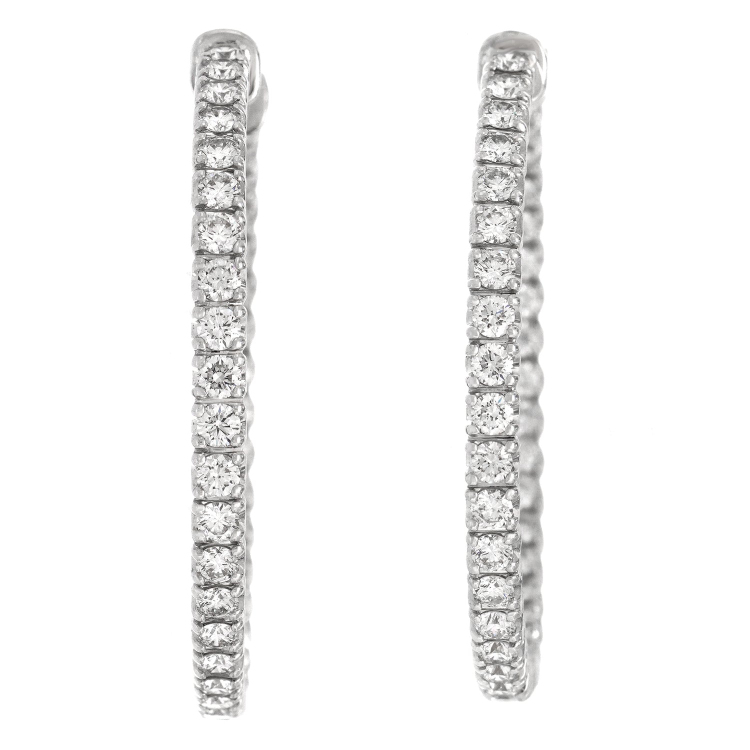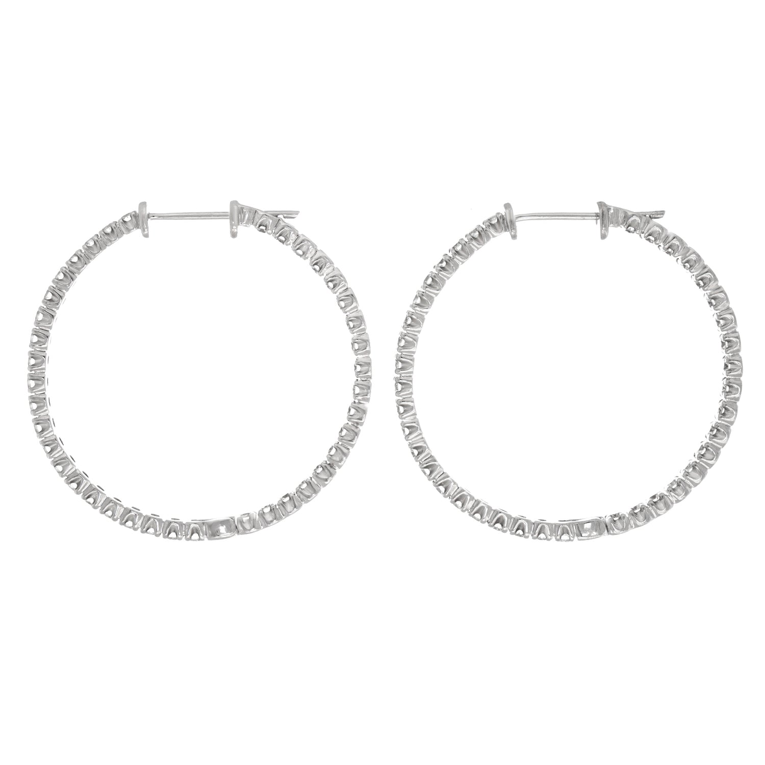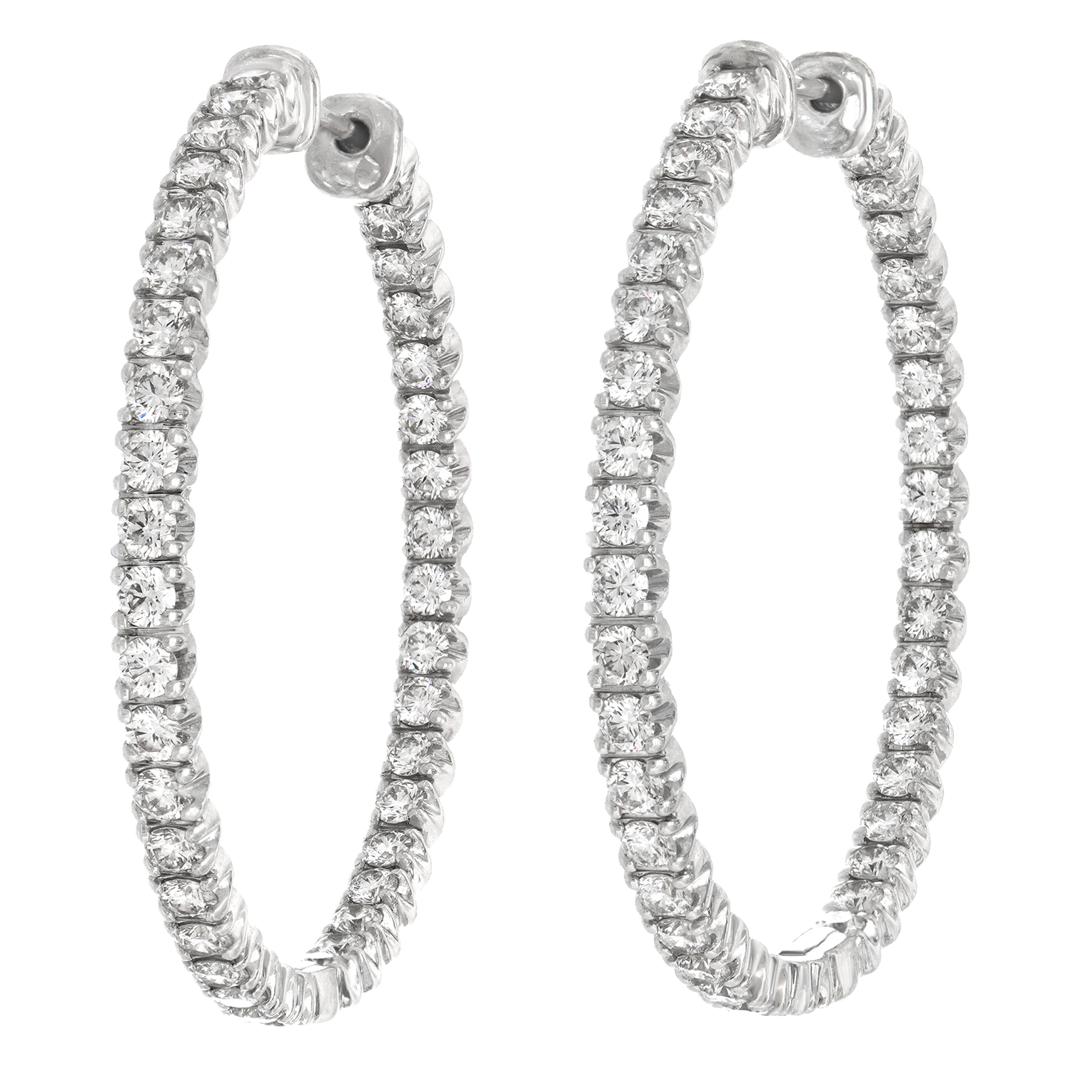 Circa 2005, 18k, by Tiffany & Co., New York. These chic diamond hoops by Tiffany & Co. are all about the diamonds! Set with 2.79 carats of brilliant white diamonds (G color VS clarity), the look is sparkling American girl glamour. At one and a half inches in diameter, they are proportioned perfectly for the ear and grab the attention of the eye tastefully. Excellent condition.