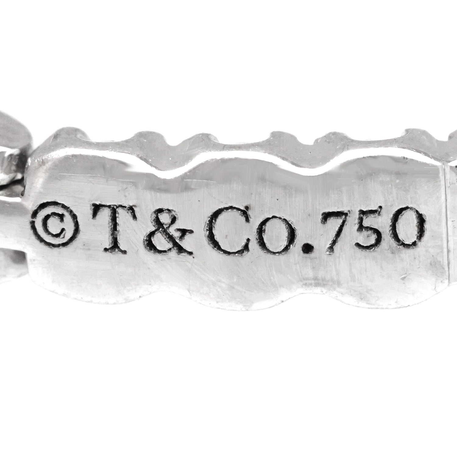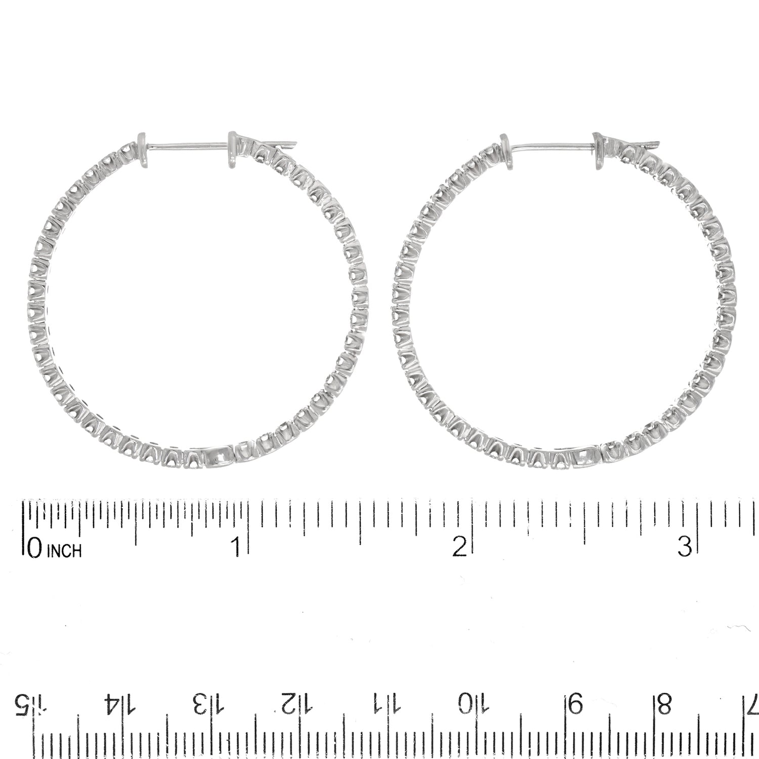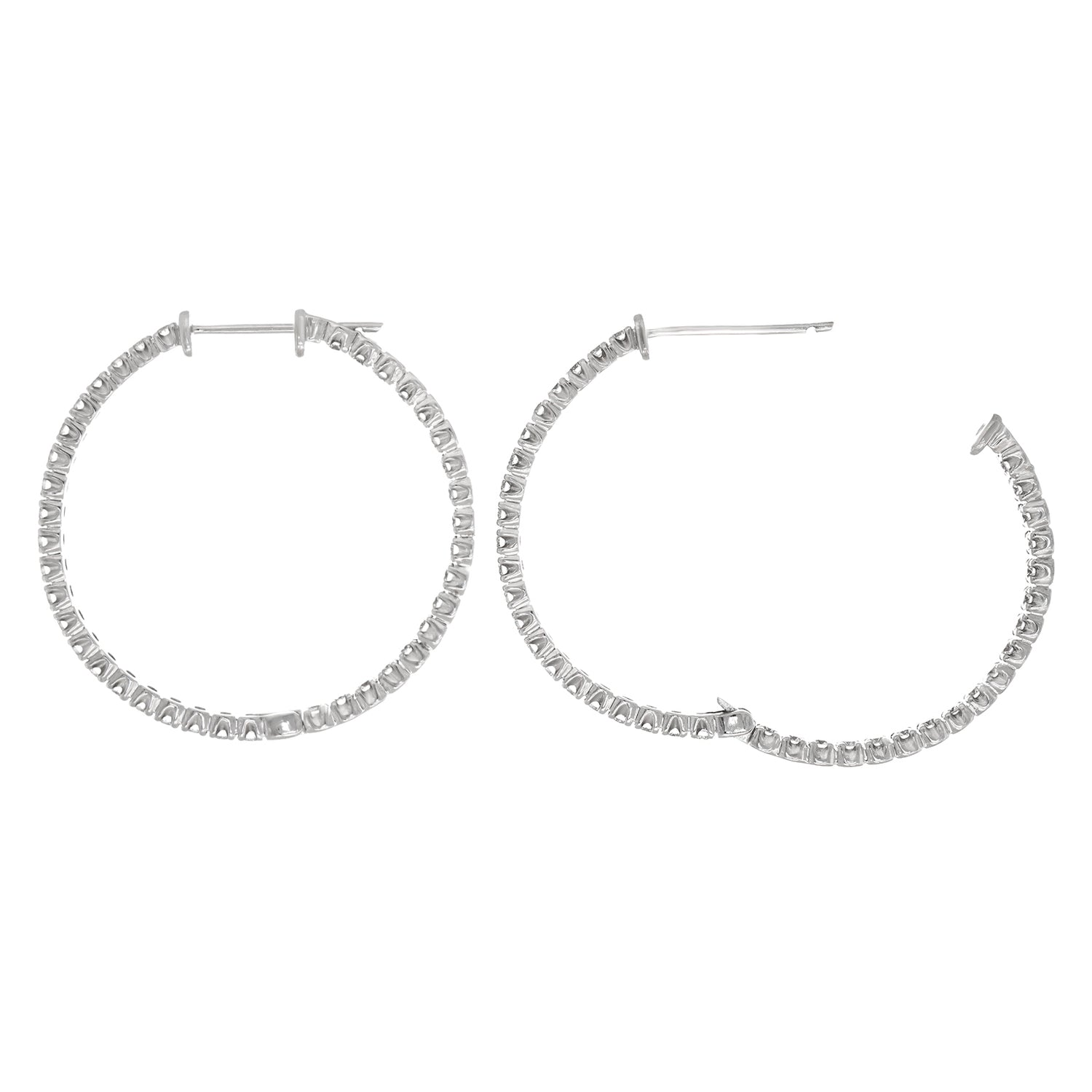 Circa 2005, 18k, by Tiffany & Co., New York. These chic diamond hoops by Tiffany & Co. are all about the diamonds! Set with 2.79 carats of brilliant white diamonds (G color VS clarity), the look is sparkling American girl glamour. At one and a half inches in diameter, they are proportioned perfectly for the ear and grab the attention of the eye tastefully. Excellent condition.