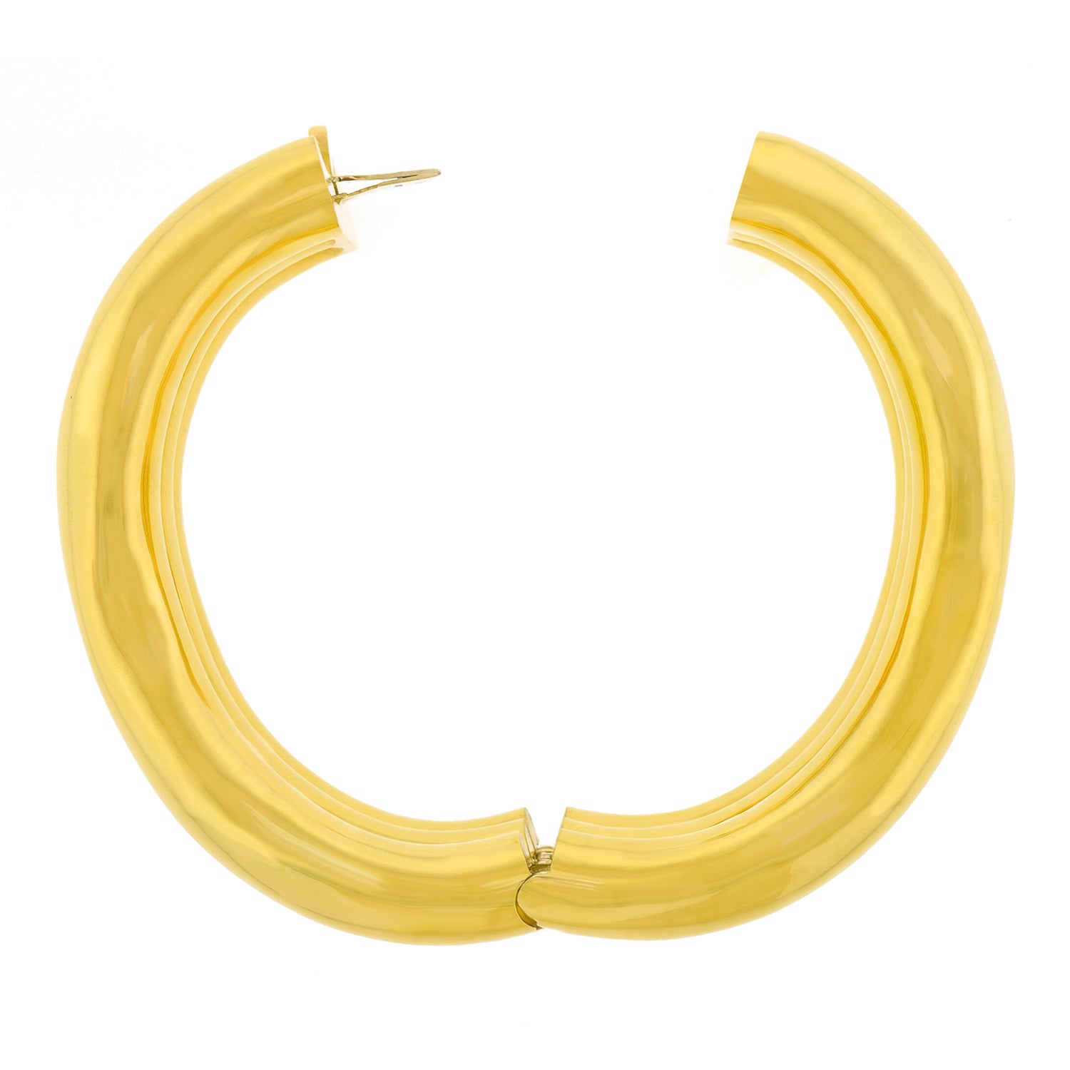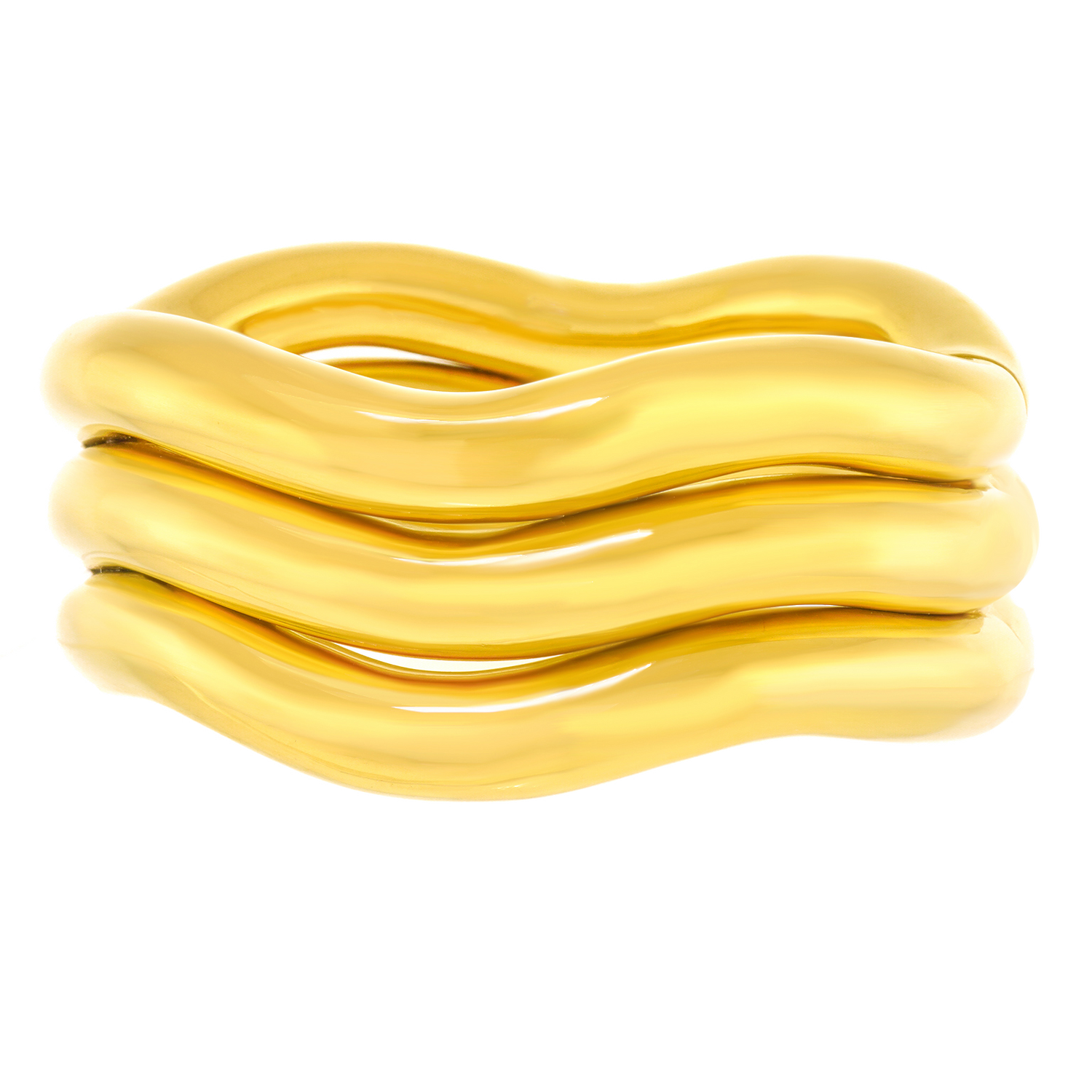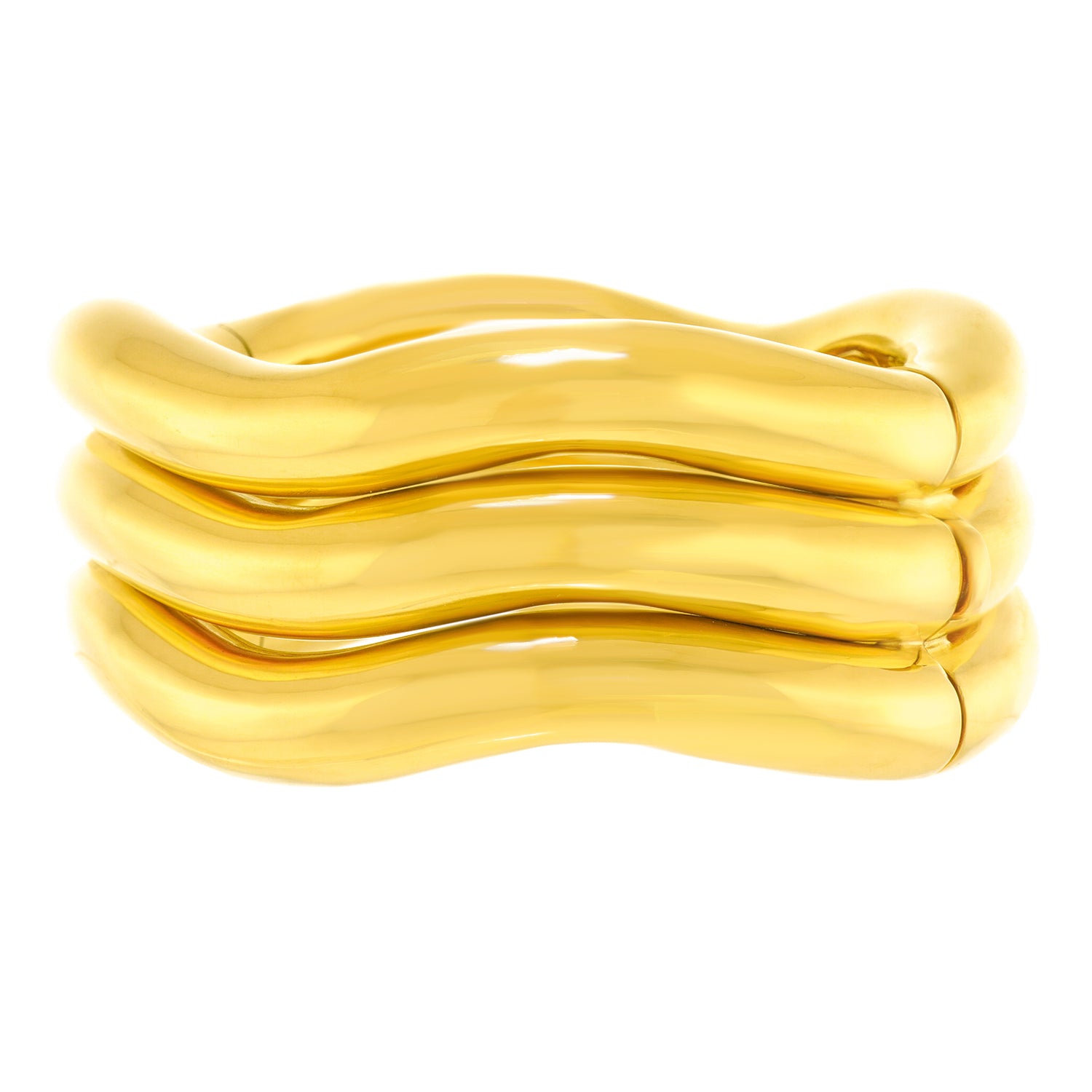 Circa 1970s, 18k, by Tiffany & Co. The bold visual narrative of this bracelet is glamorously American and wildly seventies. In a single brushstroke, the decoration and form are one. Instantly timeless and brilliantly chic, this oversize bangle can be worn every day. Meticulously fabricated, it is in excellent condition.