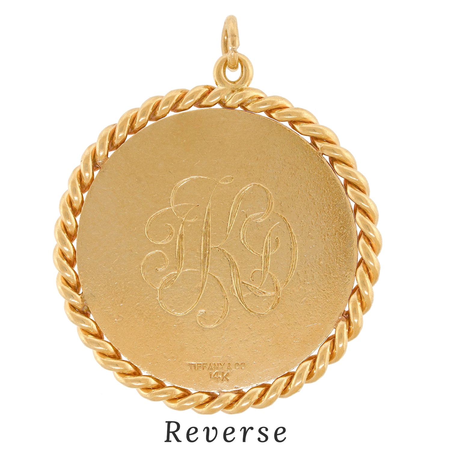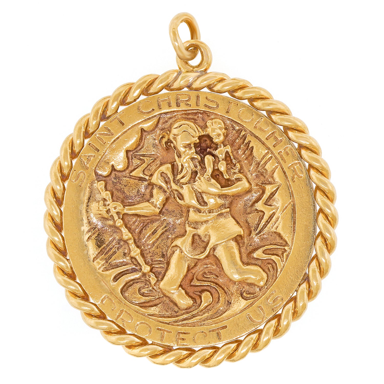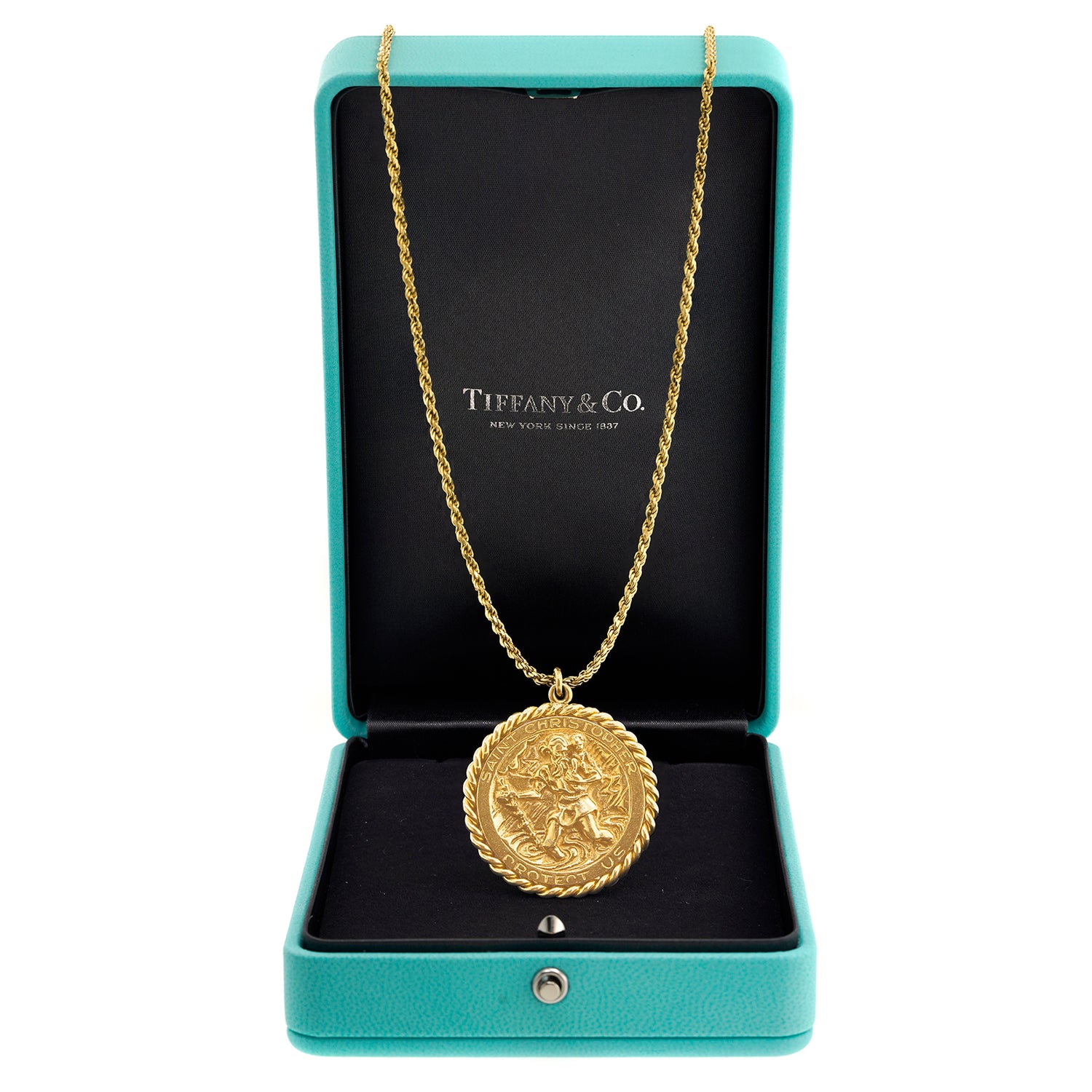 Circa 1950s, 14k, by Tiffany & Co., New York. This 1950s yellow gold Tiffany & Co. St. Christopher medal is a rare find. Not only is this a larger than most versions, it is also a very uncommon design. Engraved on the reverse with initials, it is in very good condition.