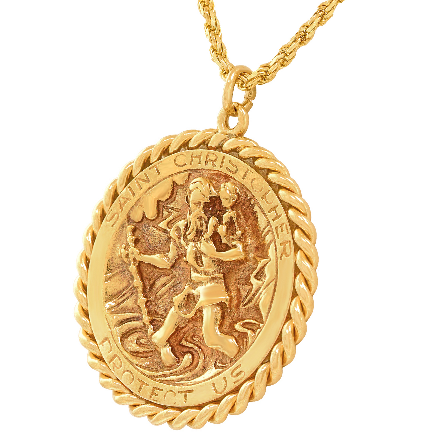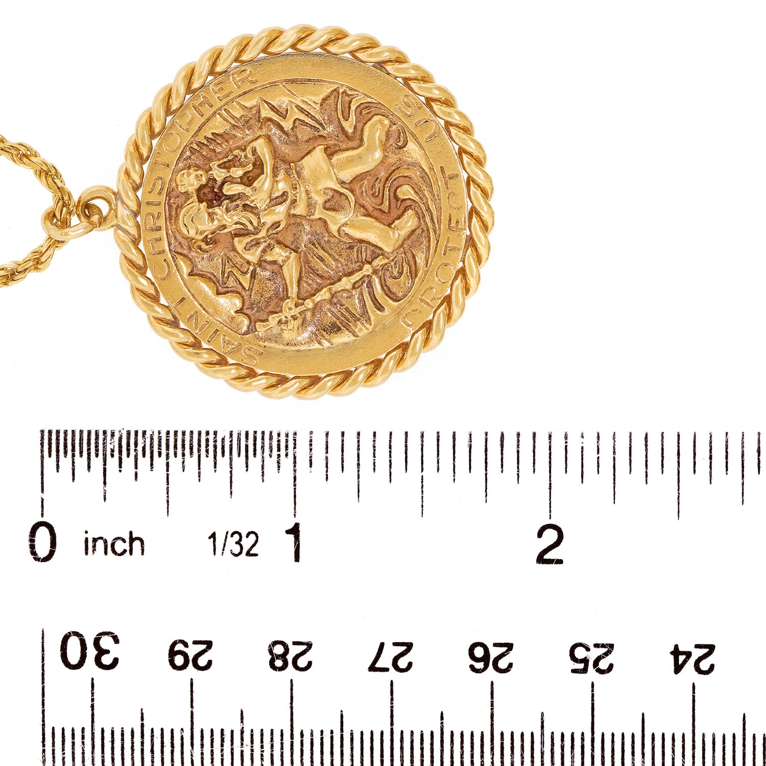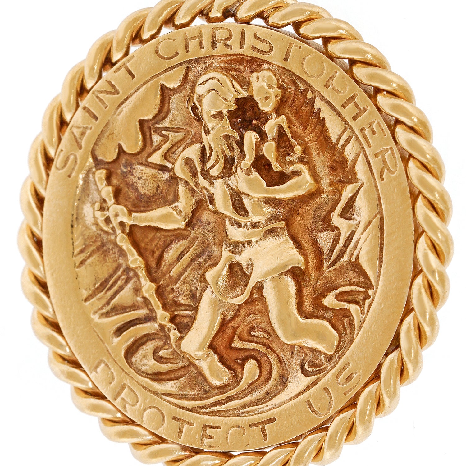 Circa 1950s, 14k, by Tiffany & Co., New York. This 1950s yellow gold Tiffany & Co. St. Christopher medal is a rare find. Not only is this a larger than most versions, it is also a very uncommon design. Engraved on the reverse with initials, it is in very good condition.
