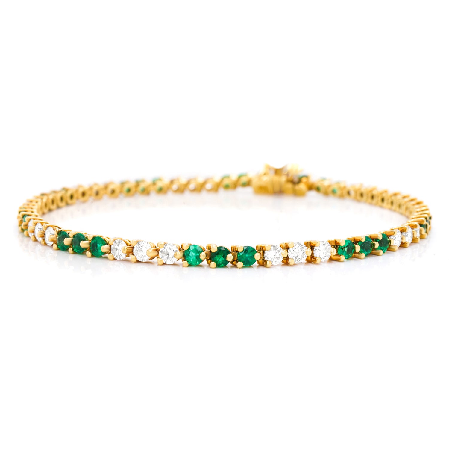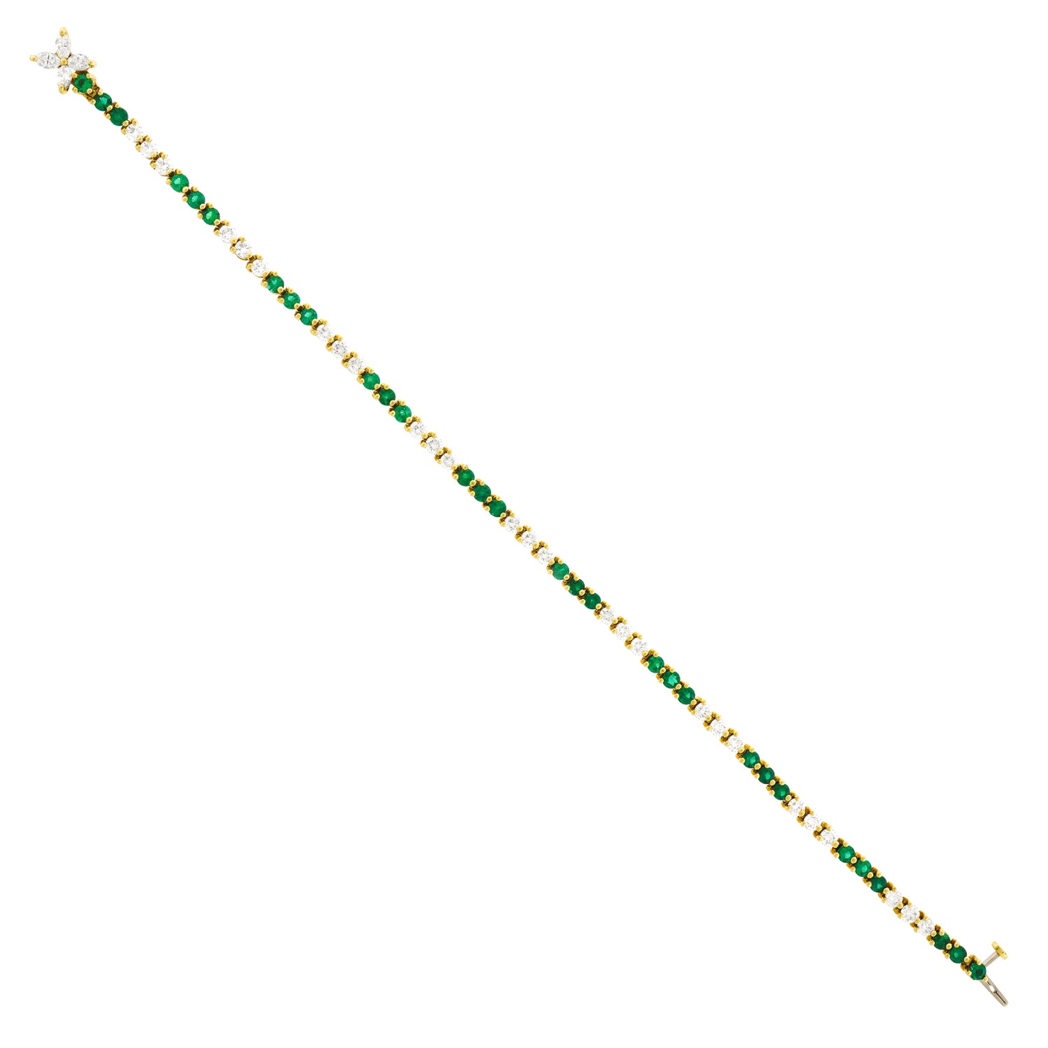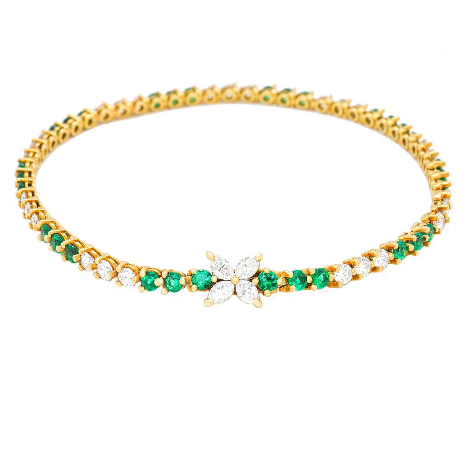 Circa 1990s, 18k, by Tiffany & Co., New York. This classic Tiffany Victoria bracelet features 1.70 carats of fine white diamonds (G color, VS clarity), and 1.20 carats of gorgeous bright green emeralds. Finely fabricated in eighteen-karat yellow gold, this timeless jewel is in excellent condition.