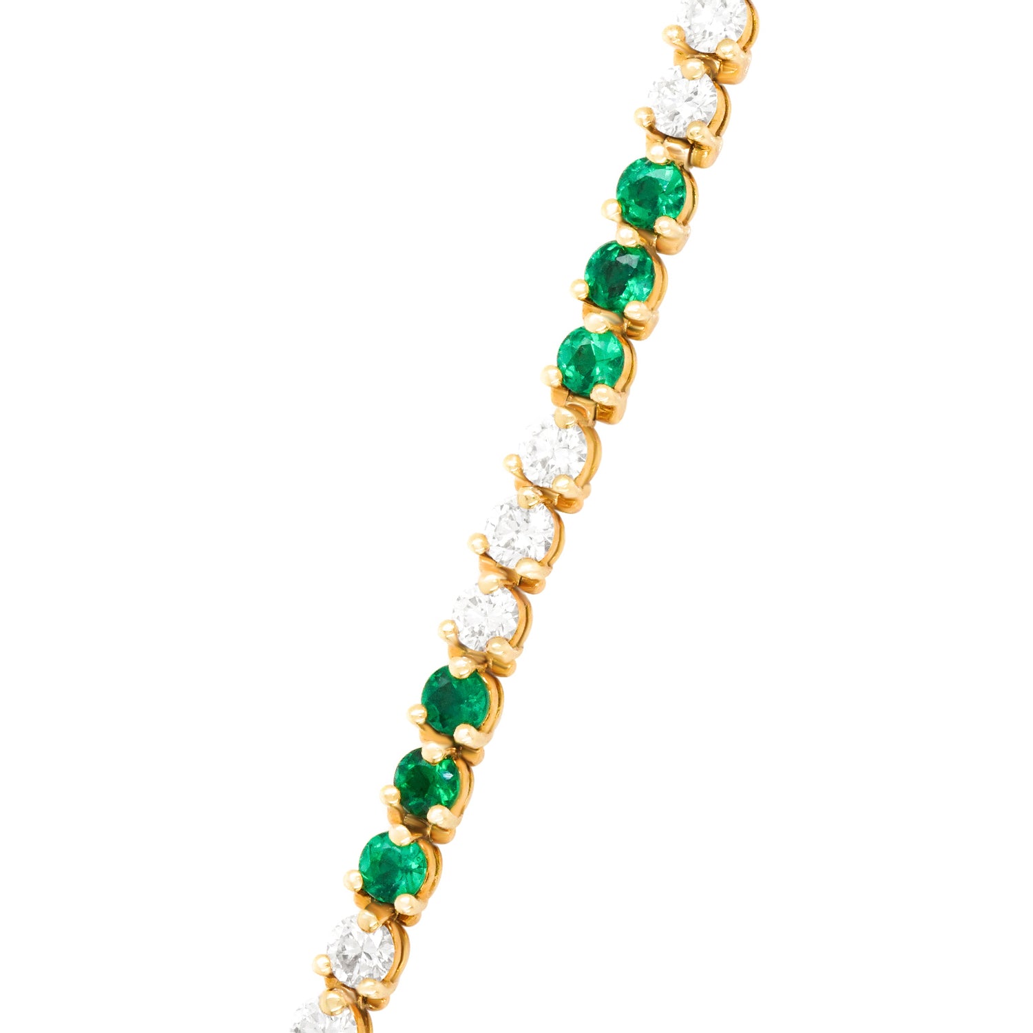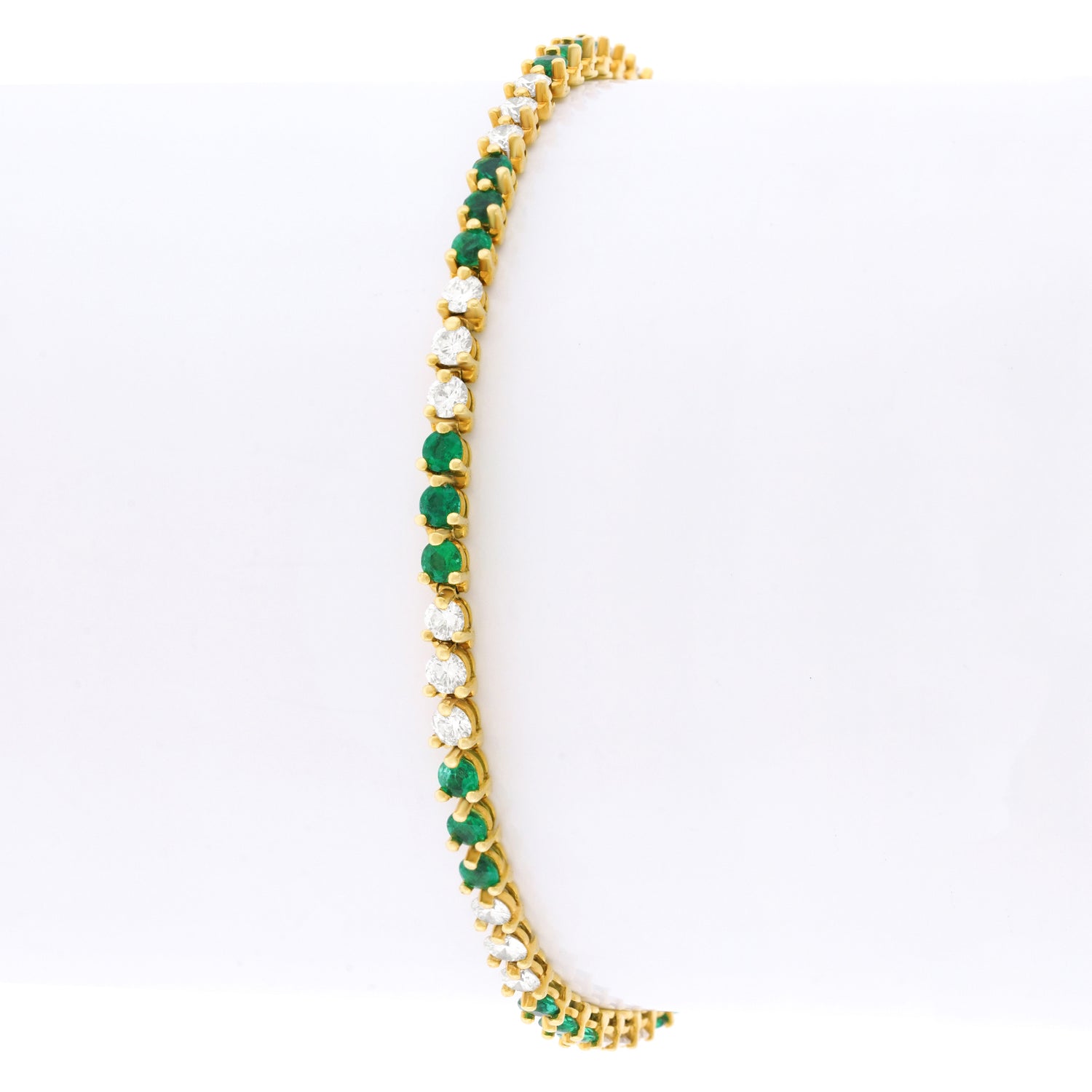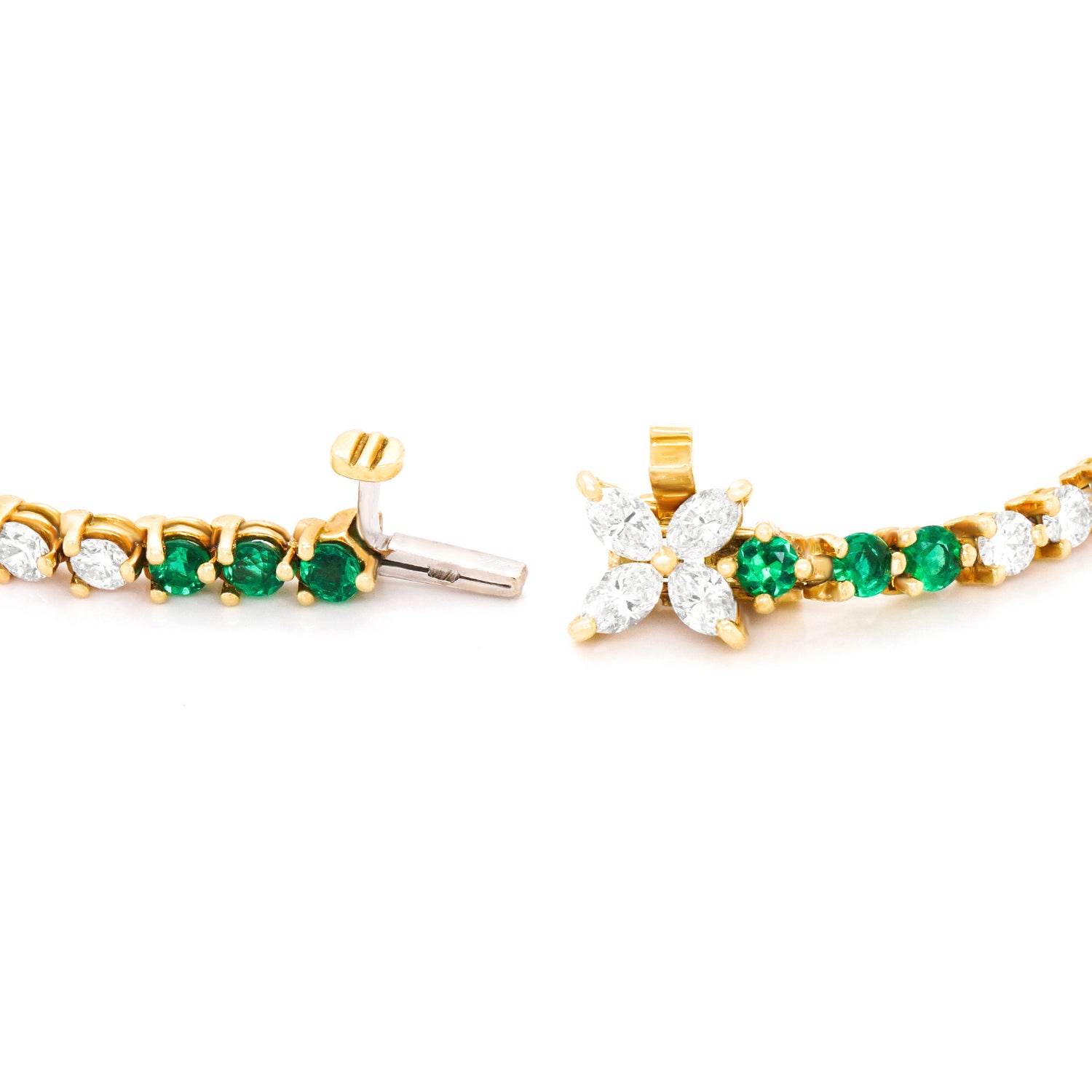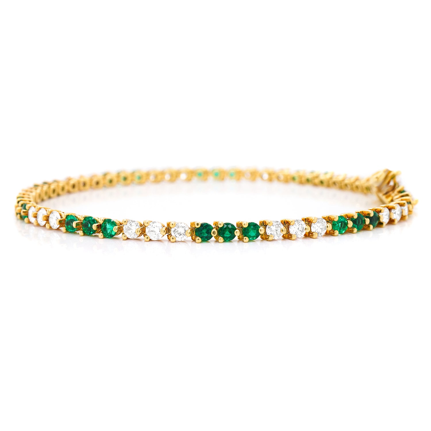 Circa 1990s, 18k, by Tiffany & Co., New York. This classic Tiffany Victoria bracelet features 1.70 carats of fine white diamonds (G color, VS clarity), and 1.20 carats of gorgeous bright green emeralds. Finely fabricated in eighteen-karat yellow gold, this timeless jewel is in excellent condition.