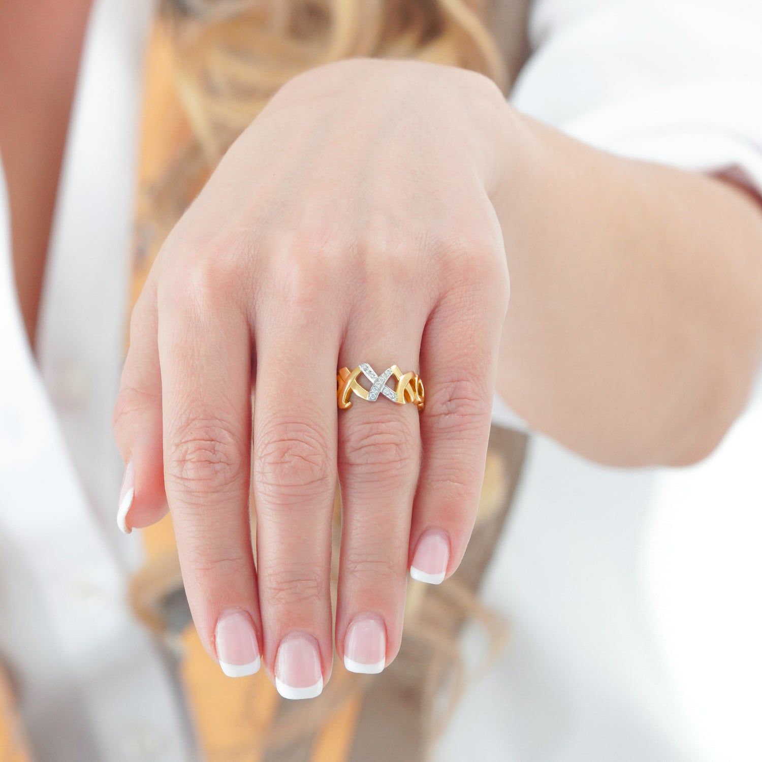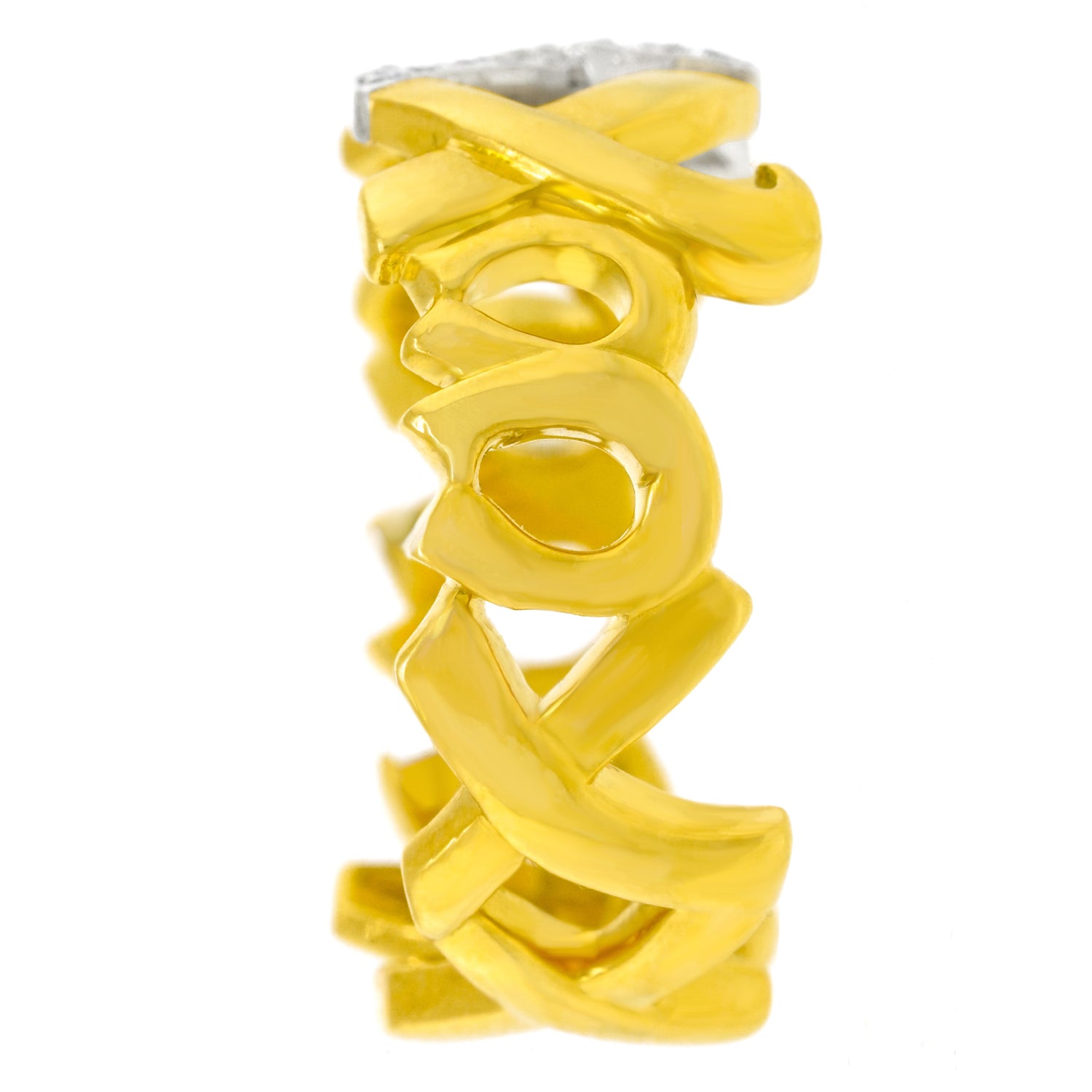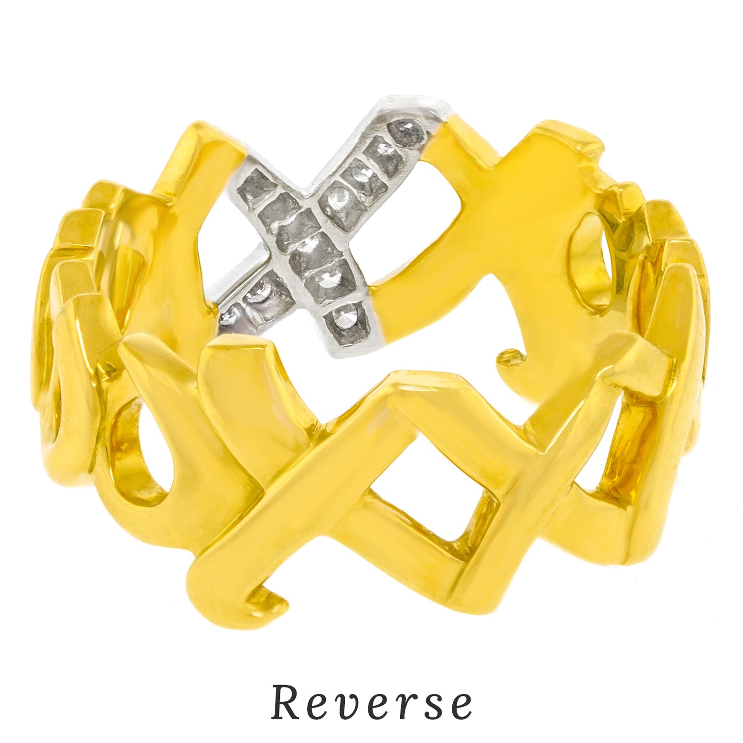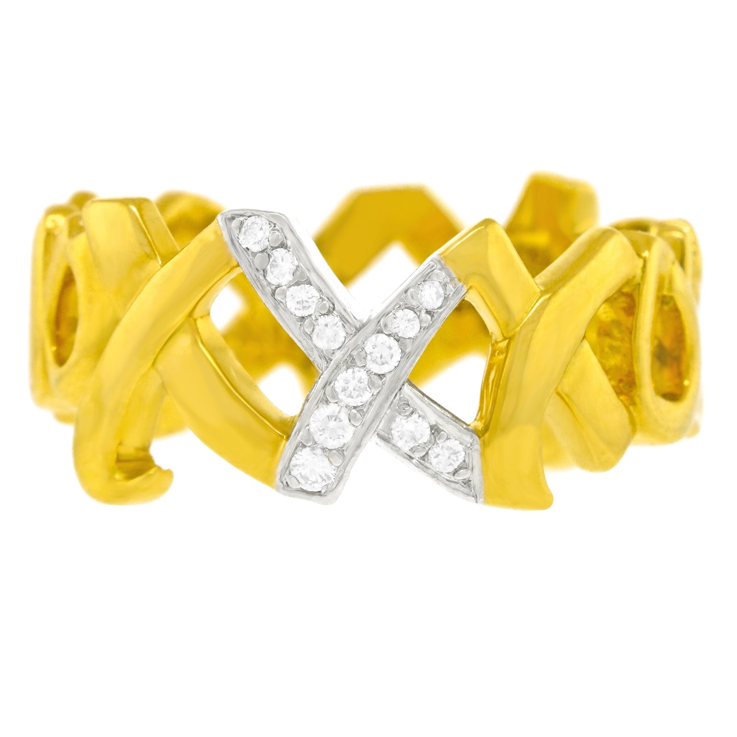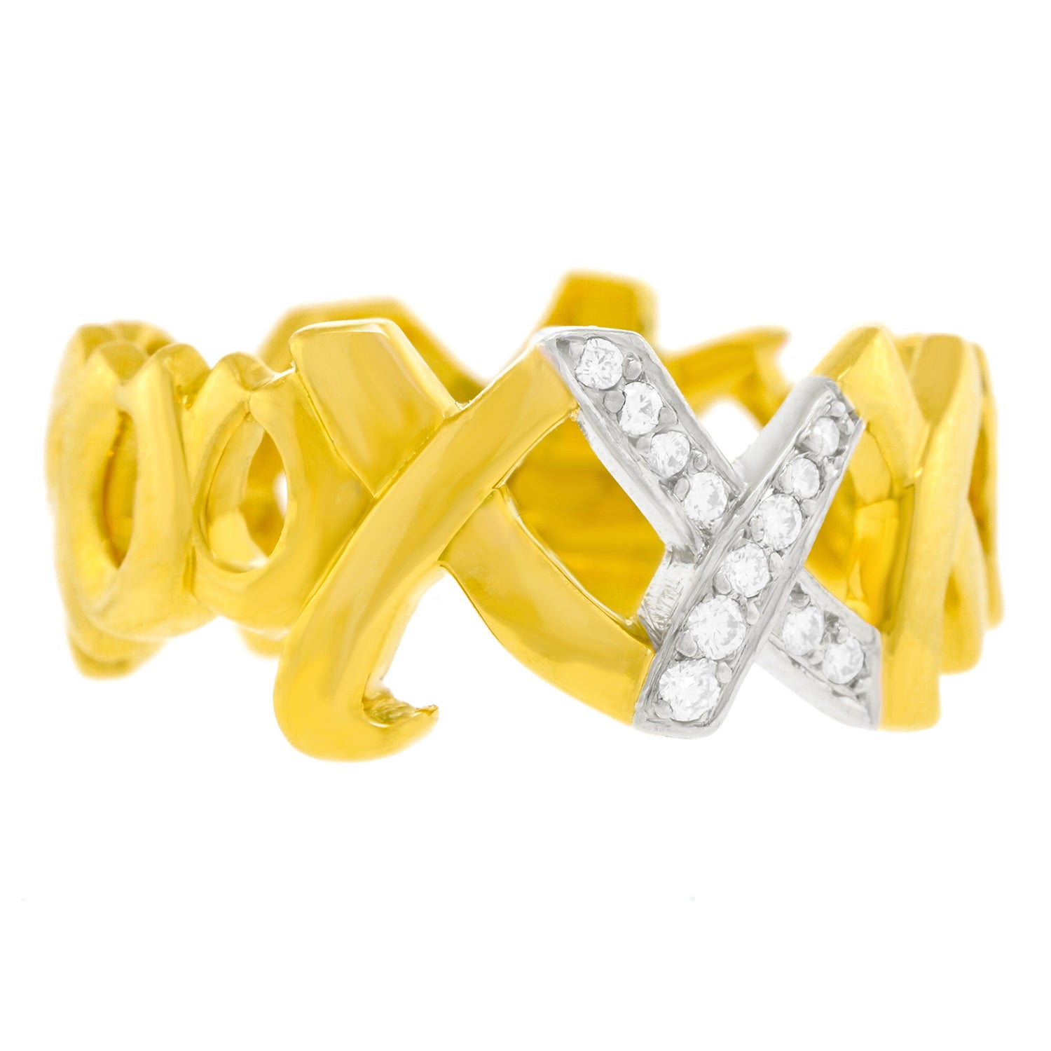 Circa 1980-90s, 18k/platinum, by Paloma Picasso for Tiffany & Co.  This playful version of the iconic X's and O's ring by Paloma Picasso for Tiffany features platinum and diamond detail. Much rarer (and originally more expensive) than its all-gold sister, this is the deluxe model. The diamonds are very white and sparkly and the construction is superior. Excellent condition.