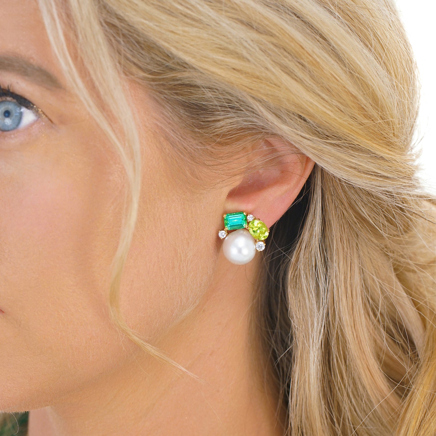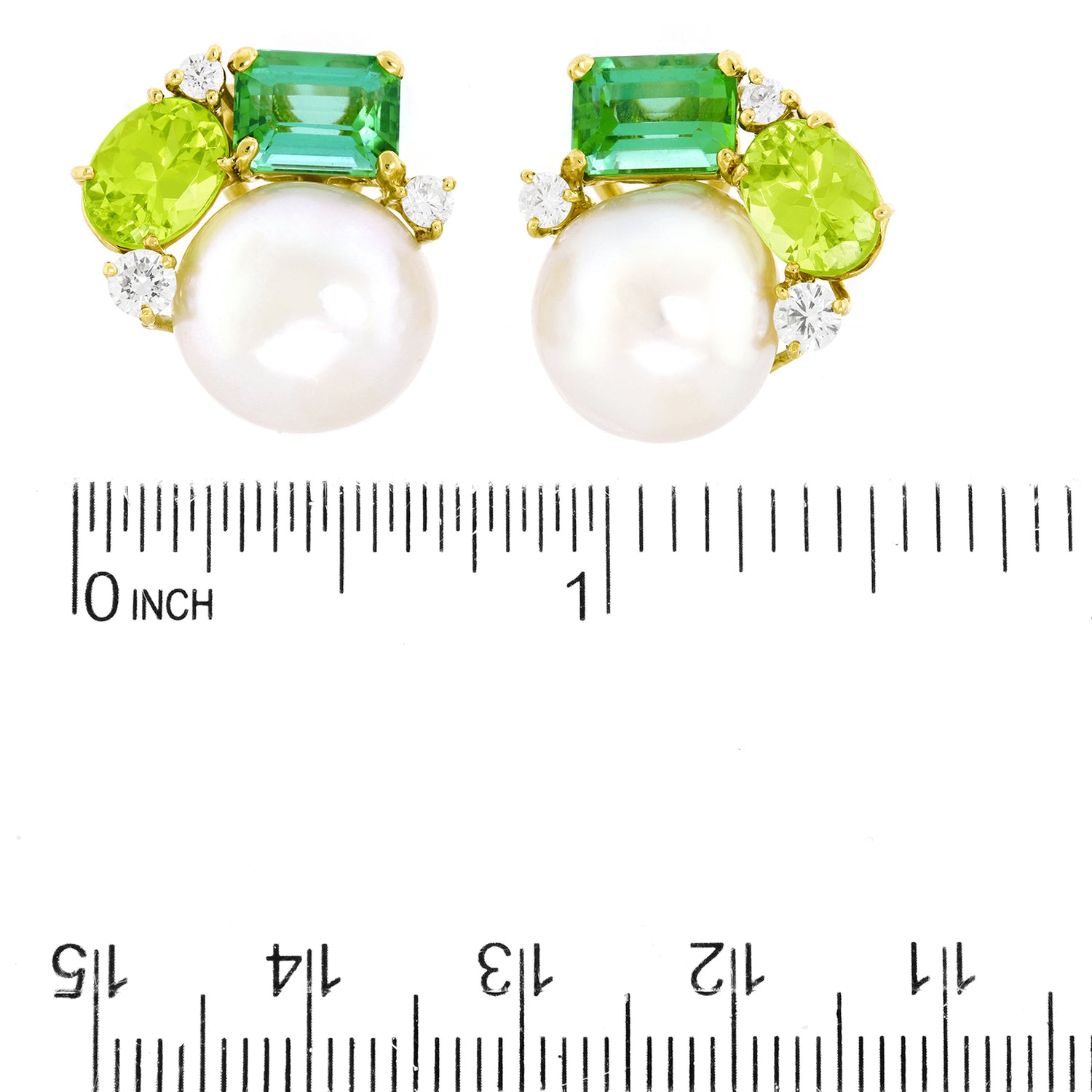 Circa 1980s, 18k, American. These colorful earrings are simply gorgeous! The design is contemporary and the look classic. Set with tourmaline, peridot, diamonds, and pearls, they are glamorously chic, delightfully colorful, and visually fresh. Superbly fabricated, these American earrings are in excellent condition.