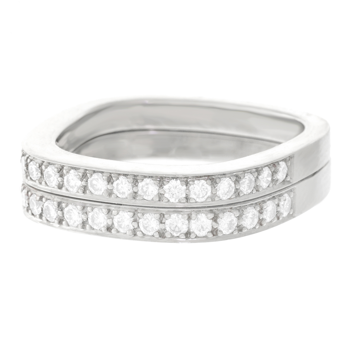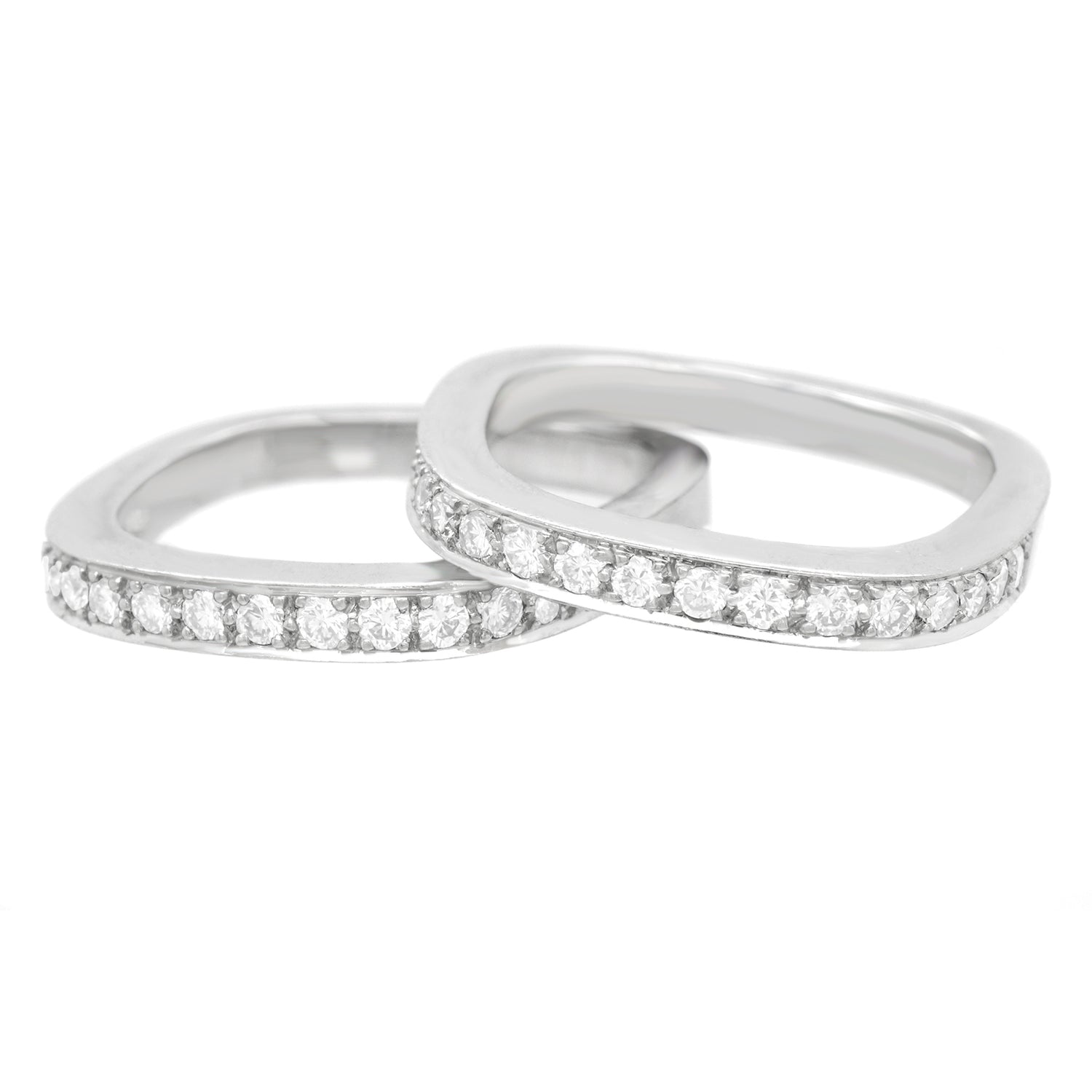 Circa 1970s, 18k, by Trudel, Zurich Switzerland. This pair of square-shaped rings are set with .64 carats of impeccable, brilliant white diamonds (F color, VS clarity). Replete in their elegant postmodern idiom, the pair is visually arresting and smartly au courant. From the renowned Zurich firm, Trudel, they are sleek, fun, and easy to wear. Excellent condition.