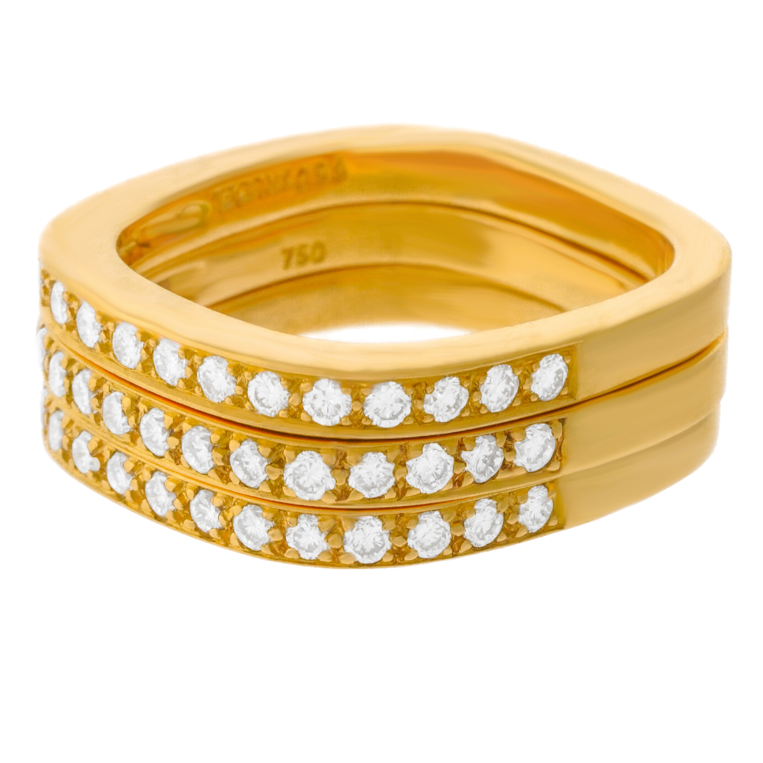 Circa 1970s, 18k, by Trudel, Zurich Switzerland.  This trio of square-shaped rings is set with .96 carats of impeccable, brilliant white diamonds (F color, VS clarity). Replete in their elegant postmodern idiom, the group is visually arresting and smartly au courant.  From the renowned Zurich firm, Trudel, they are sleek, fun, and easy to wear. Excellent condition.