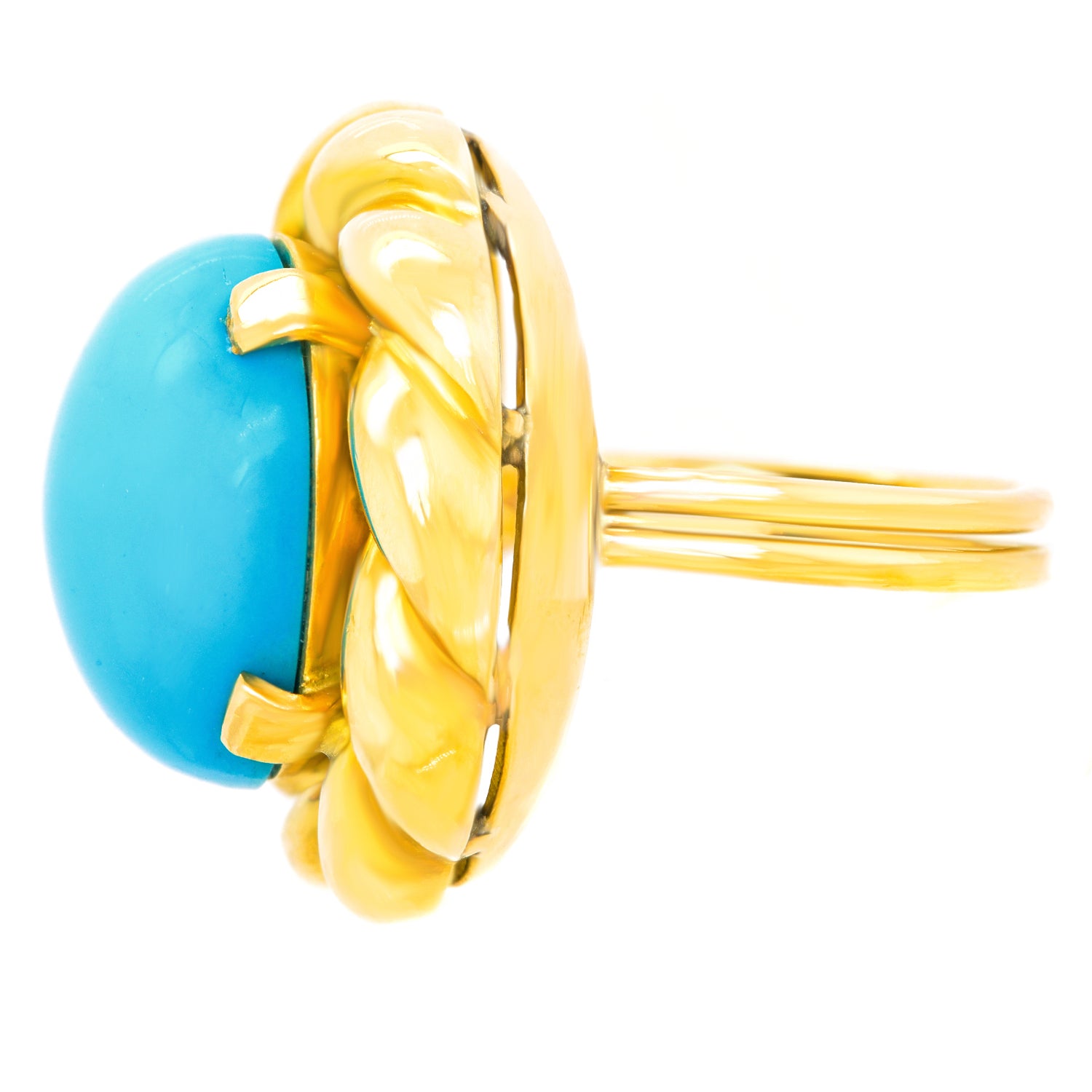 Circa 1970s, 14k, American. Unapologetically bold, this yellow gold ring, with its huge turquoise surrounded by an oversized cable twist decoration, is seventies chic at its vintage best. The intense robin's egg blue turquoise is perfect for signature style. Well made, it is in excellent condition.