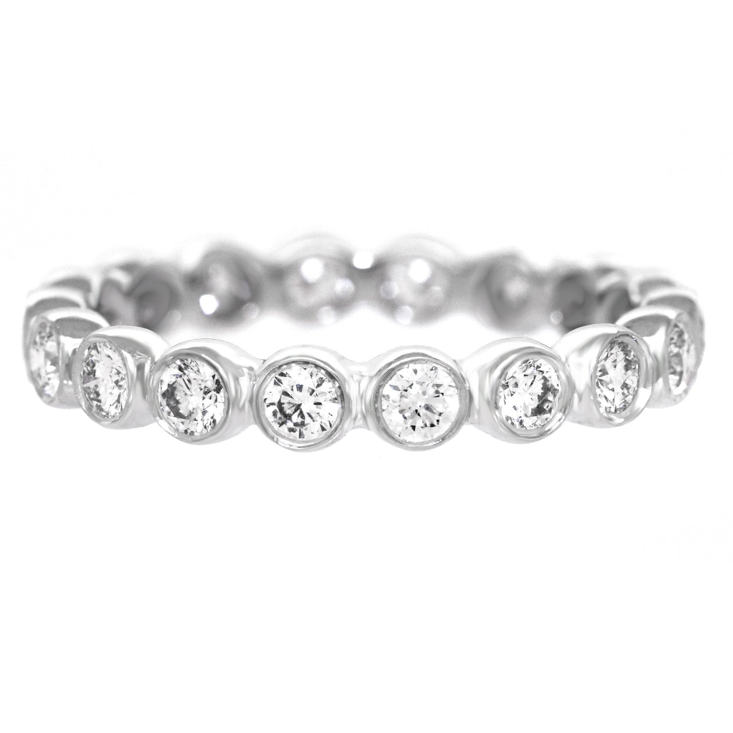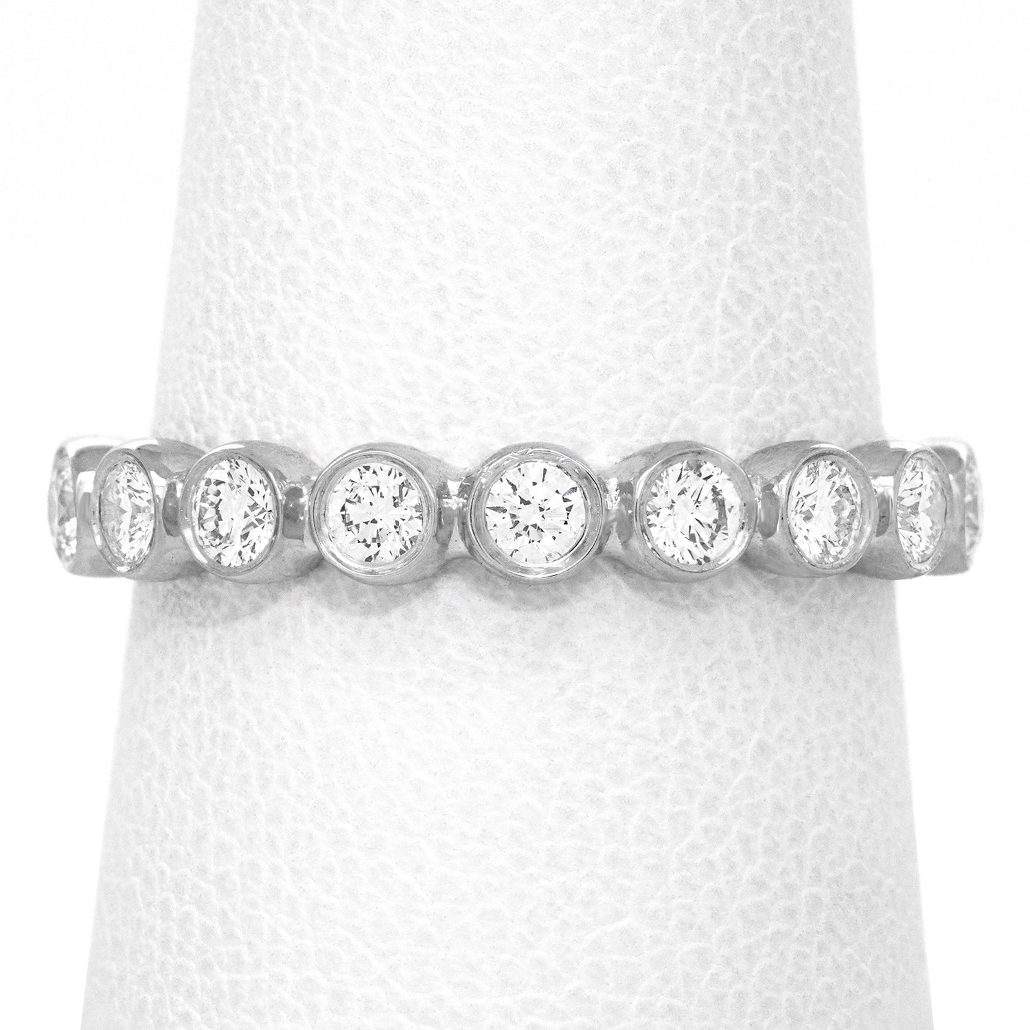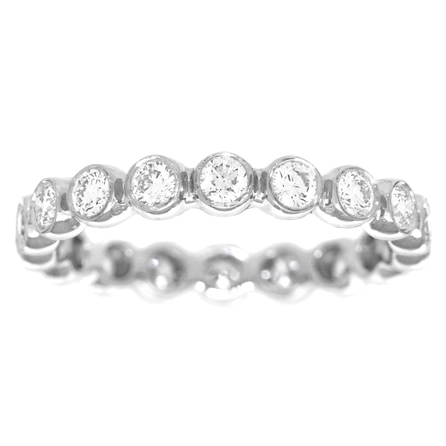 Circa 2000s, Platinum, American. This chic eternity band features .90 carats of fine white diamonds (H color, SI1 clarity) individually bezel-set in platinum. Perfect on its own, brilliant in a stack, and unique as a wedding band, this ring is in excellent condition.
