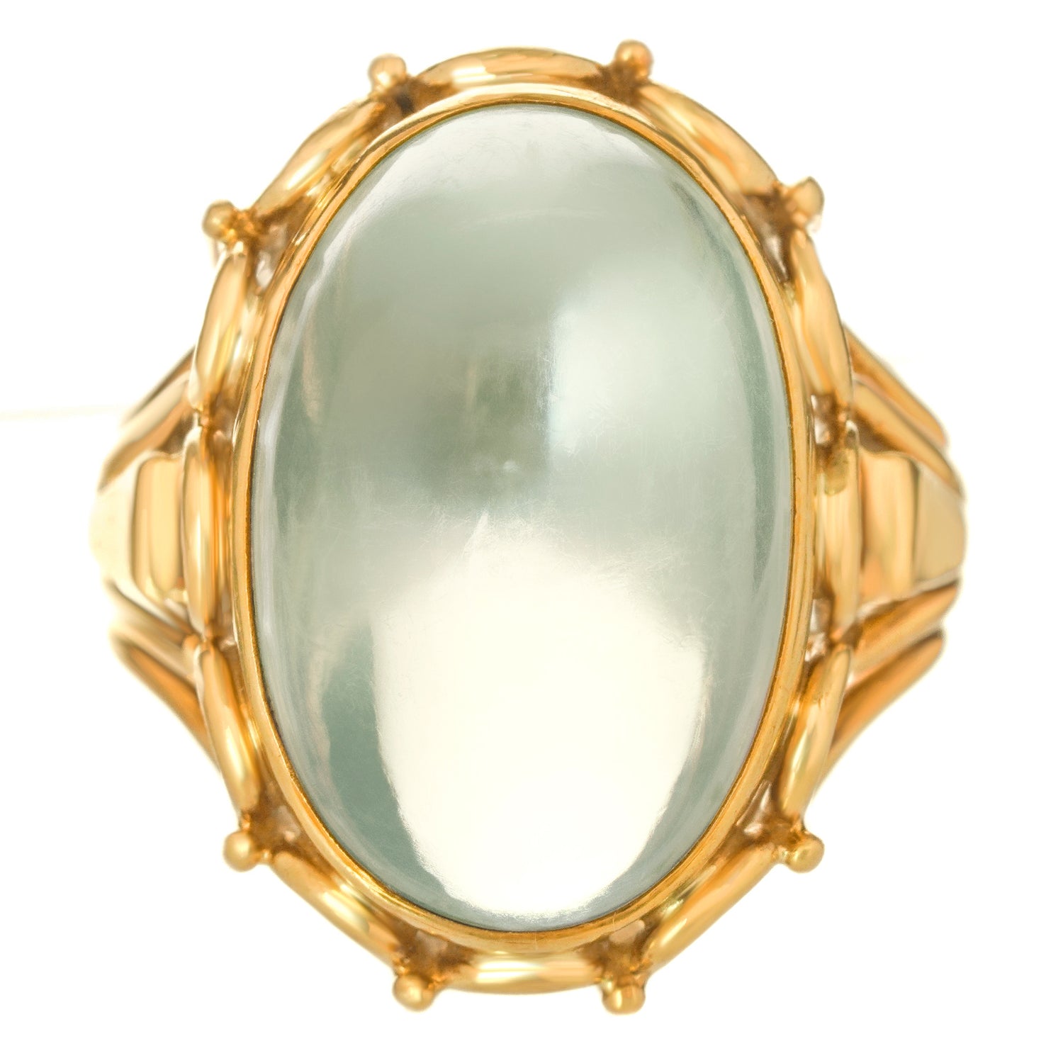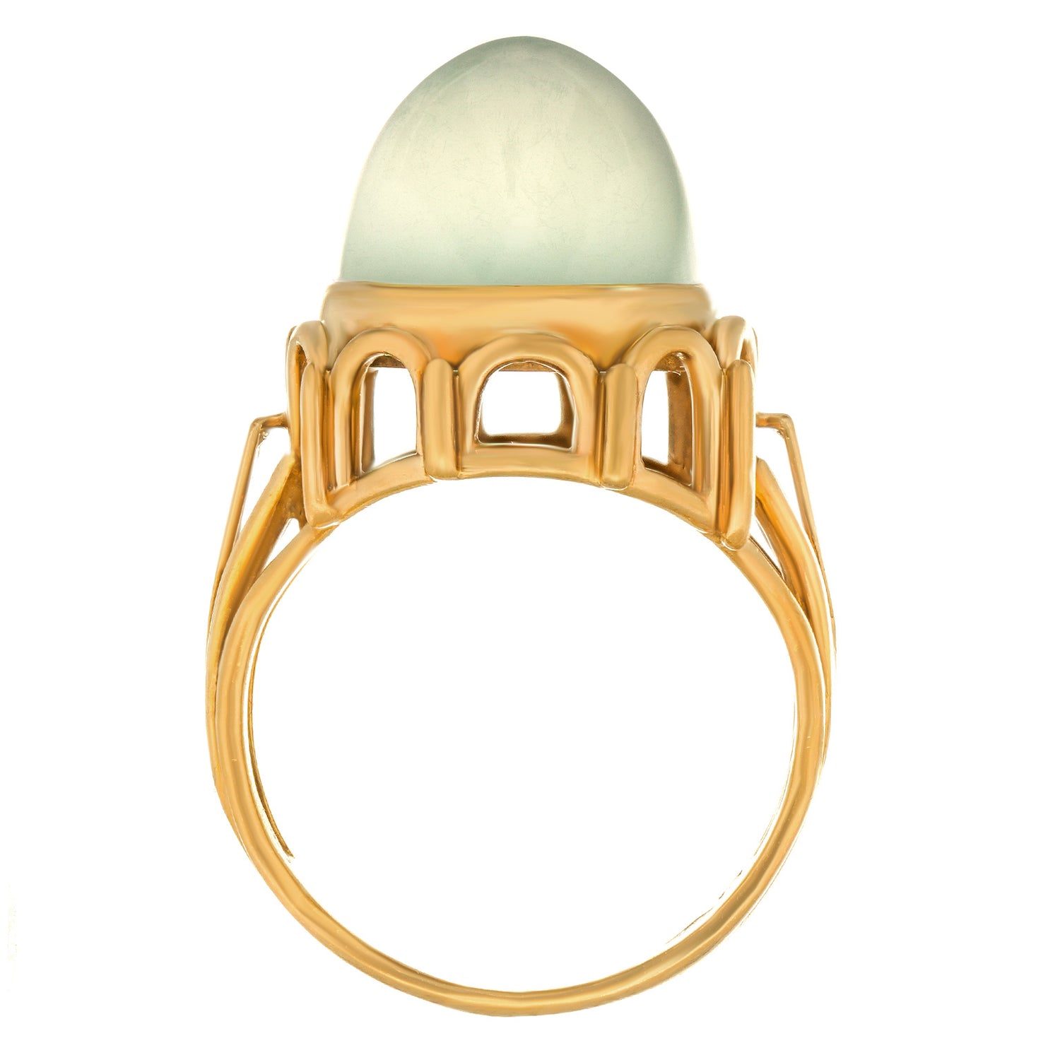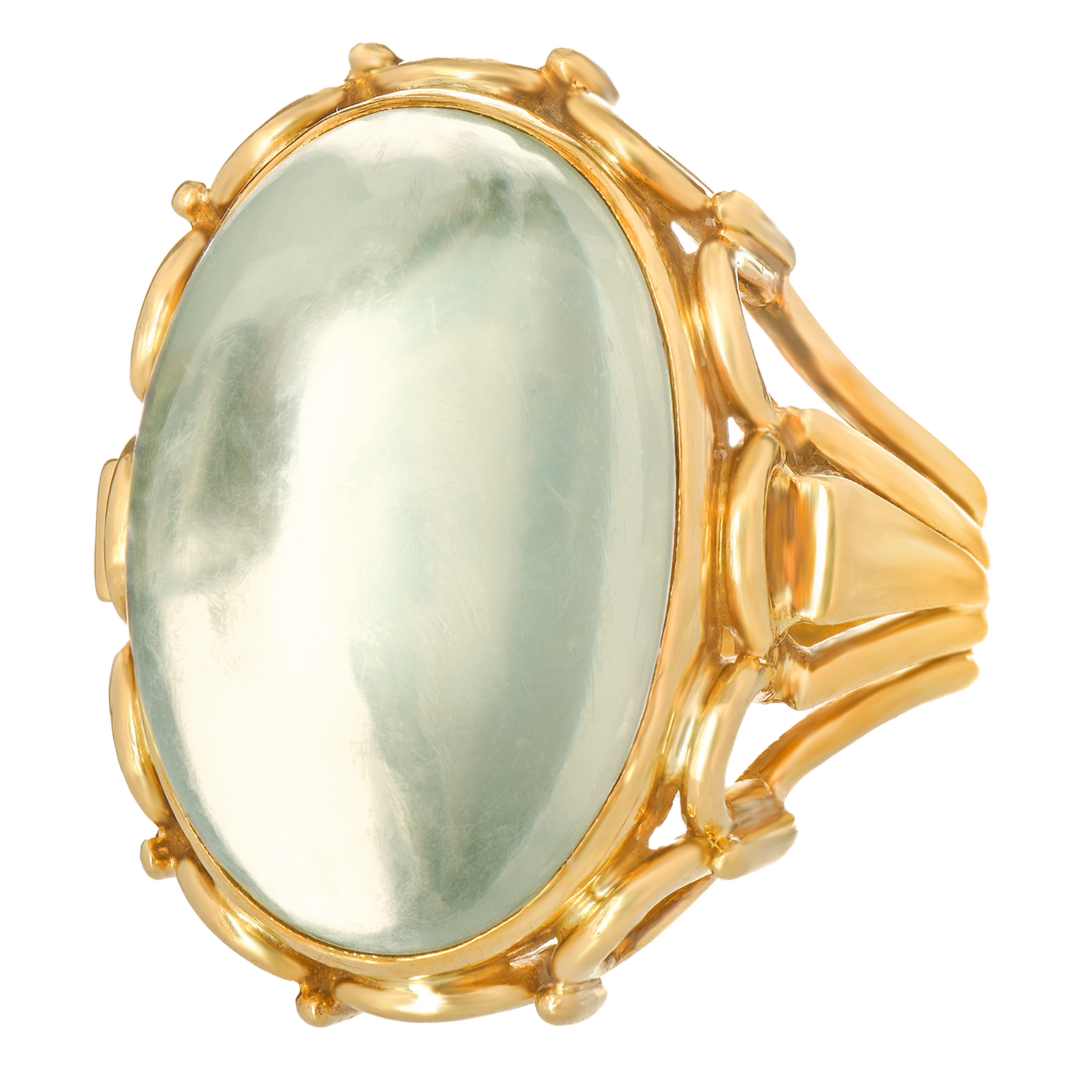 Circa 1950s, 18k, by Vacheron Constantin, Geneve, Switzerland. With an emphasis on modernity and unusual stones, Vacheron's jewelry is tastefully edgy. This chic fifties ring by the renowned house is set with a mesmerizing 15-carat delicately hued green moonstone. The gallery is beautifully made; its design reminiscent of the secessionist style. Excellent condition.