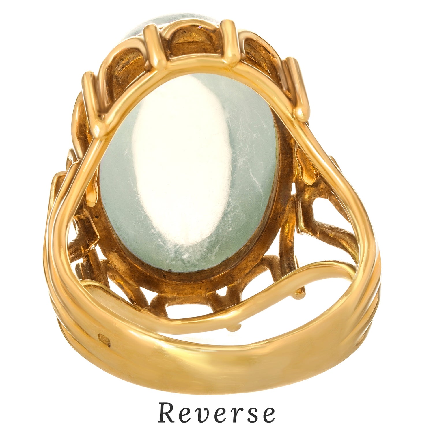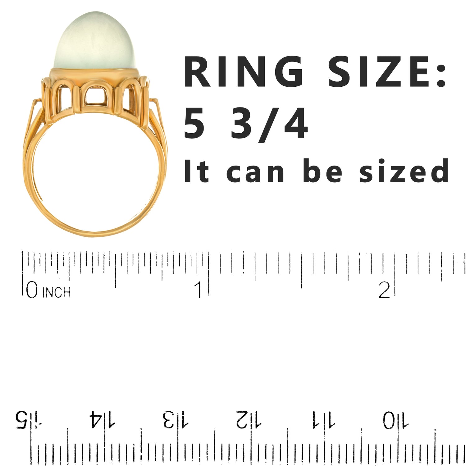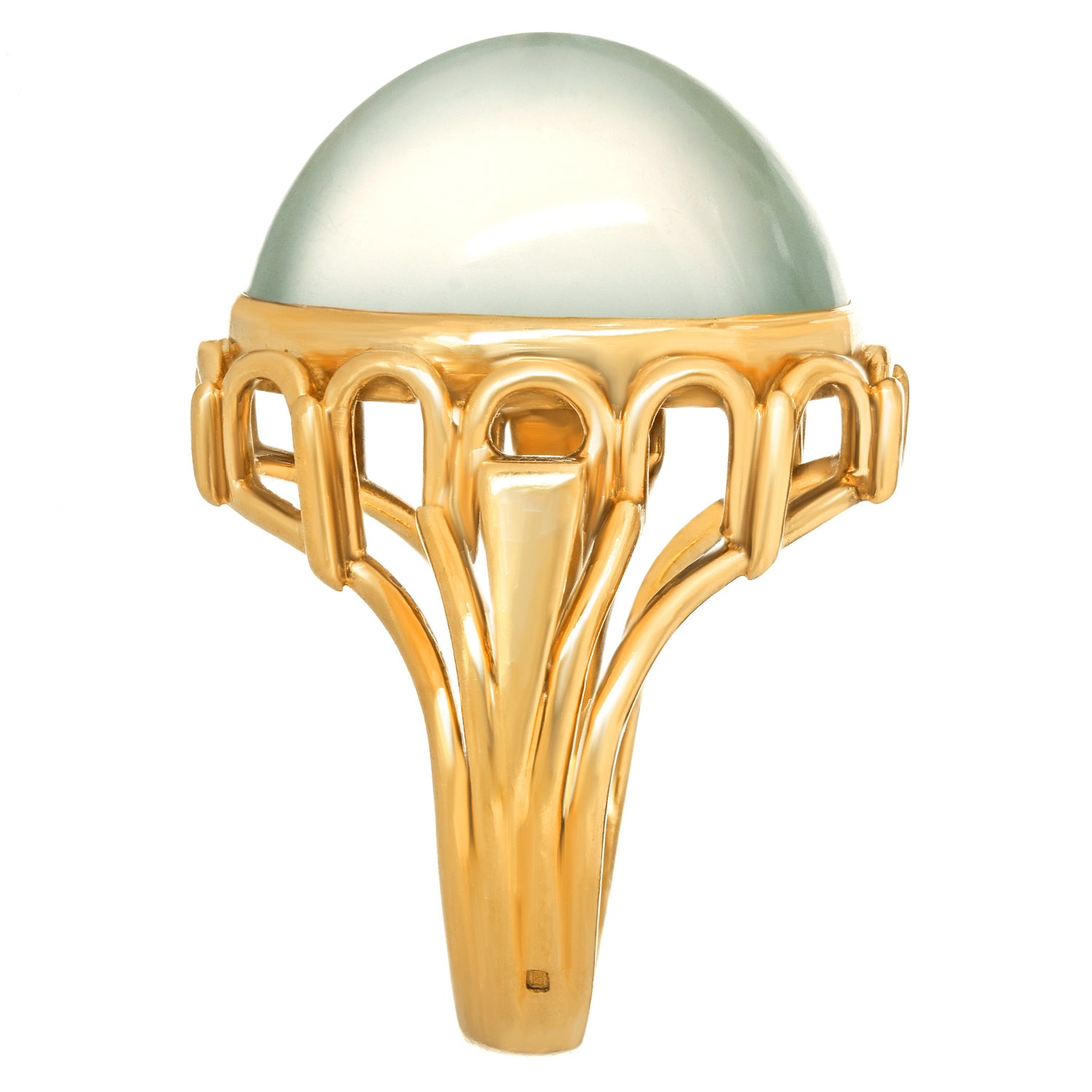 Circa 1950s, 18k, by Vacheron Constantin, Geneve, Switzerland. With an emphasis on modernity and unusual stones, Vacheron's jewelry is tastefully edgy. This chic fifties ring by the renowned house is set with a mesmerizing 15-carat delicately hued green moonstone. The gallery is beautifully made; its design reminiscent of the secessionist style. Excellent condition.
