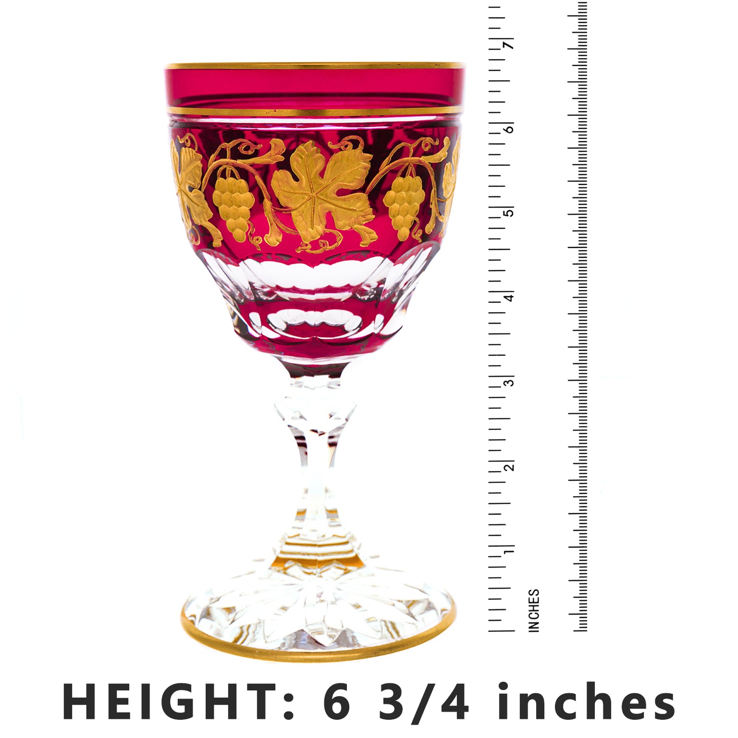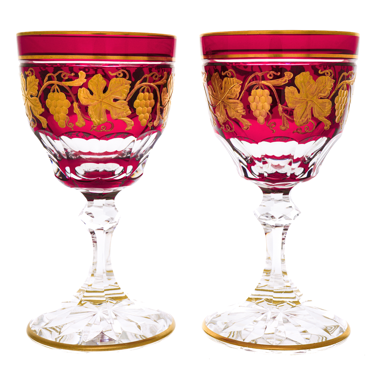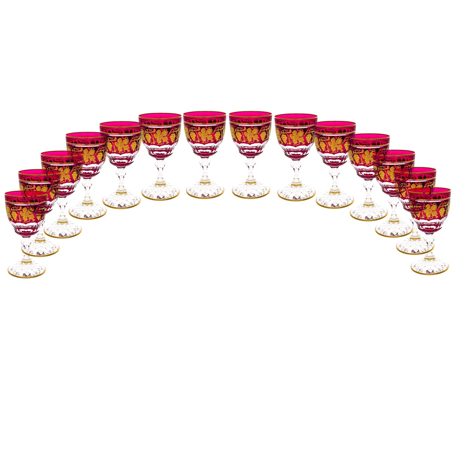 Circa 1950s, by Val St. Lambert, Belgium. Presented is a set of fourteen ruby cut-to-clear and gilded water glasses in the celebrated Pampre D'Or pattern, these are a rare variant.  Excellent condition.