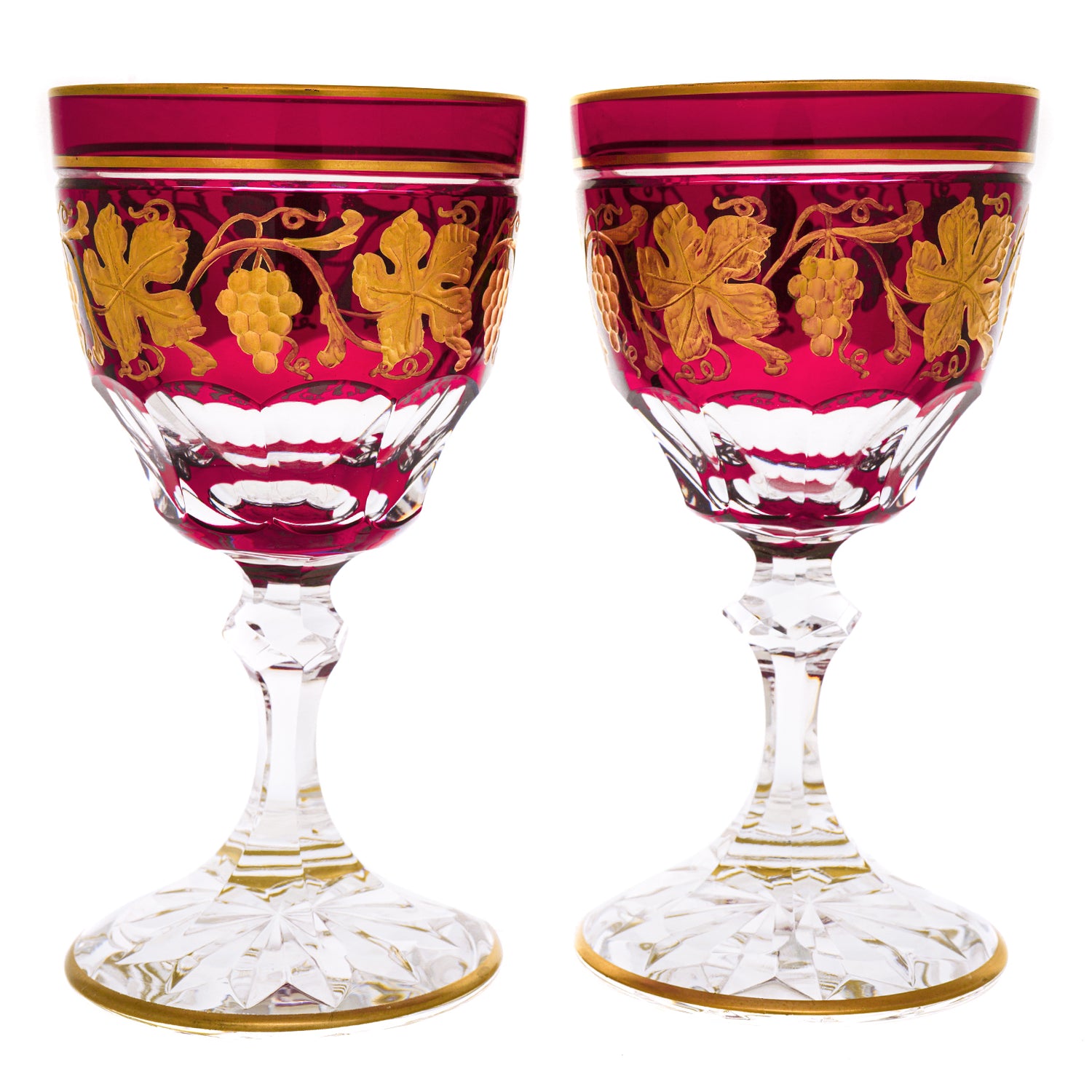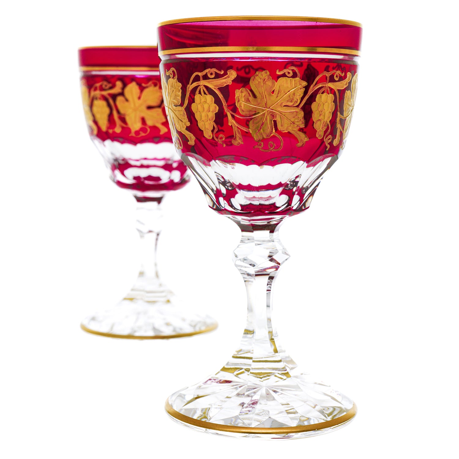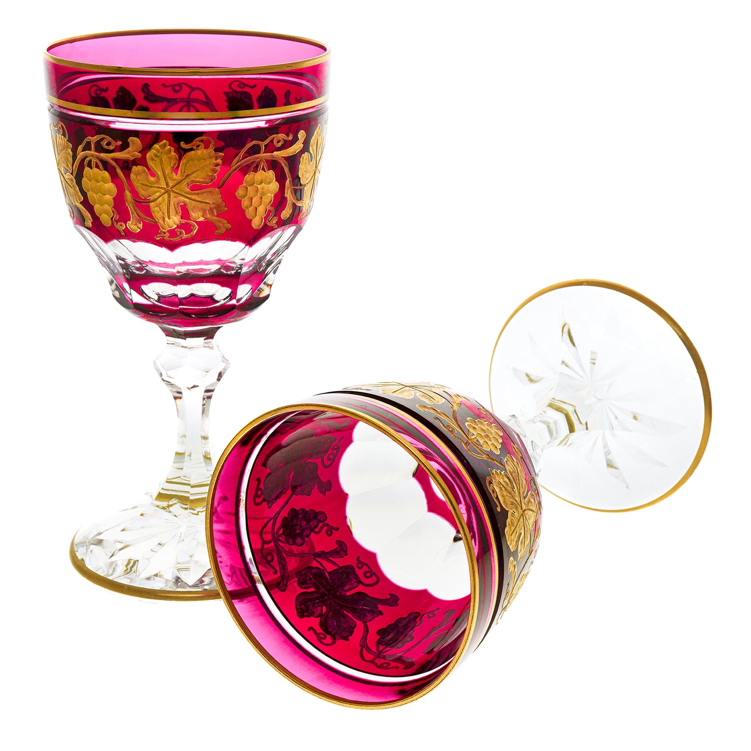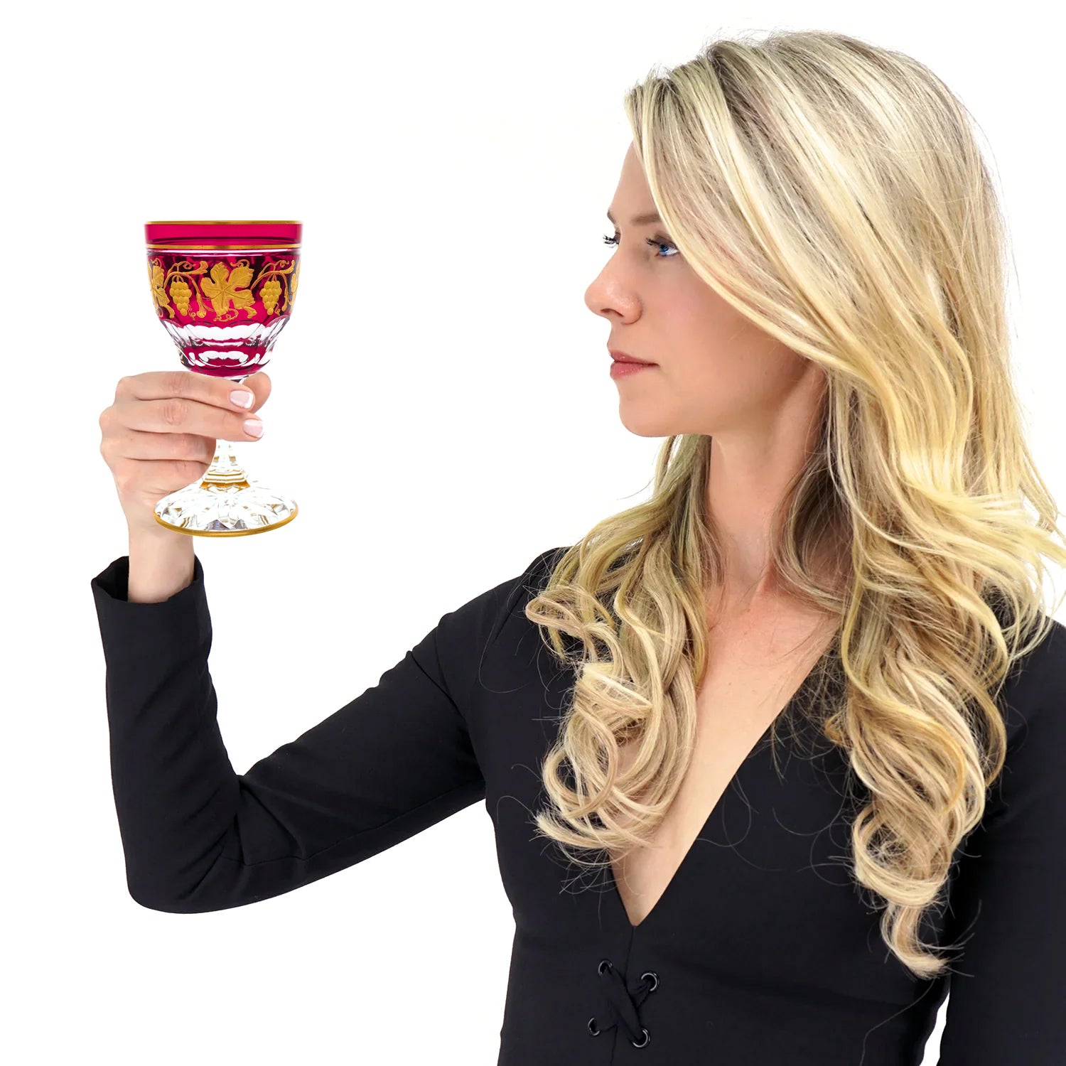 Circa 1950s, by Val St. Lambert, Belgium. Presented is a set of fourteen ruby cut-to-clear and gilded water glasses in the celebrated Pampre D'Or pattern, these are a rare variant.  Excellent condition.