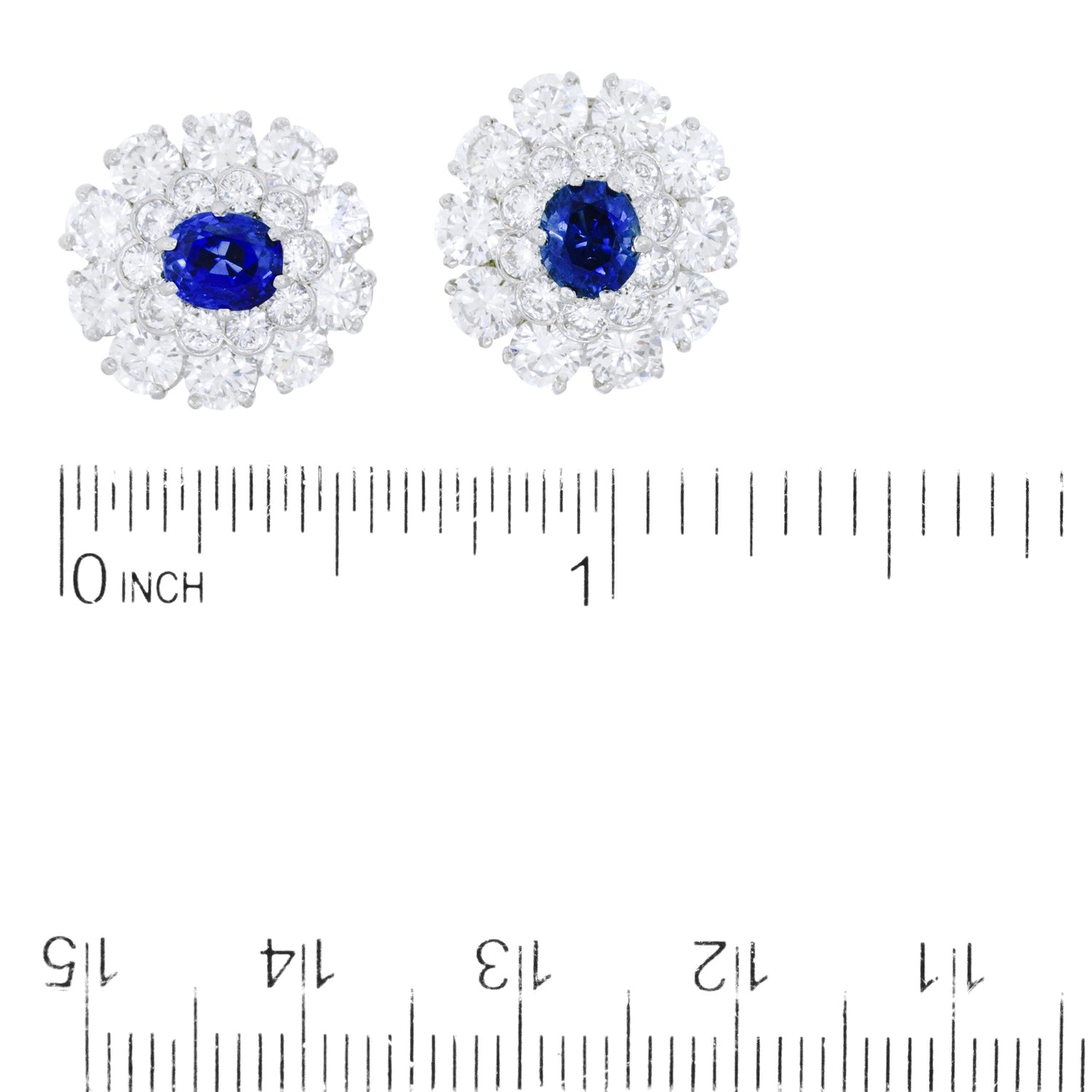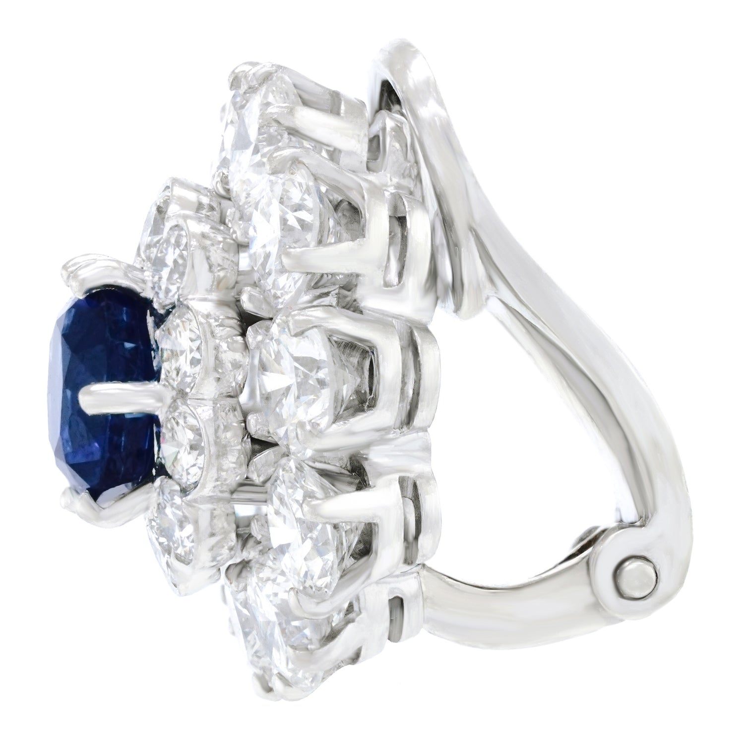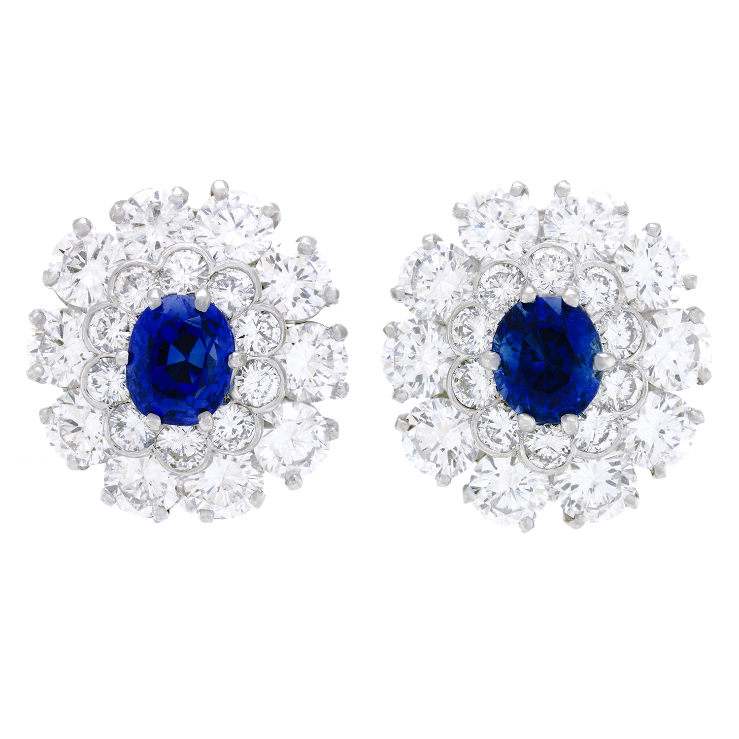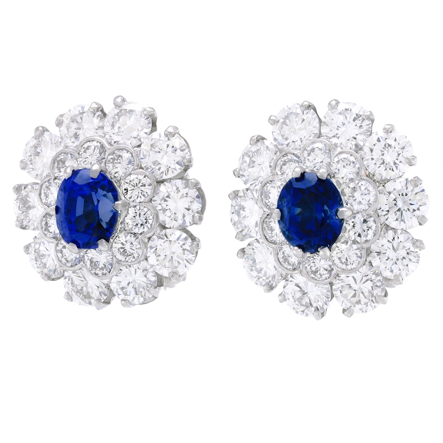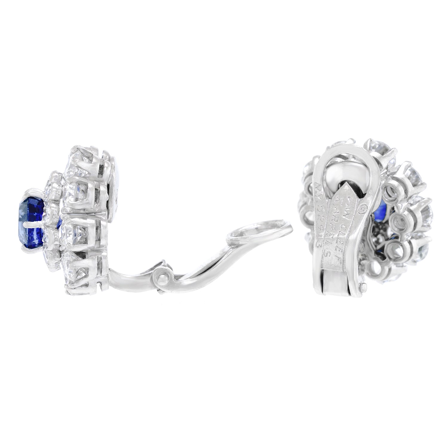 Circa 1960s, platinum, by Van Cleef & Arpels, New York. Van Cleef & Arpels has an aesthetic vision that begins at fabulous and knows no bounds. The bright white diamonds (F color VS clarity) in these sublime earrings are the perfect companion for the gorgeous blue sapphires. The look is "forever stylish". VCA is known for spectacular stones, meticulous craftsmanship, and classic design. Excellent condition.