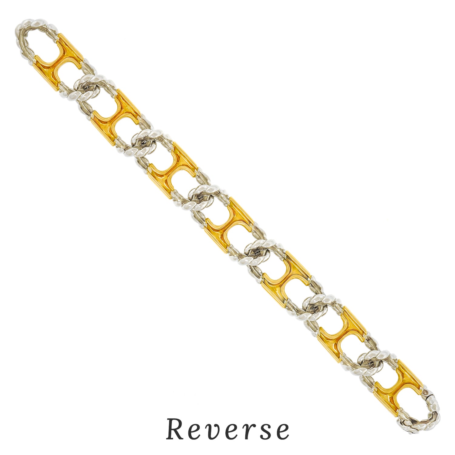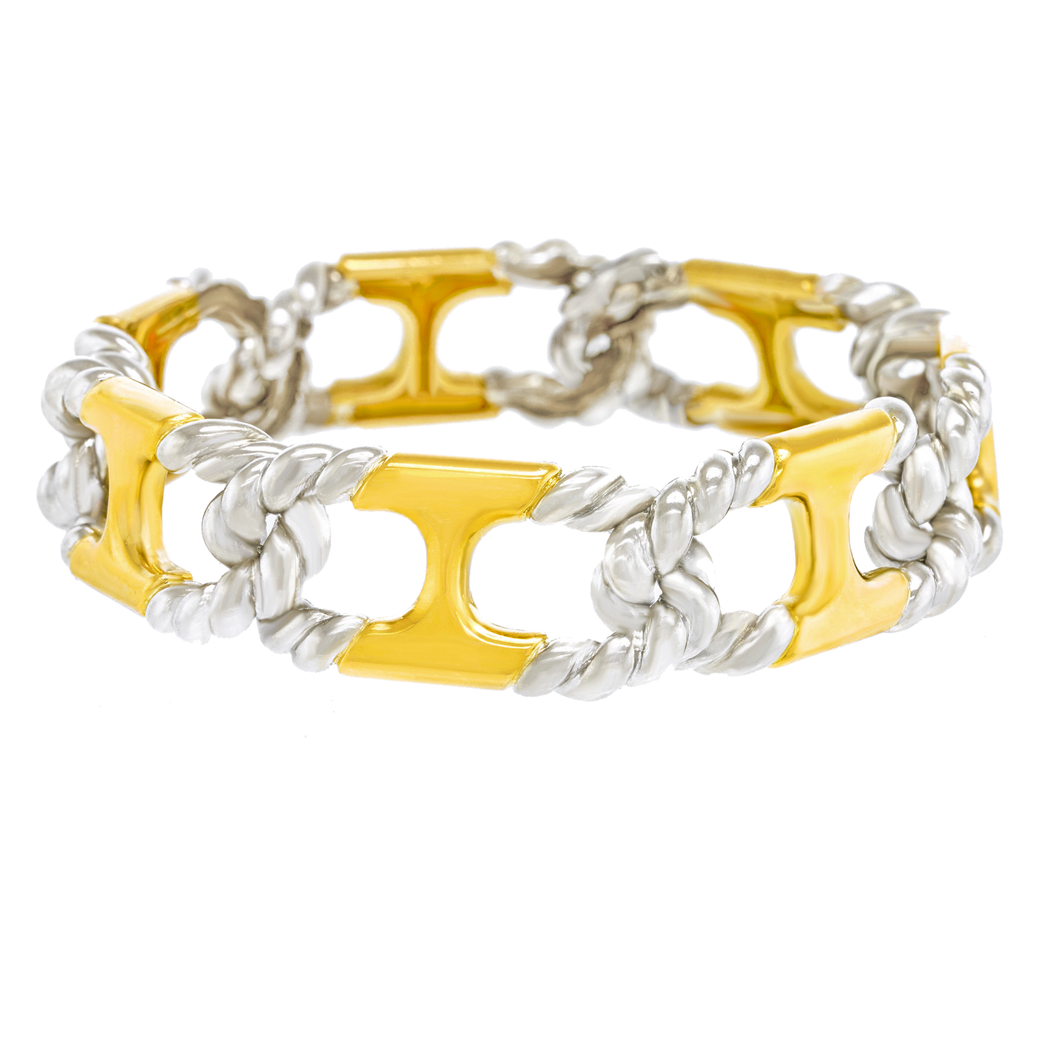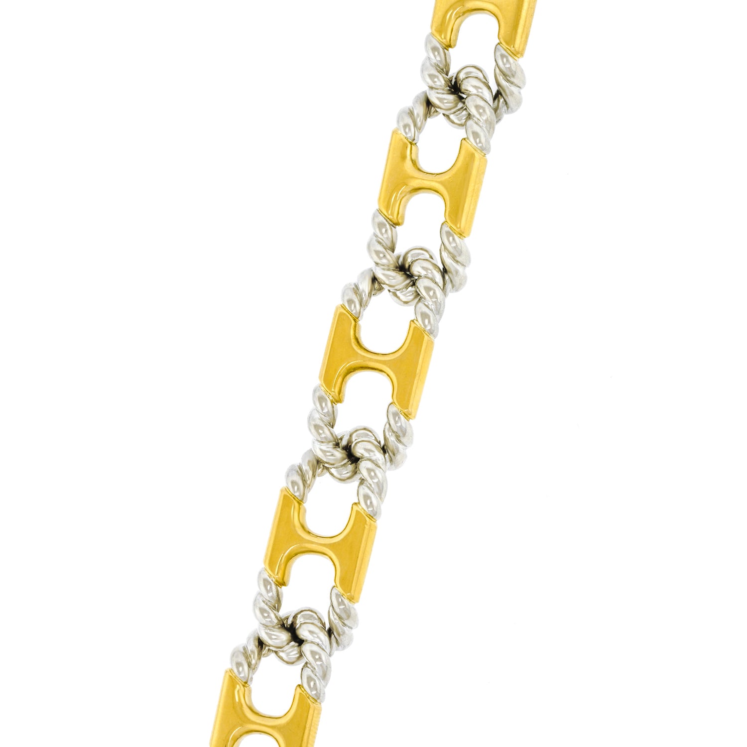 Circa 1972, 18k, by Van Cleef & Arpels, France.   This chic 18k bracelet by Van Cleef and Arpels is everyday gold at its fashionable French best. The anchor links with rope twist ends are yellow and white gold. This understated detail makes the piece visually crisp. Featuring the high style and superb craftsmanship VCA is known for, this quintessential seventies bracelet is the perfect signature accessory. Excellent condition.