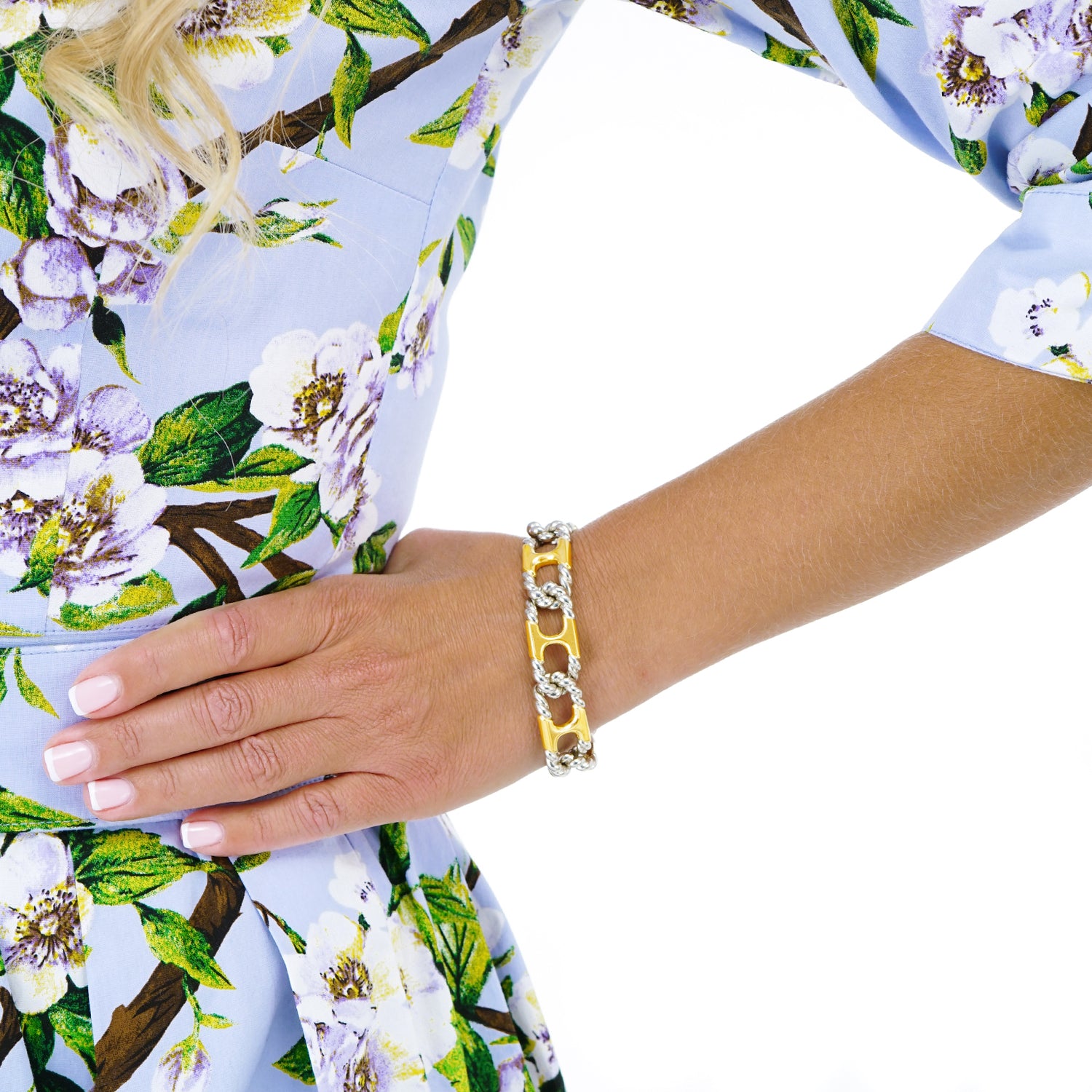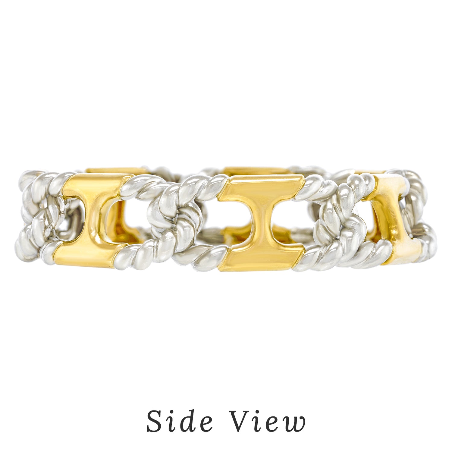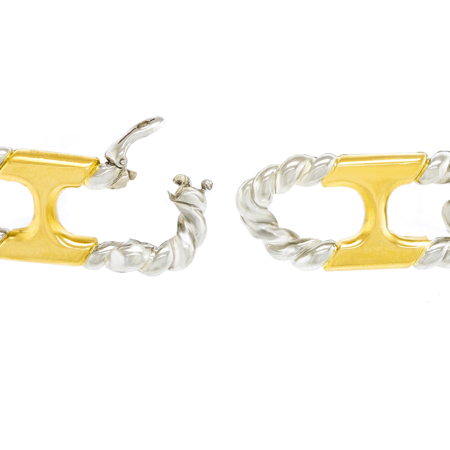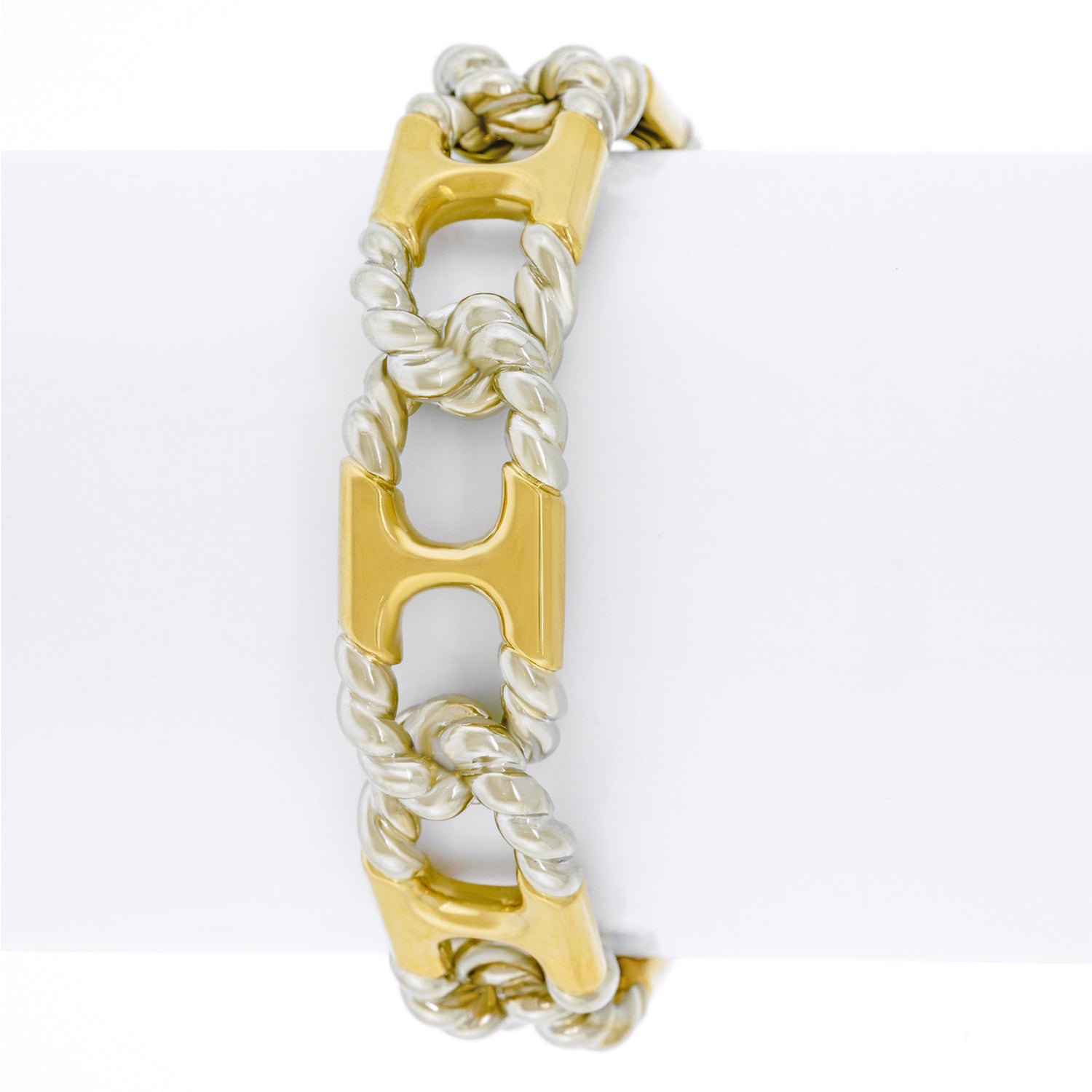 Circa 1972, 18k, by Van Cleef & Arpels, France.   This chic 18k bracelet by Van Cleef and Arpels is everyday gold at its fashionable French best. The anchor links with rope twist ends are yellow and white gold. This understated detail makes the piece visually crisp. Featuring the high style and superb craftsmanship VCA is known for, this quintessential seventies bracelet is the perfect signature accessory. Excellent condition.