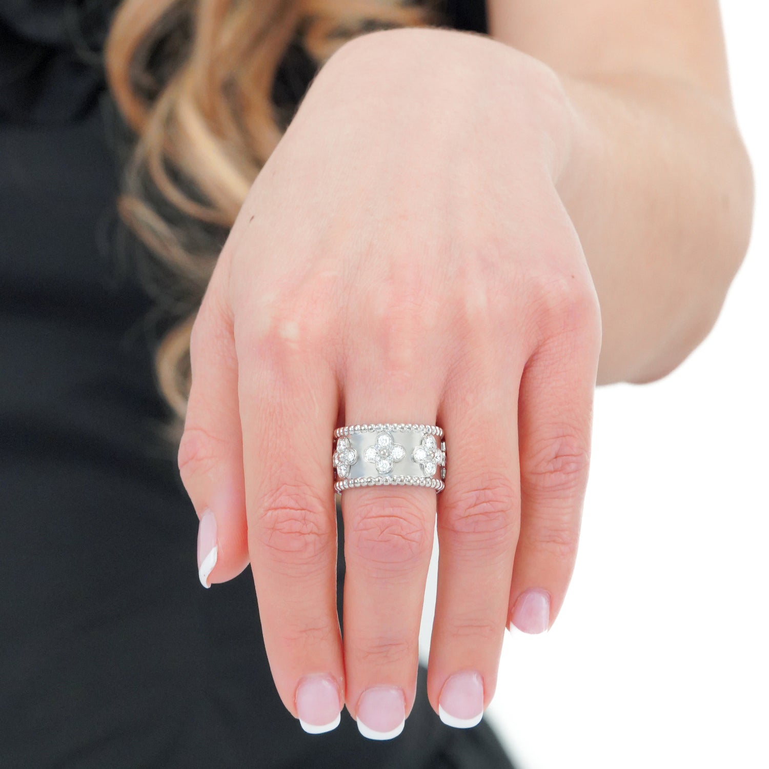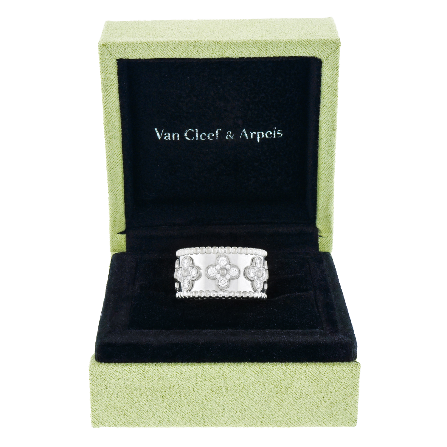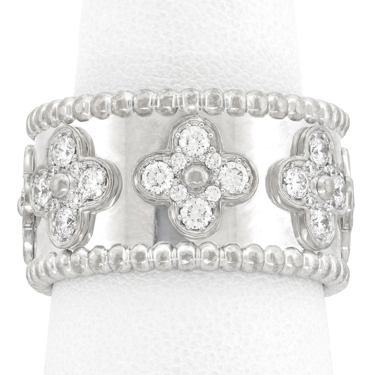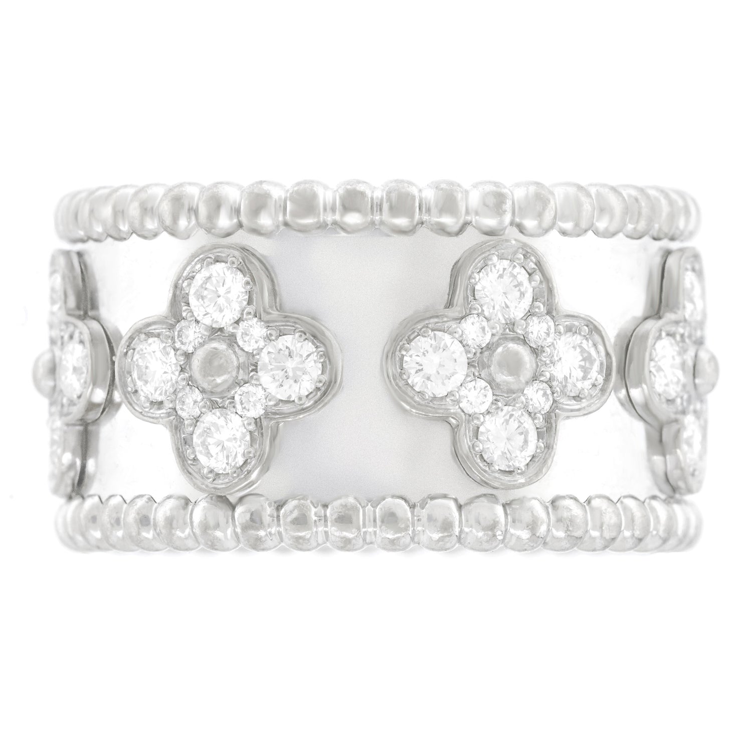 Circa 2015, 18k, by Van Cleef & Arpels, France.  Underscored by meticulous gold work and brilliant white diamonds (F-E VS), this Perlée Clovers ring is Van Cleef & Arpels at its everyday everywhere best! A rare, out-of-production, extra-wide example in the hard-to-get size 8 3/4s, this ring is a comfortable-to-wear statement piece.  Excellent condition. Comes with the original receipt and box.