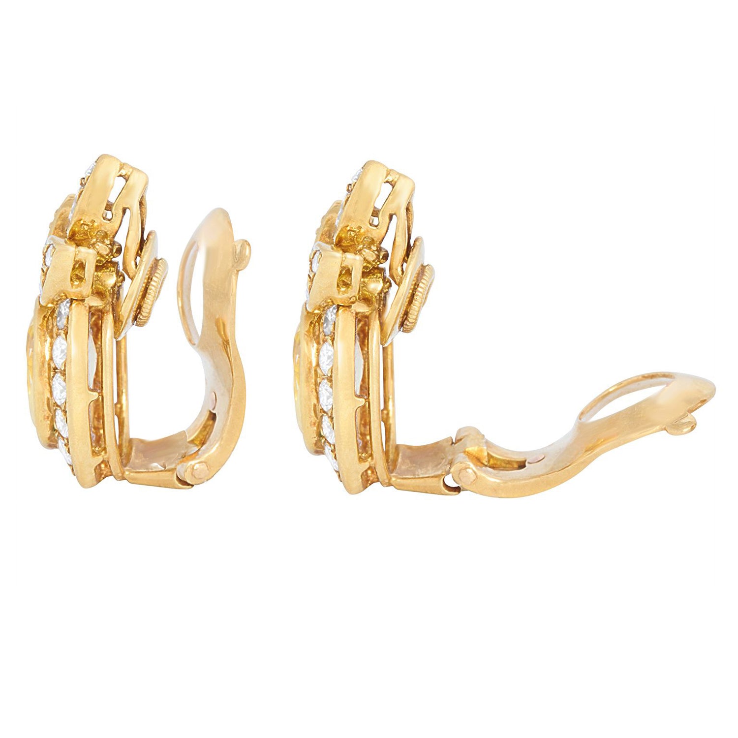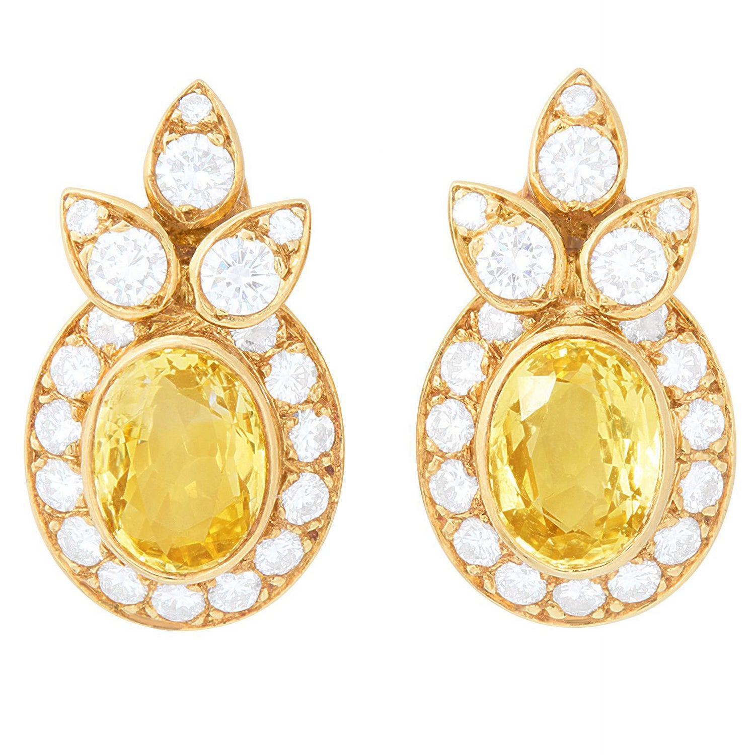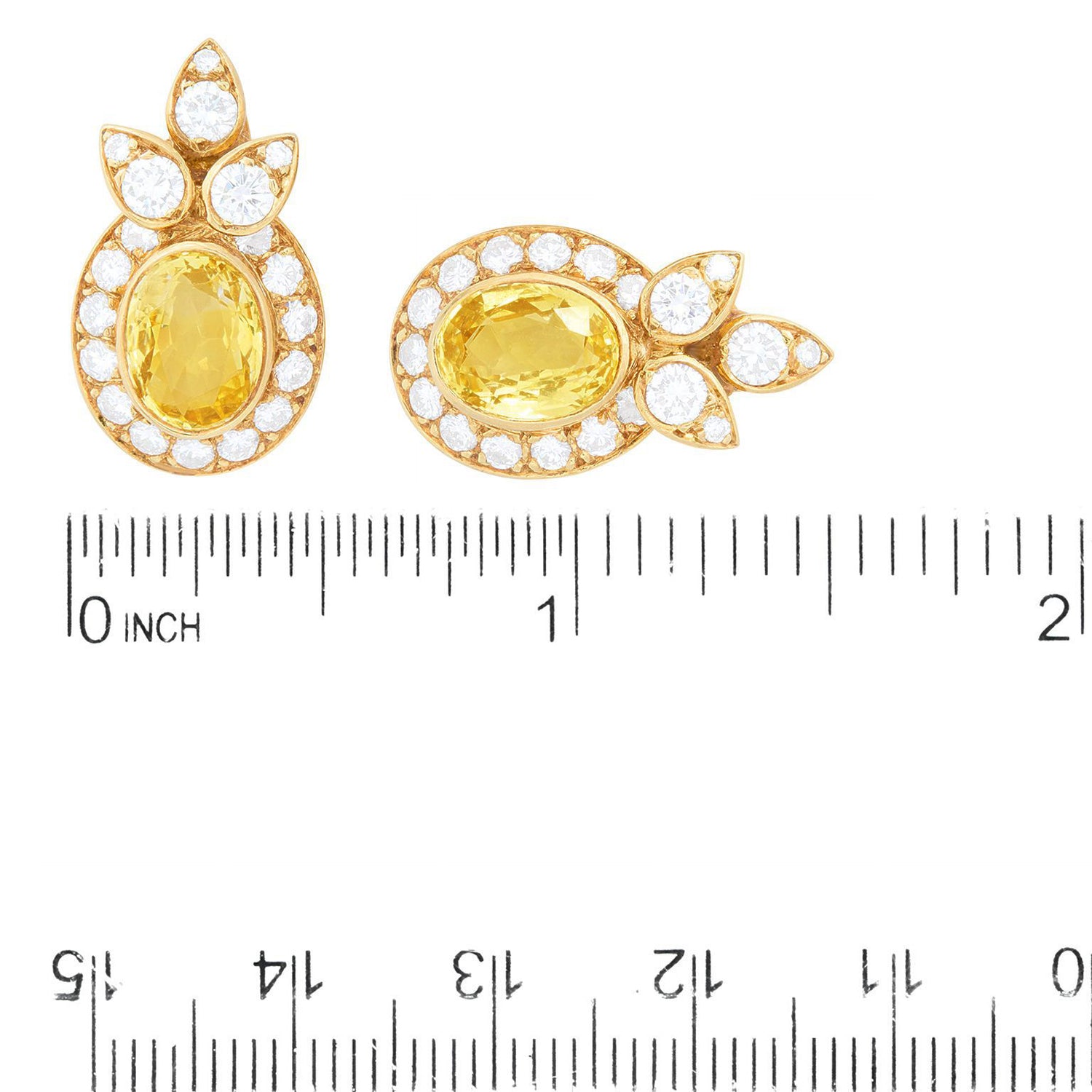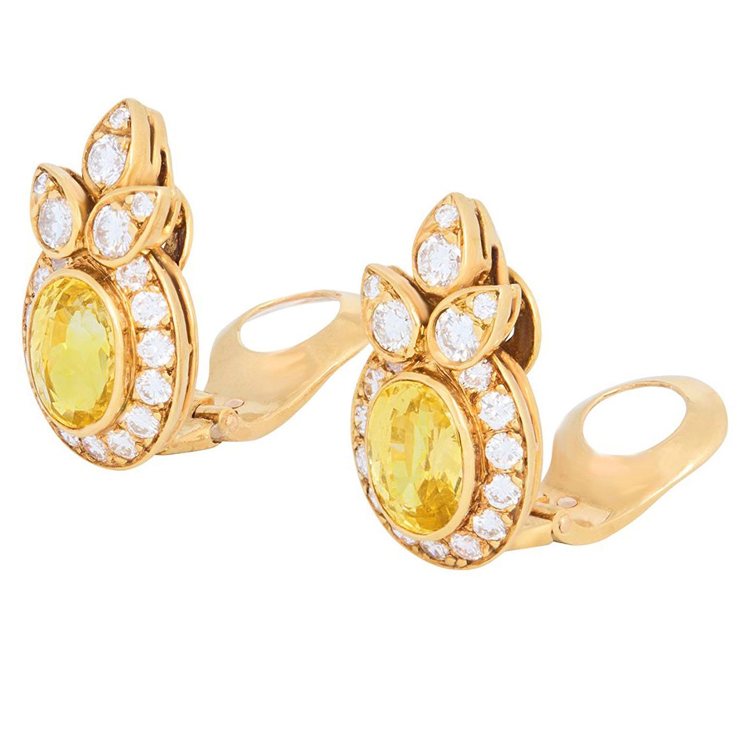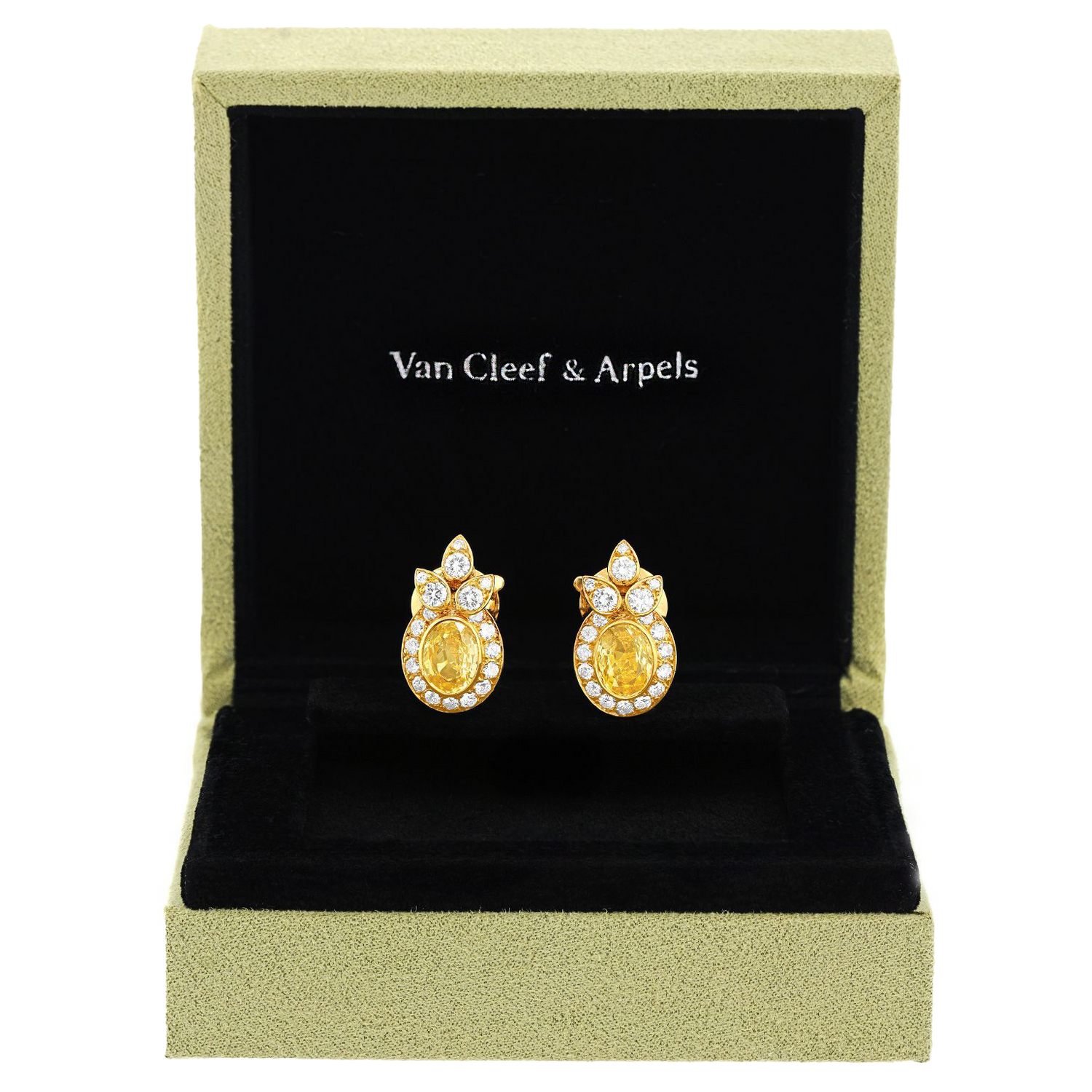 Circa 1970s, 18k, by Van Cleef & Arpels, Paris, France. Van Cleef & Arpels has an aesthetic vision that begins at fabulous and knows no bounds. The bright white diamonds (F color, VS clarity) in these sublime earrings are the perfect companion for the gorgeous yellow sapphires. The look is "forever stylish." VCA is known for spectacular stones, meticulous craftsmanship, and classic design. Original box included. Excellent condition.