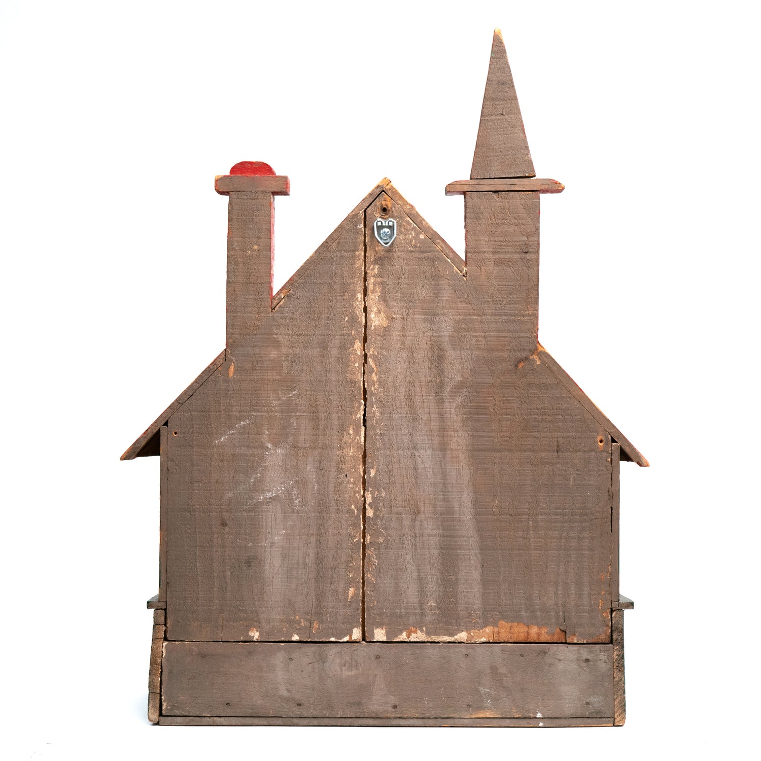 Circa late 1800s, Wood, and Glass, American, possibly New York. Charming beyond belief, this polychrome Folk Art House was originally made to feature a mirror for grooming and tray for brushes, combs, razors, etc. It could have hung on a wall or sat on a dresser or side table. A unique accessory for any décor. The only ones like this I have ever seen are the 4 we currently have on offer. Good condition.