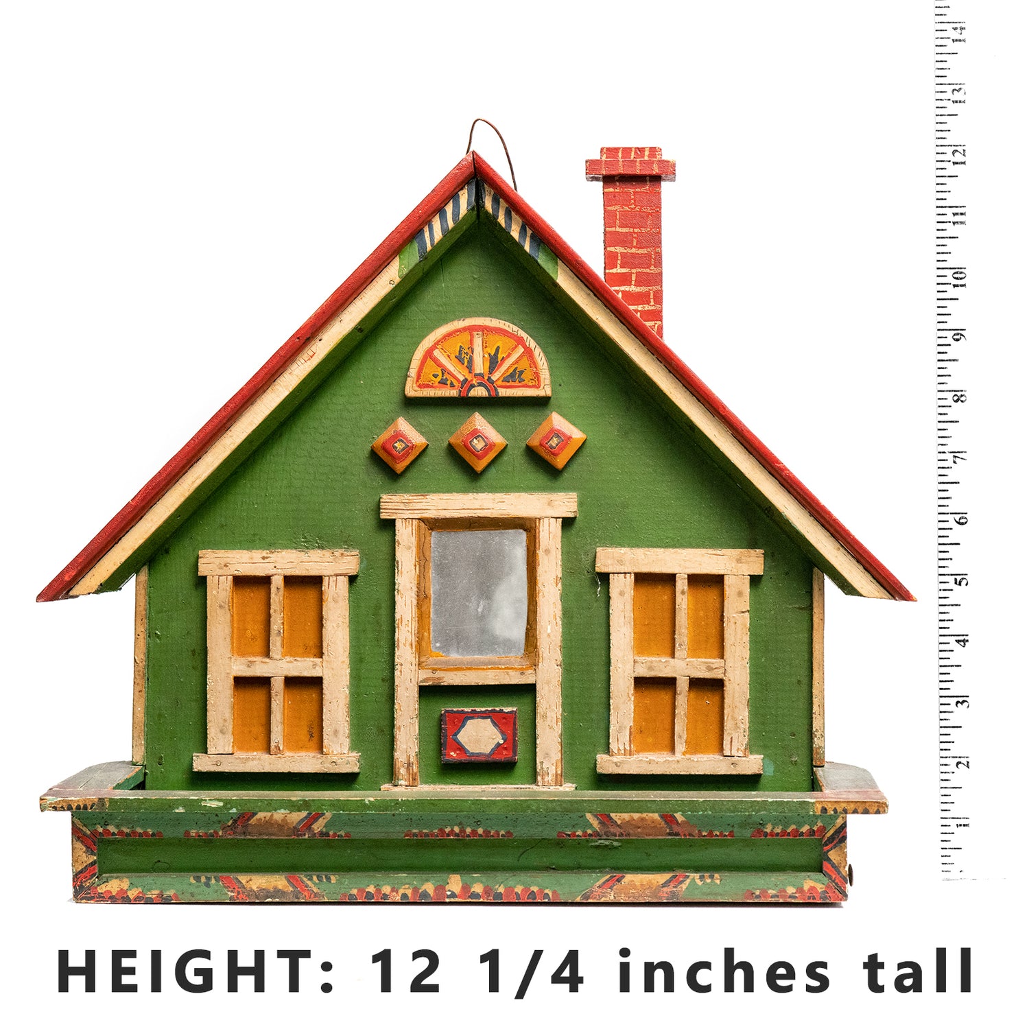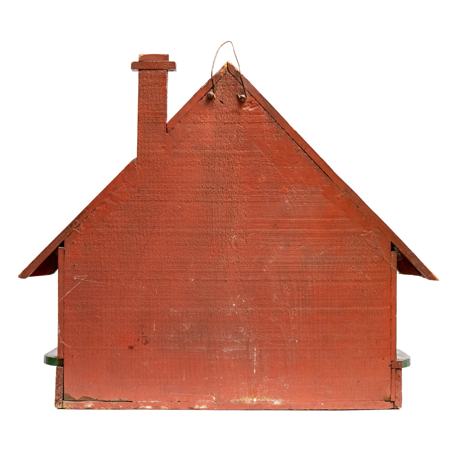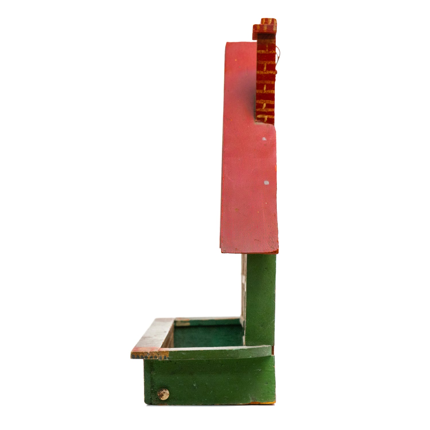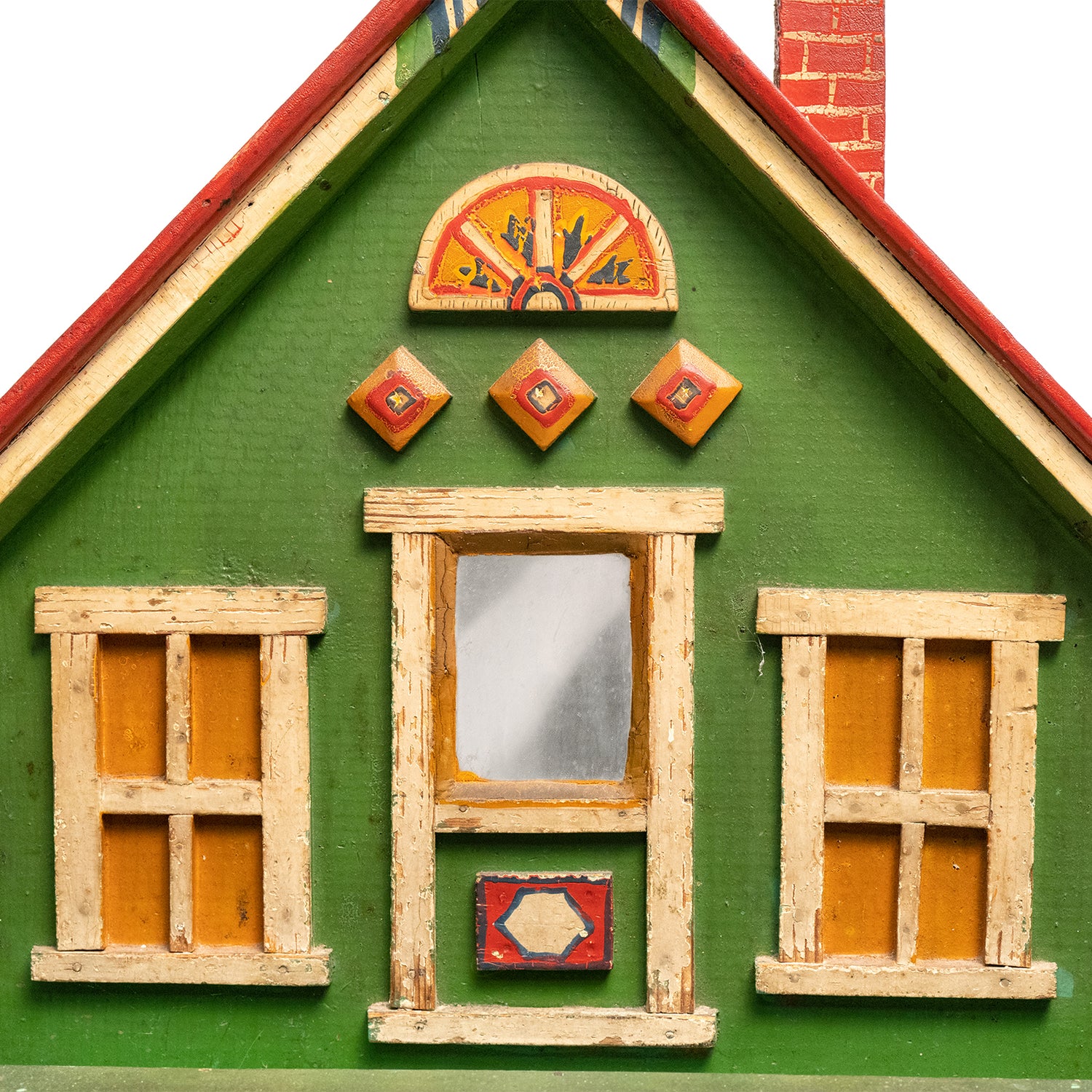Circa late 1800s, Wood, and Glass, American, possibly New York. Charming beyond belief, this polychrome Folk Art House was originally made to feature a mirror for grooming and tray for brushes, combs, razors, etc. It could have hung on a wall or sat on a dresser or side table. A unique accessory for any décor. The only ones like this I have ever seen are the 4 we currently have on offer. Good condition.