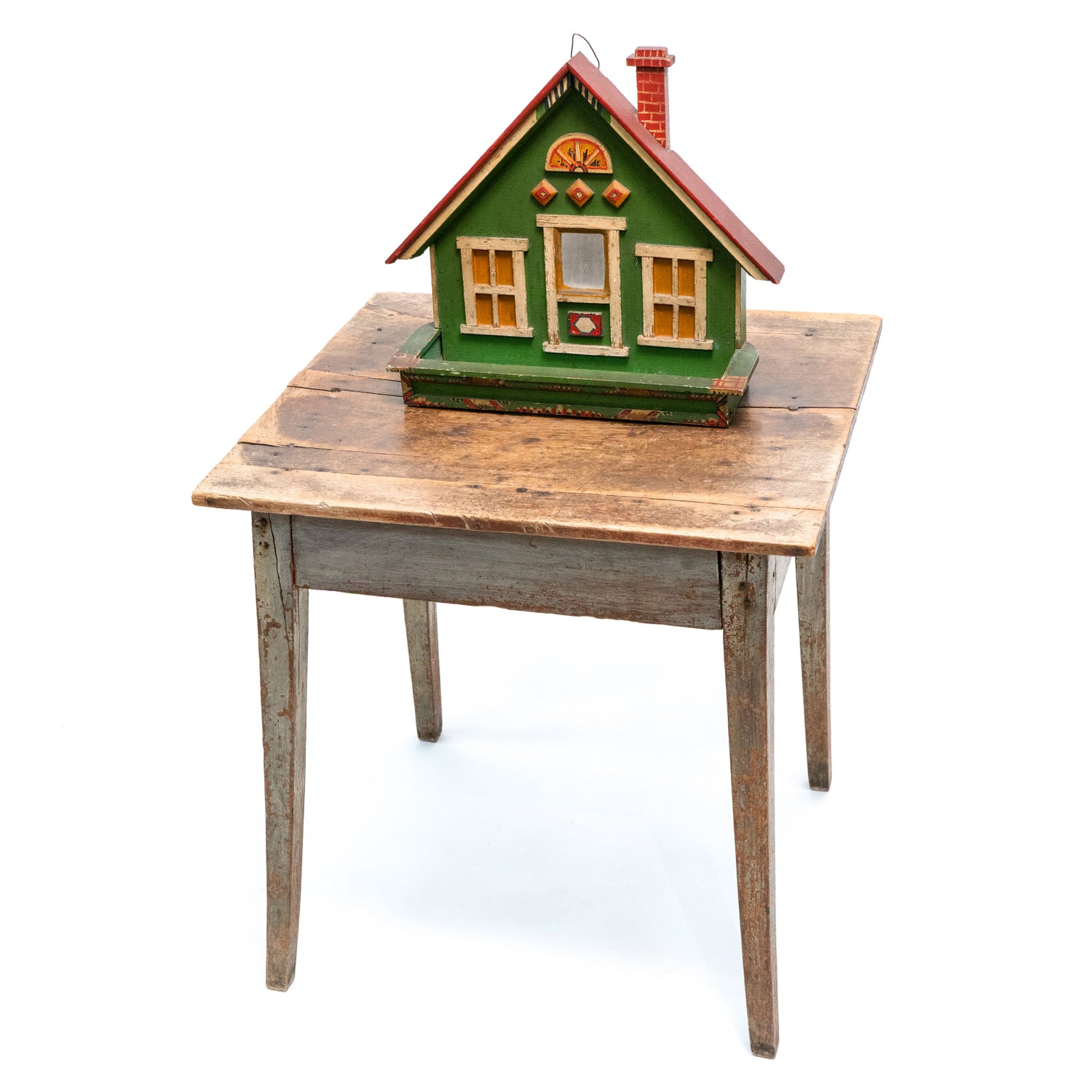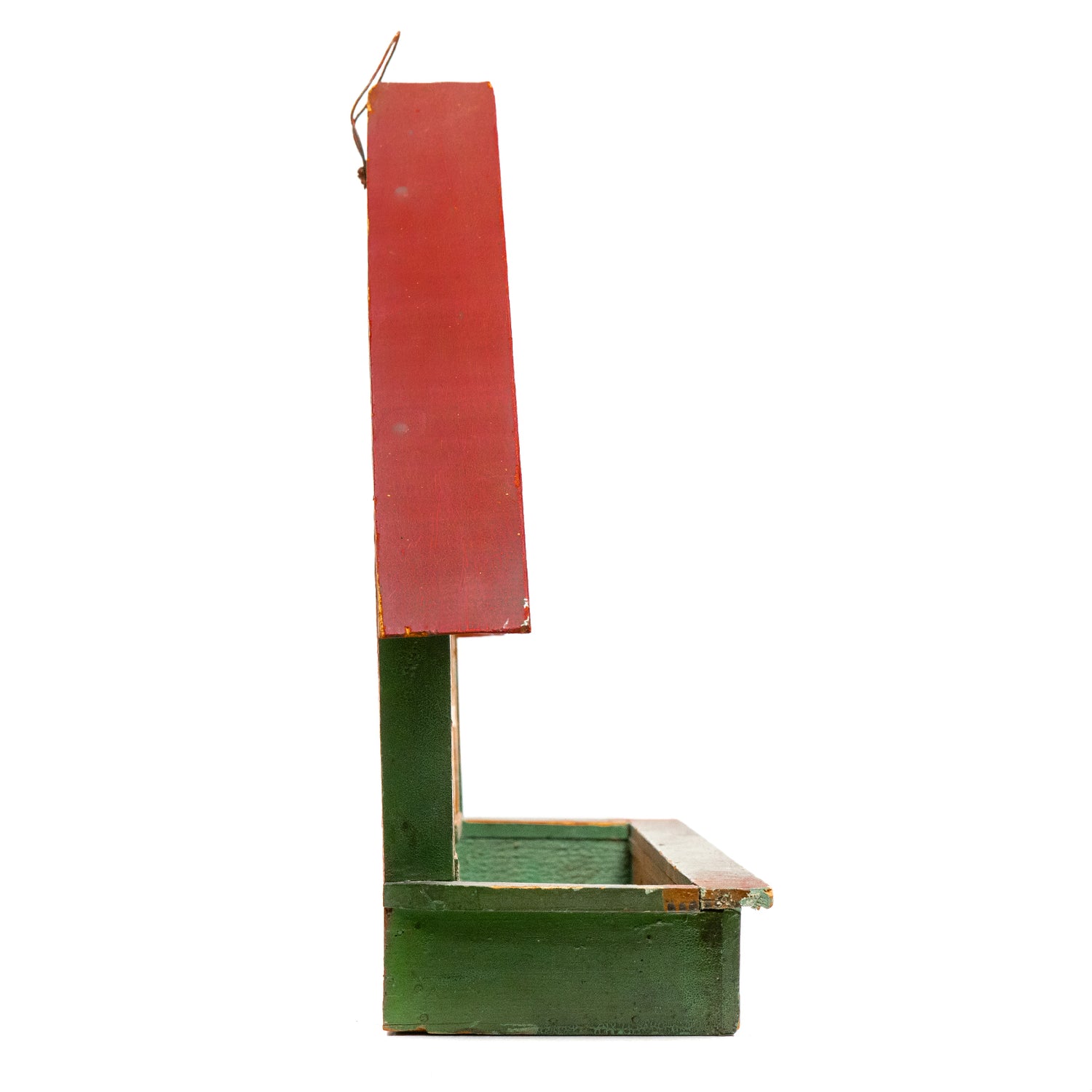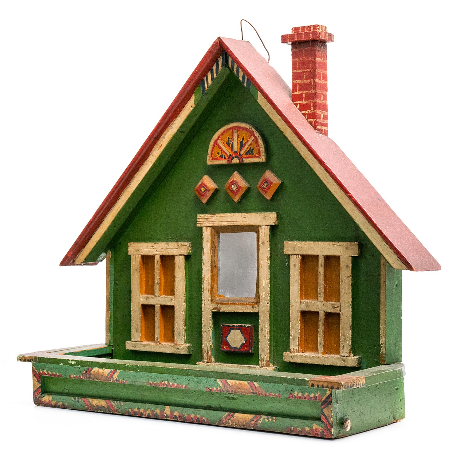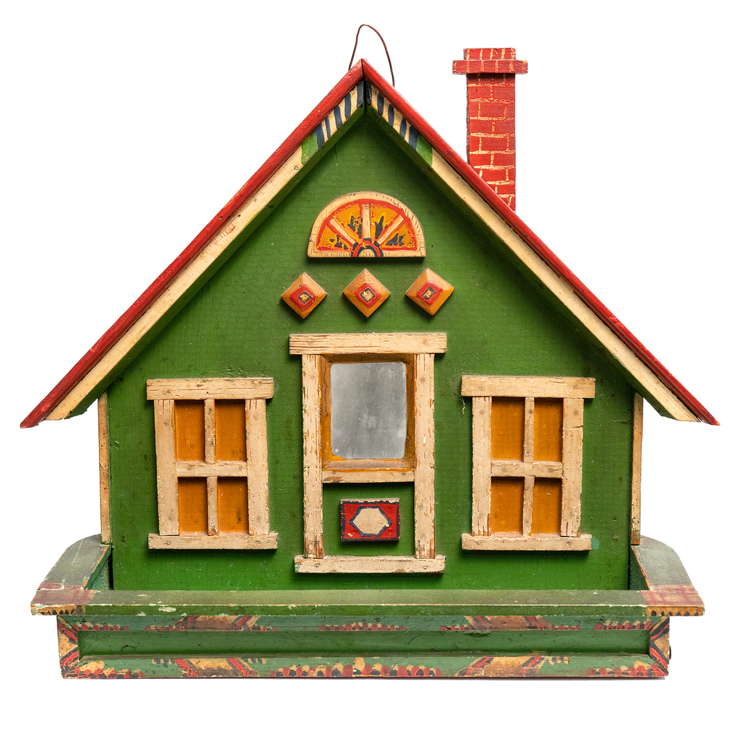 Circa late 1800s, Wood, and Glass, American, possibly New York. Charming beyond belief, this polychrome Folk Art House was originally made to feature a mirror for grooming and tray for brushes, combs, razors, etc. It could have hung on a wall or sat on a dresser or side table. A unique accessory for any décor. The only ones like this I have ever seen are the 4 we currently have on offer. Good condition.