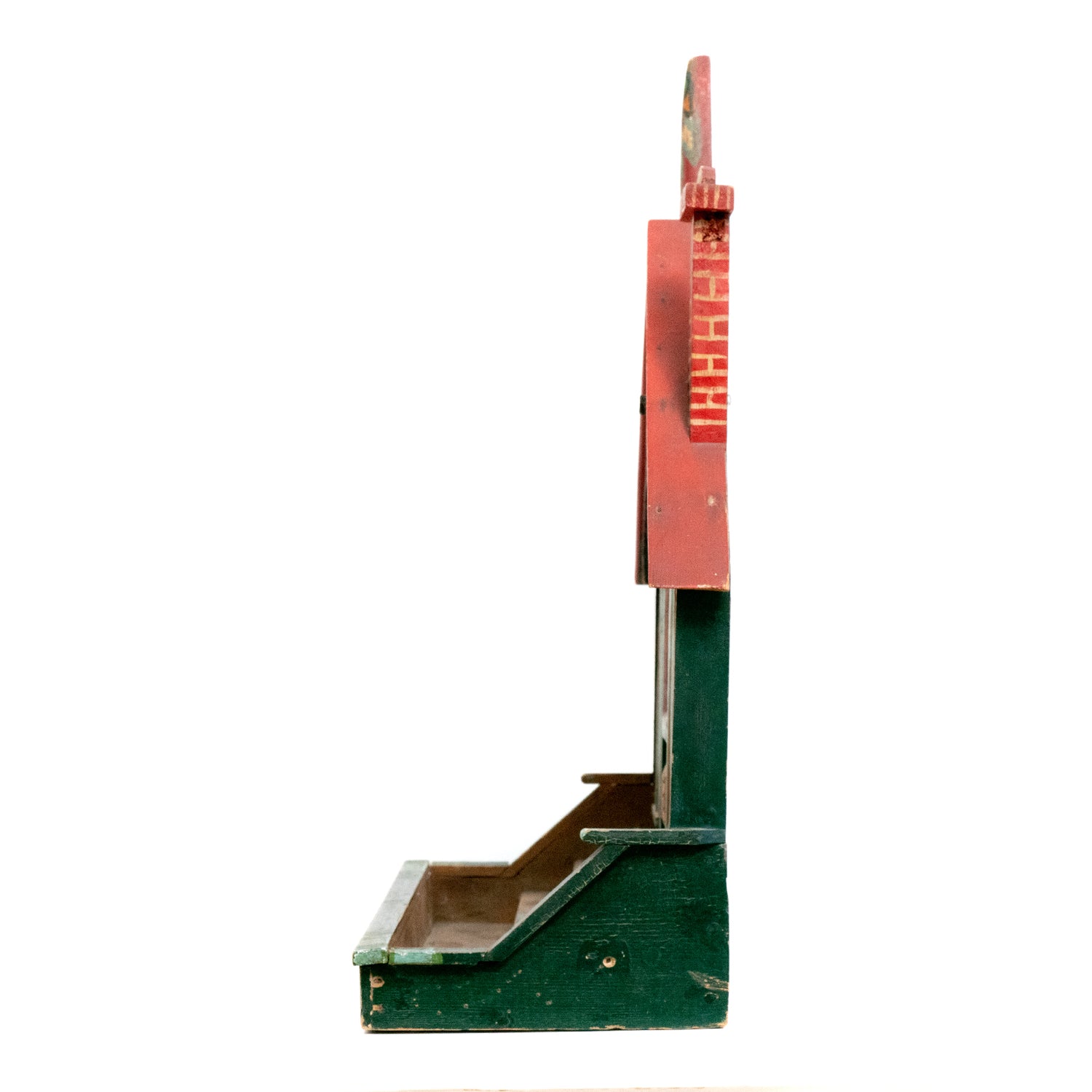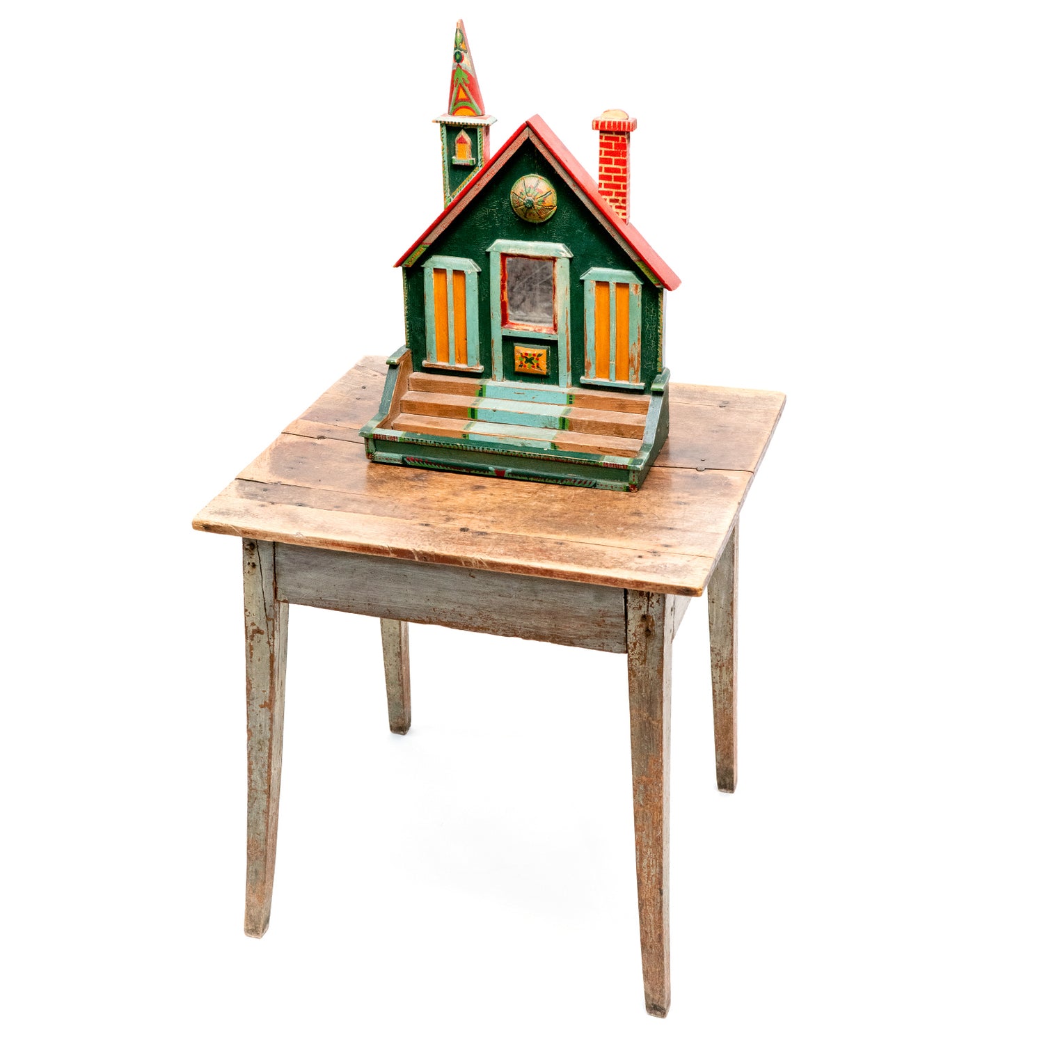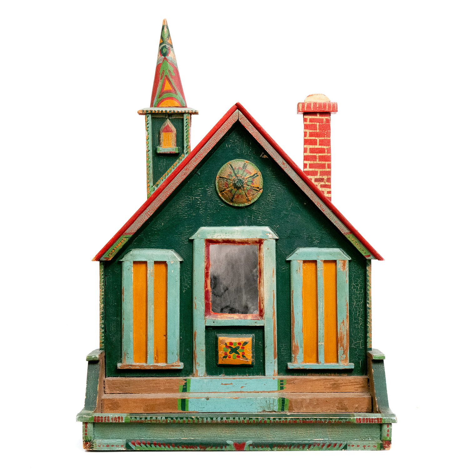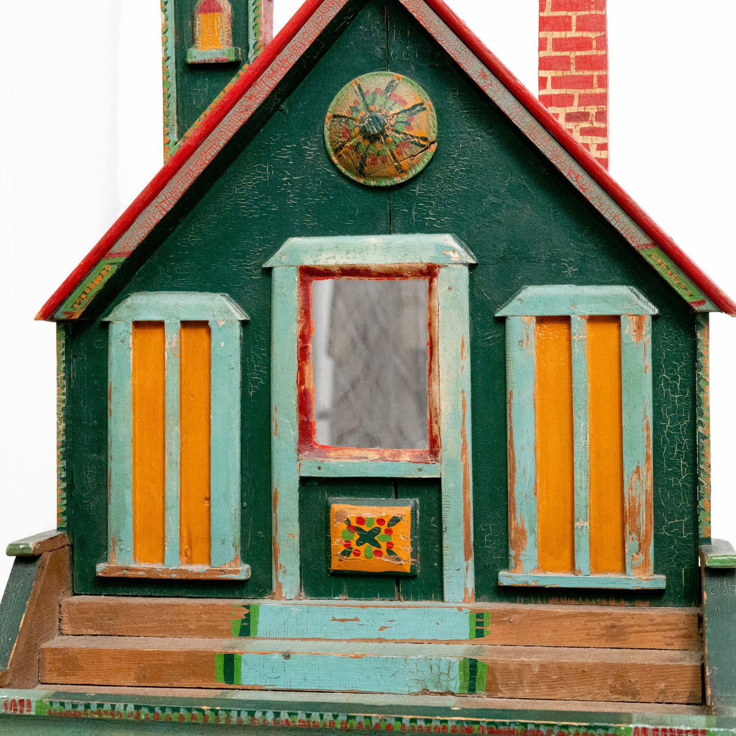 Circa late 1800s, Wood, and Glass, American, possibly New York. Charming beyond belief, this polychrome Folk Art House was originally made to feature a mirror for grooming and tray for brushes, combs, razors, etc. It could have hung on a wall or sat on a dresser or side table. A unique accessory for any décor, the only ones like this I have ever seen are the 4 we currently have to offer. Good condition.