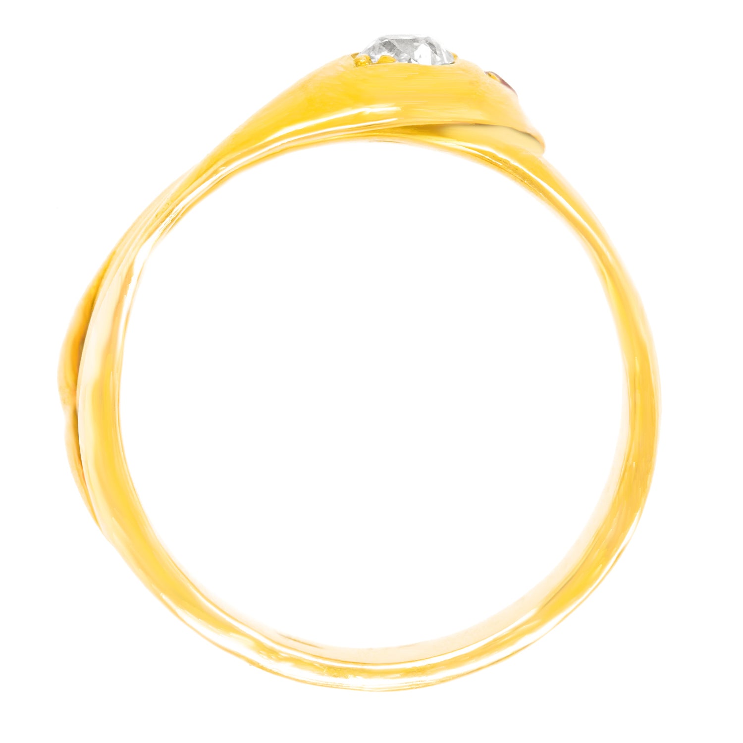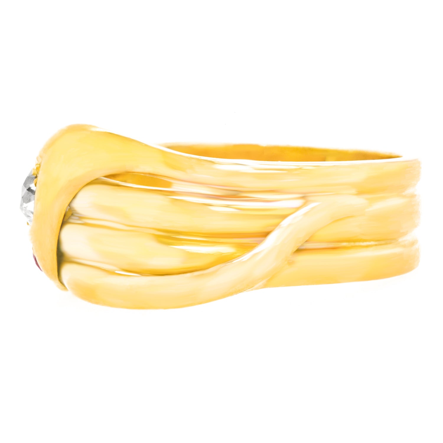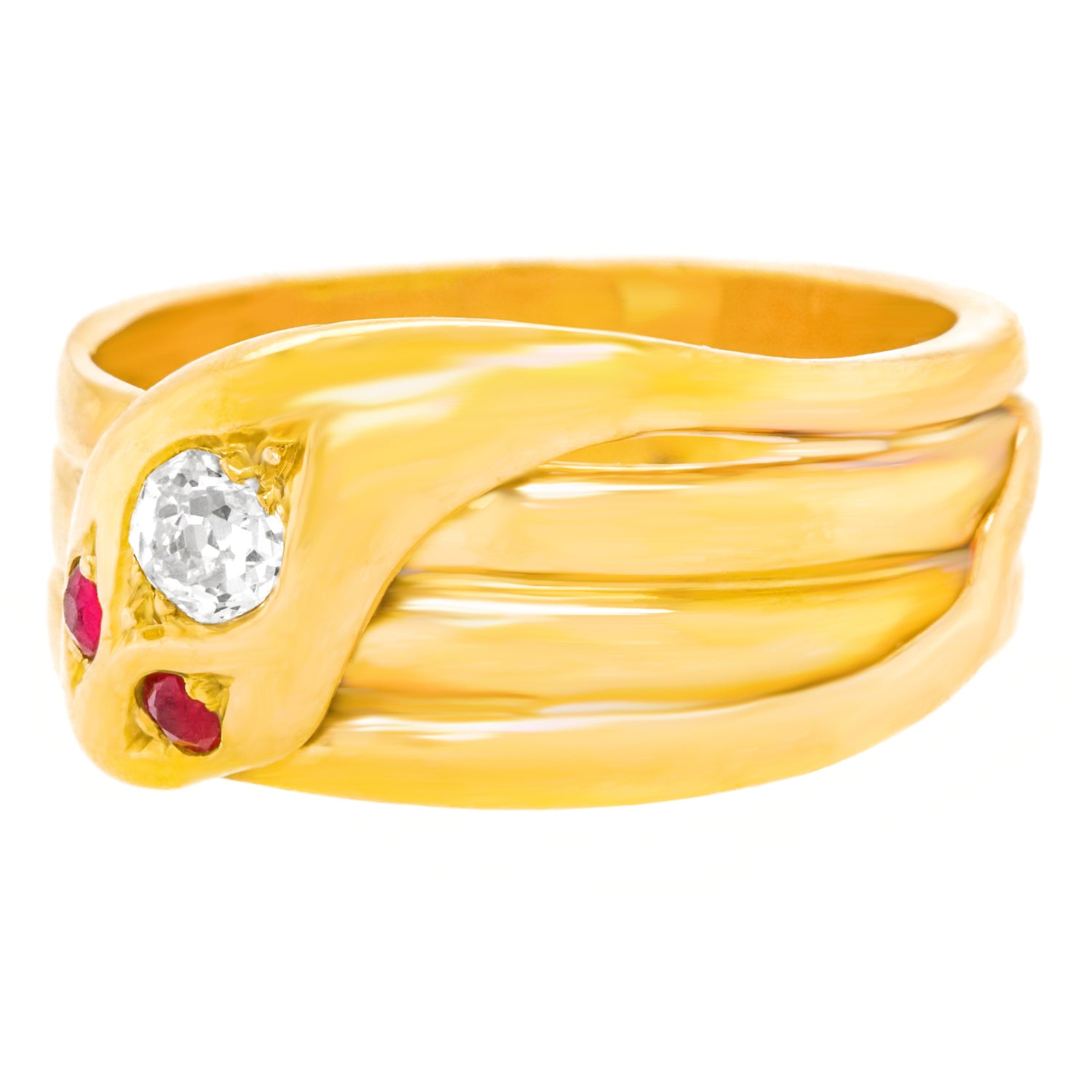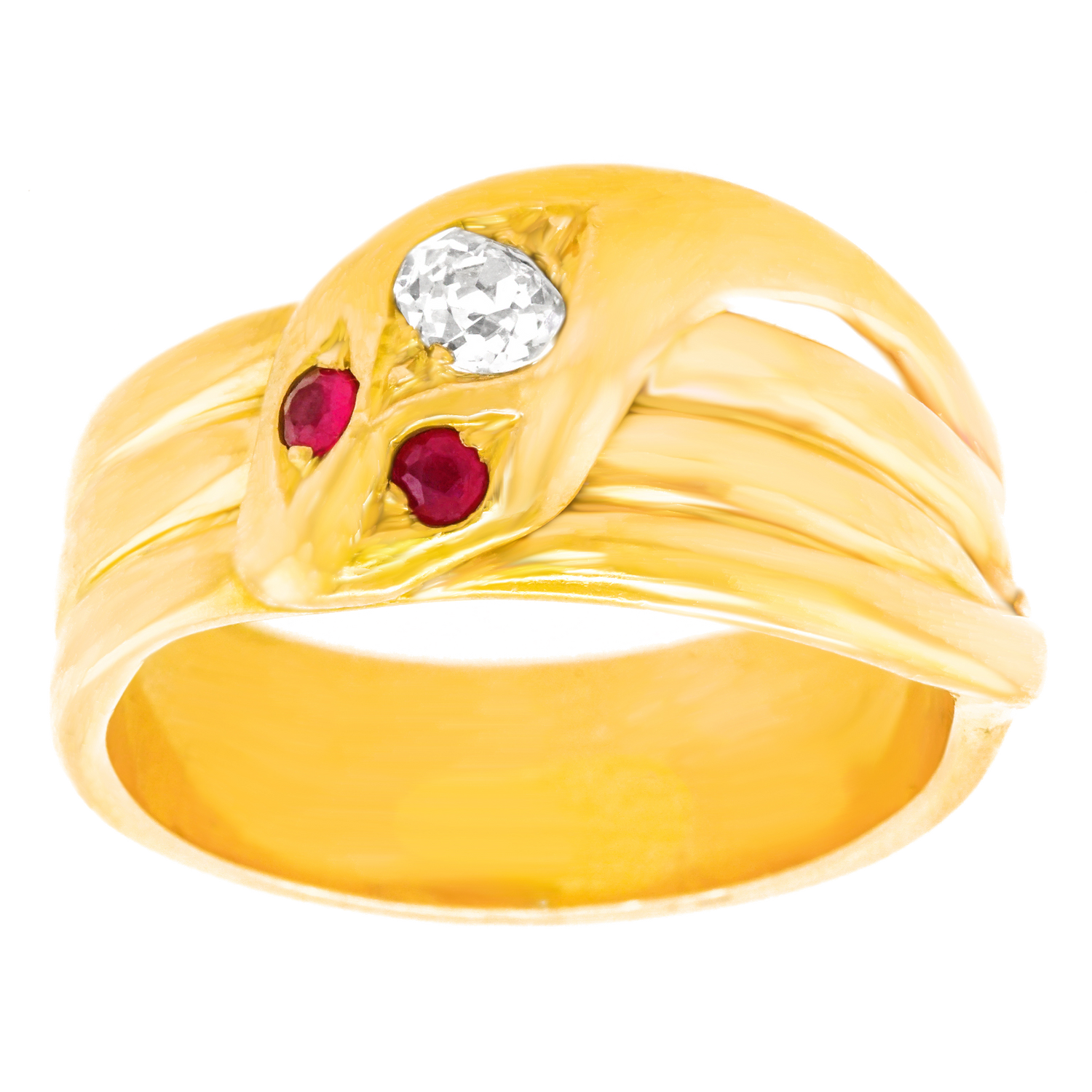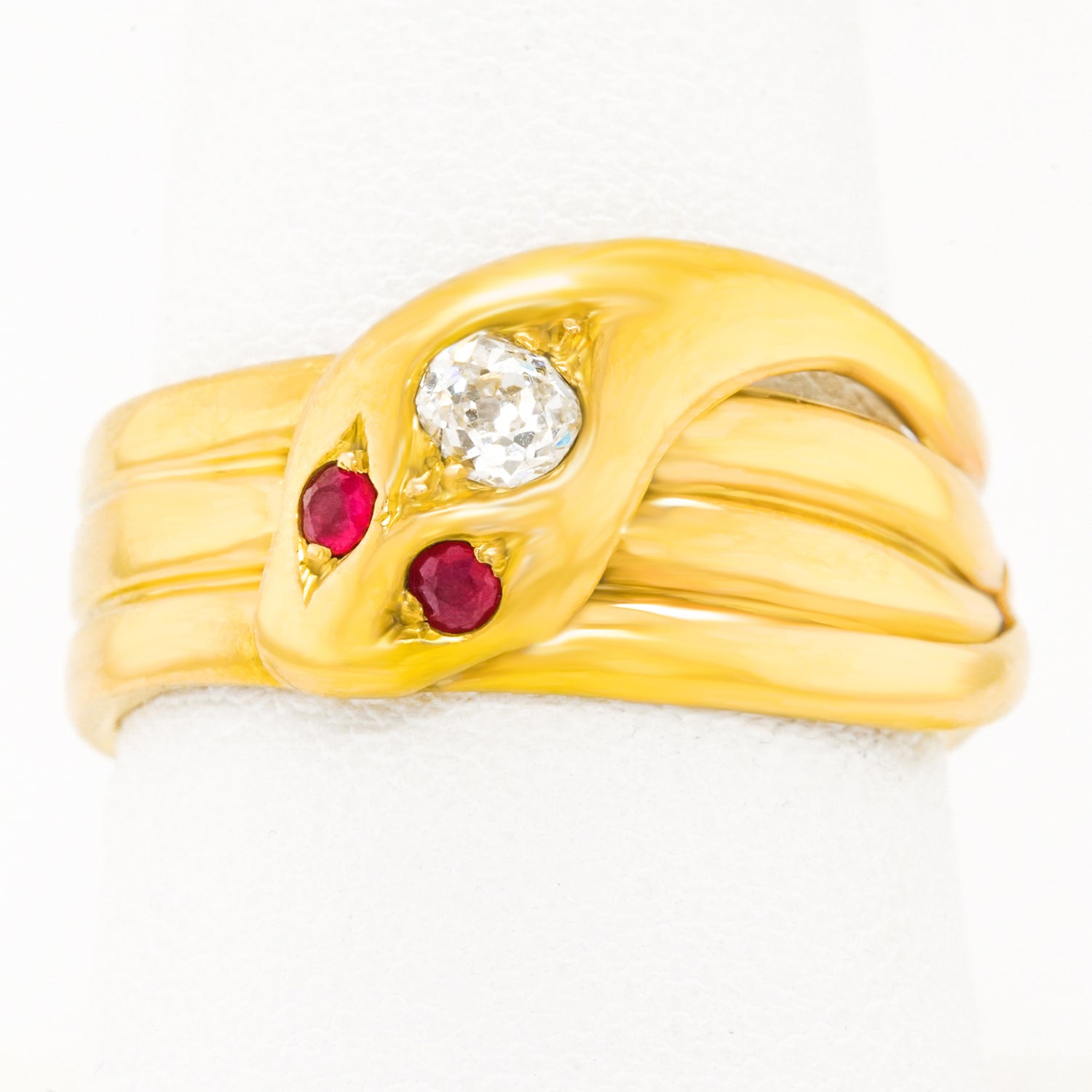 Circa 1890s, 18k. Victorian symbols of friendship and trustworthiness, these snake rings were popular as gifts. Featuring meticulous construction with a sleek design accented by a .30 carat diamond and ruby eyes, this ring has the look of jewelry from the ancients. Stylish, mystical, and easy to wear, this charming snake ring is in excellent condition.