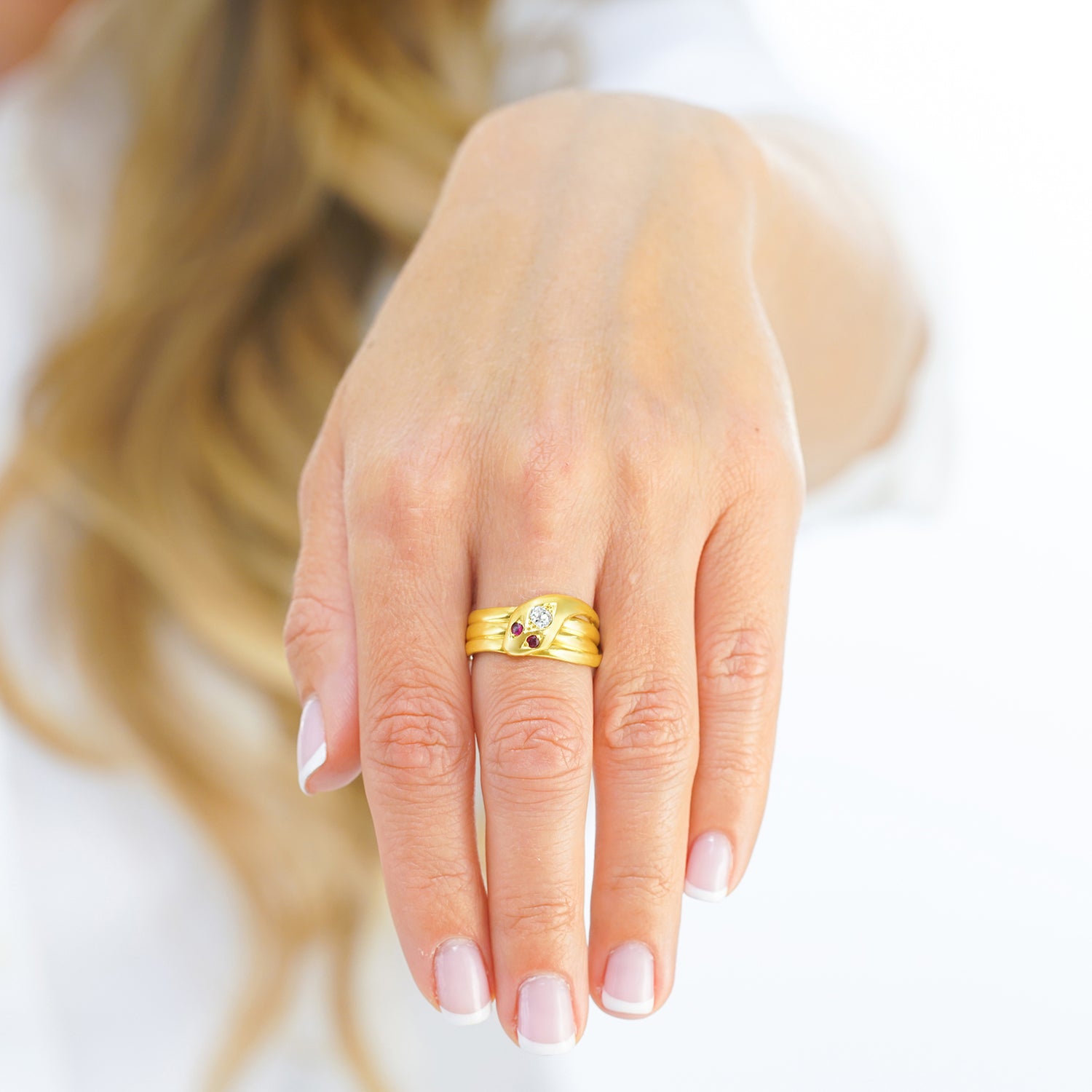Remarks from Lawrence Jeffrey: "Sleek little serpents have long decorated our fingers and wrists. Though they traditionally represent fidelity and friendship, we love them for their exotic charm."