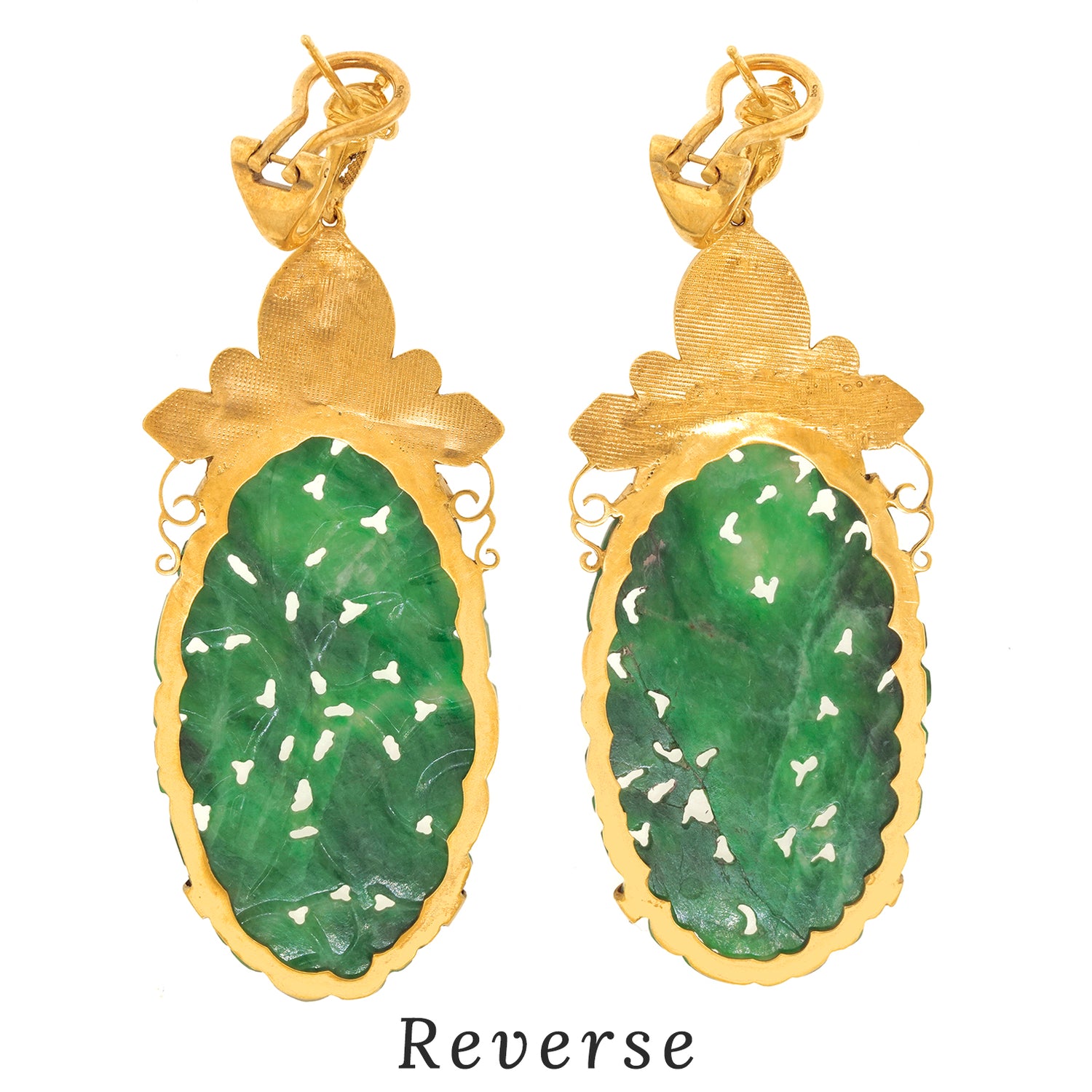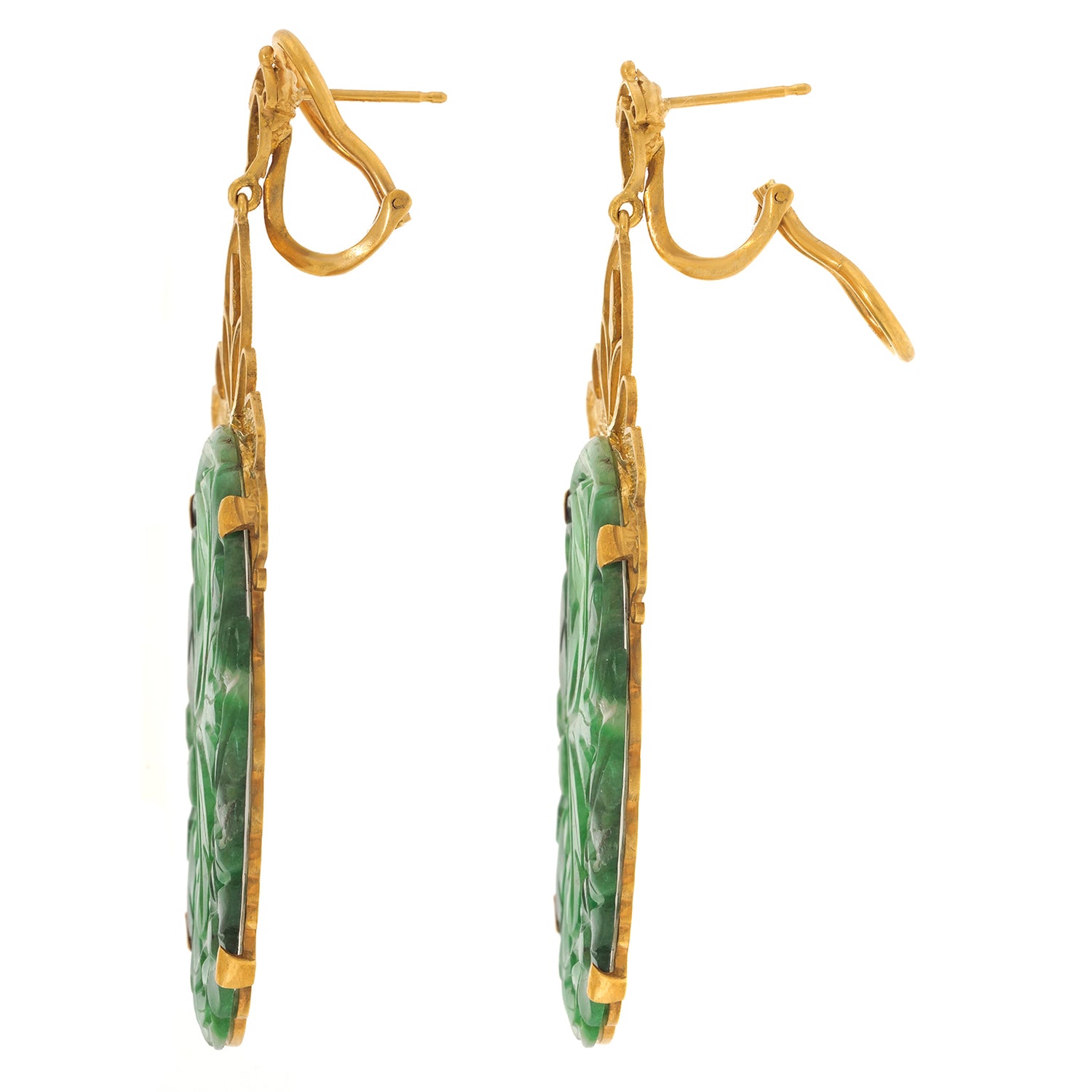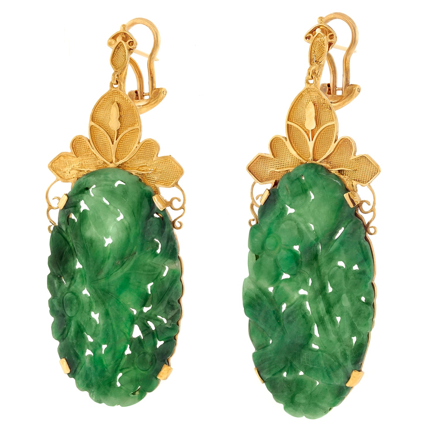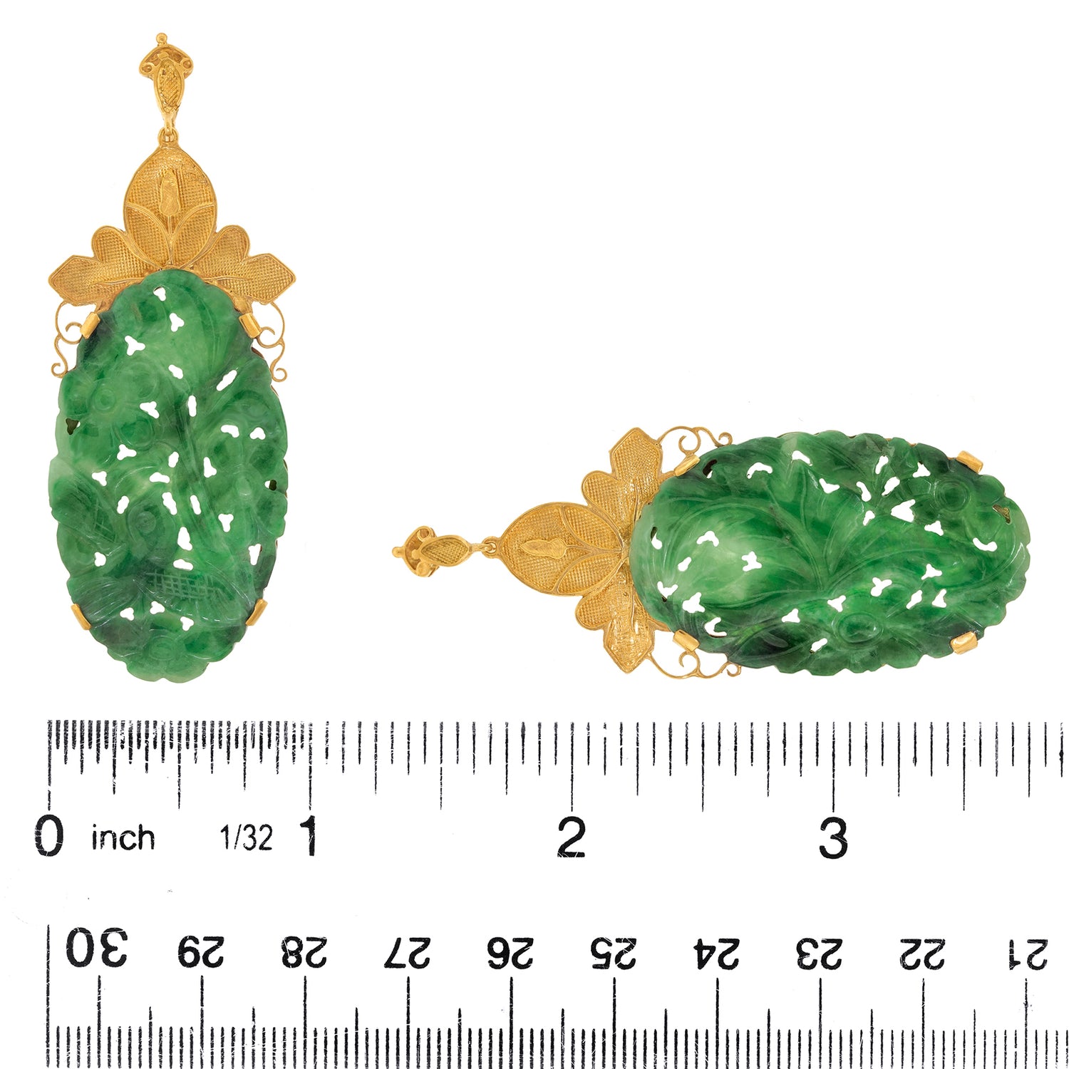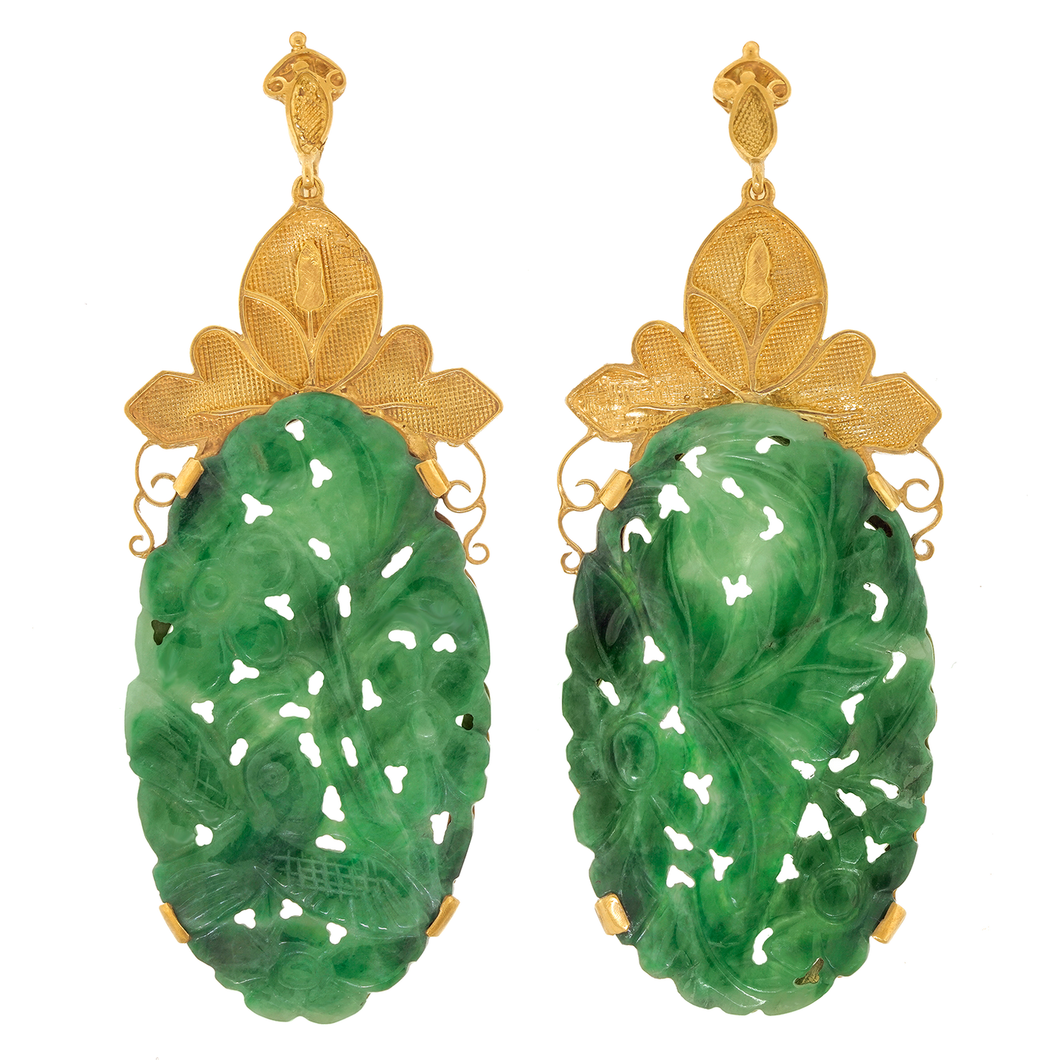 Circa 1880-1890s, 14k. Possibly Chinese export. These extraordinary earrings feature sublime design, impressive size, and delightful movement. The carved jades are replete with color and nuanced details, giving these one-of-a-kind chandelier earrings a timelessly chic look. Handmade, they are in very good condition.