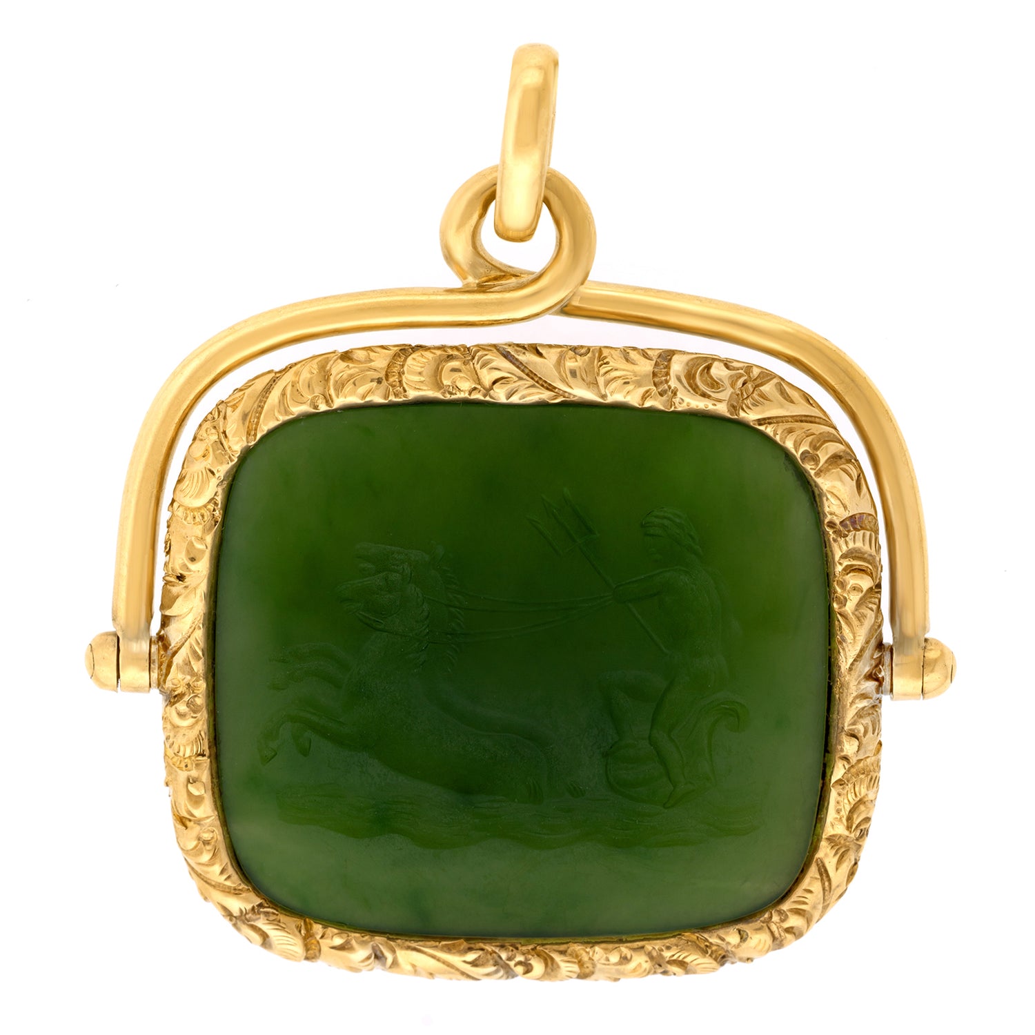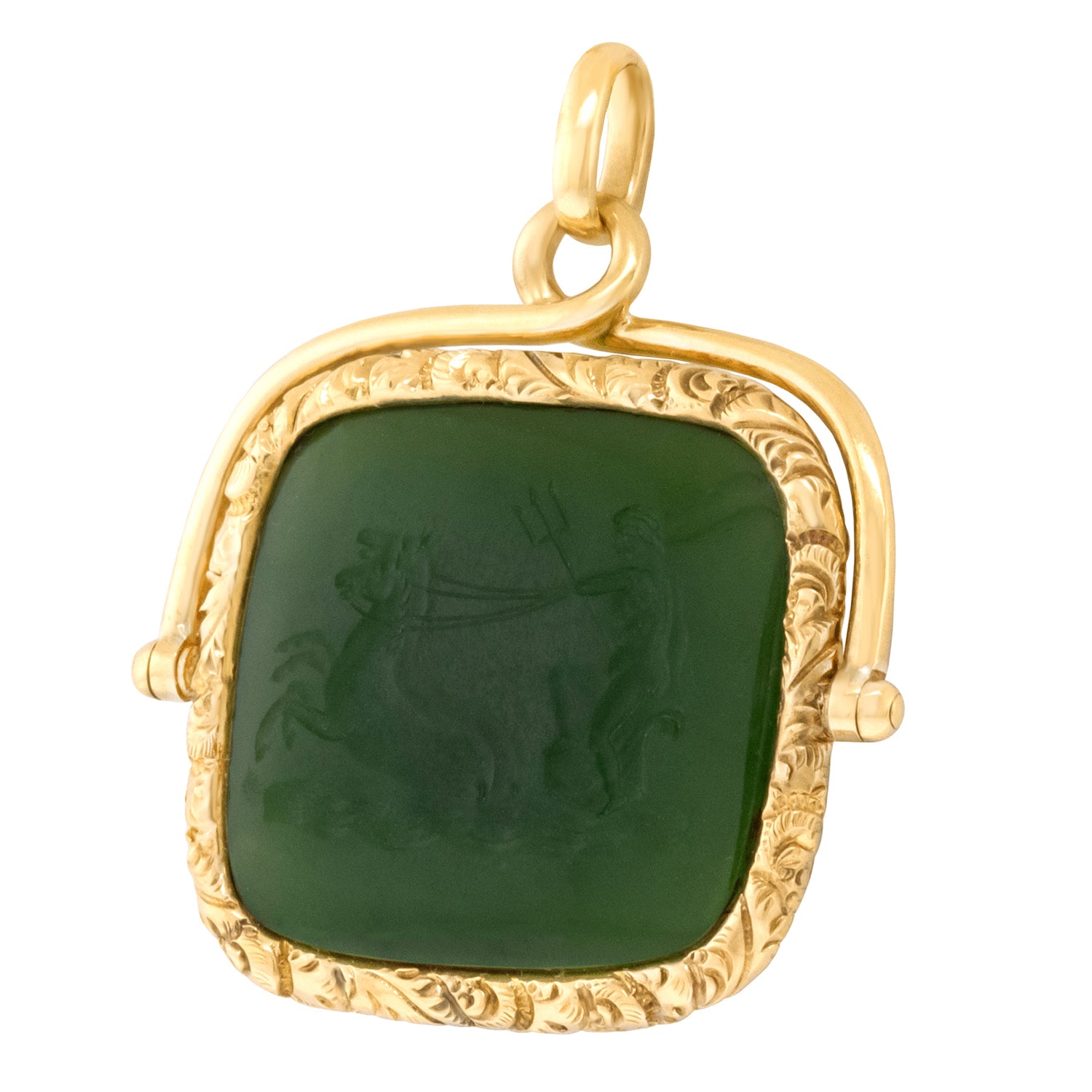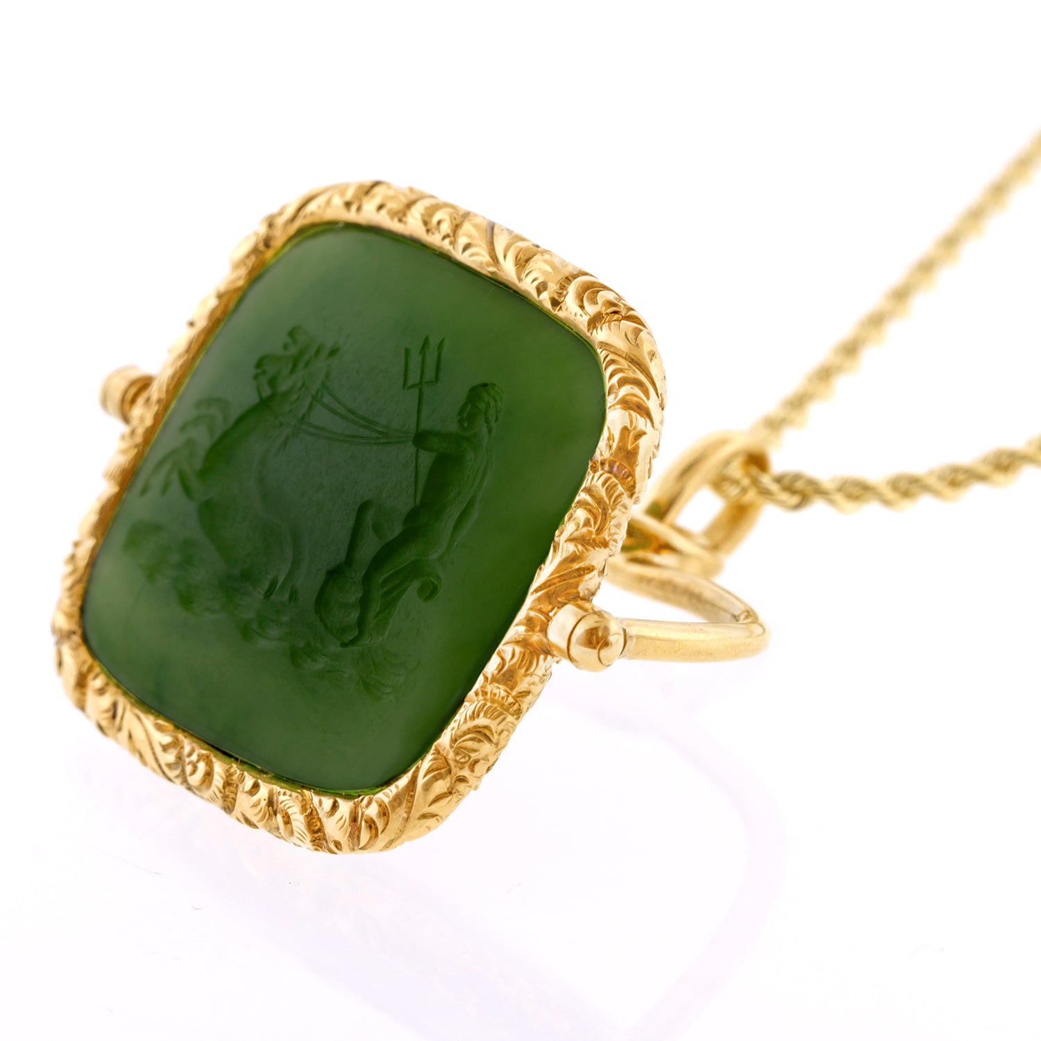 Circa 1880s, 14k. This nineteenth-century jade fob makes a unique and charming pendant. Featuring Poseidon on a chariot drawn by seahorses the intaglio carving is detailed and whimsical. Worn long or short, on its own or as part of a talismanic group, the look is town and country chic. Well made in fourteen-karat yellow gold, the piece feels wonderful on and is in excellent condition.