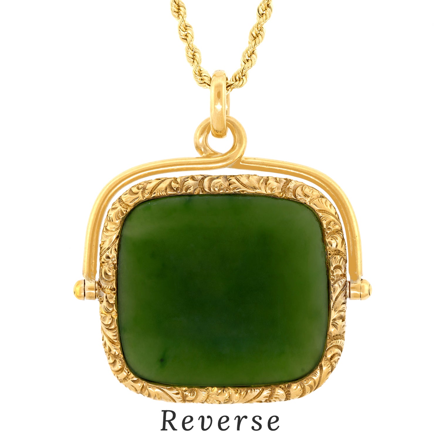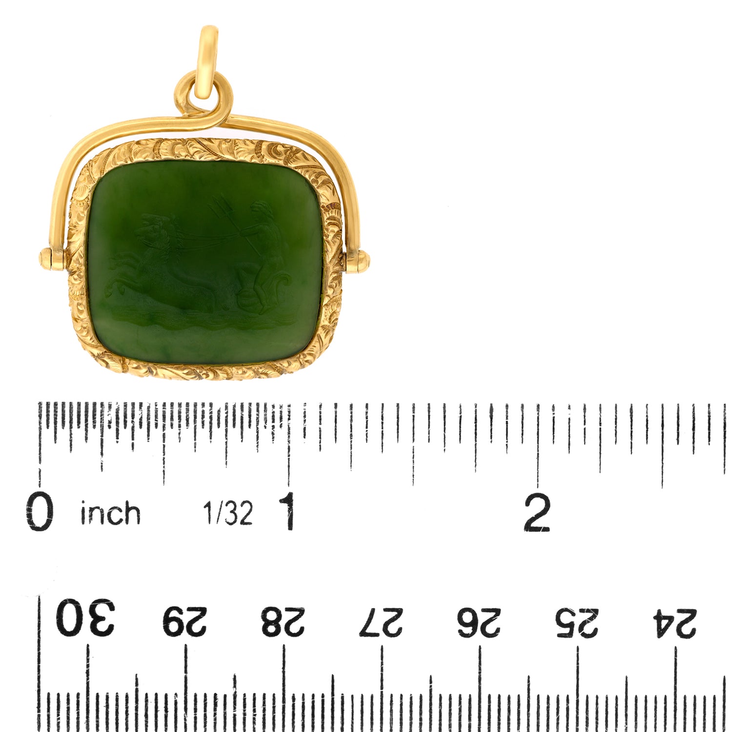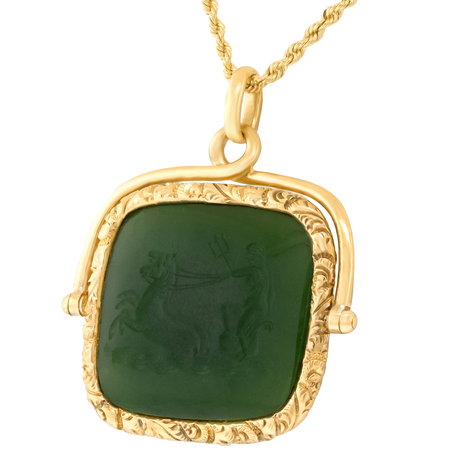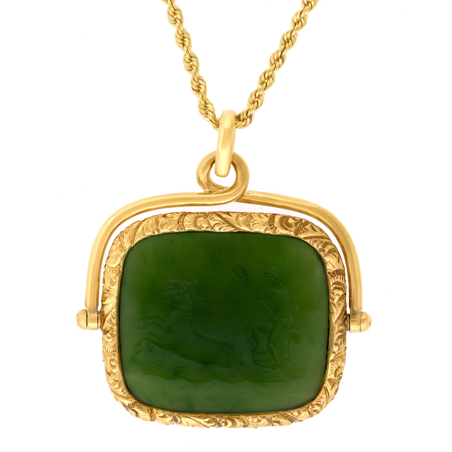 Circa 1880s, 14k. This nineteenth-century jade fob makes a unique and charming pendant. Featuring Poseidon on a chariot drawn by seahorses the intaglio carving is detailed and whimsical. Worn long or short, on its own or as part of a talismanic group, the look is town and country chic. Well made in fourteen-karat yellow gold, the piece feels wonderful on and is in excellent condition.