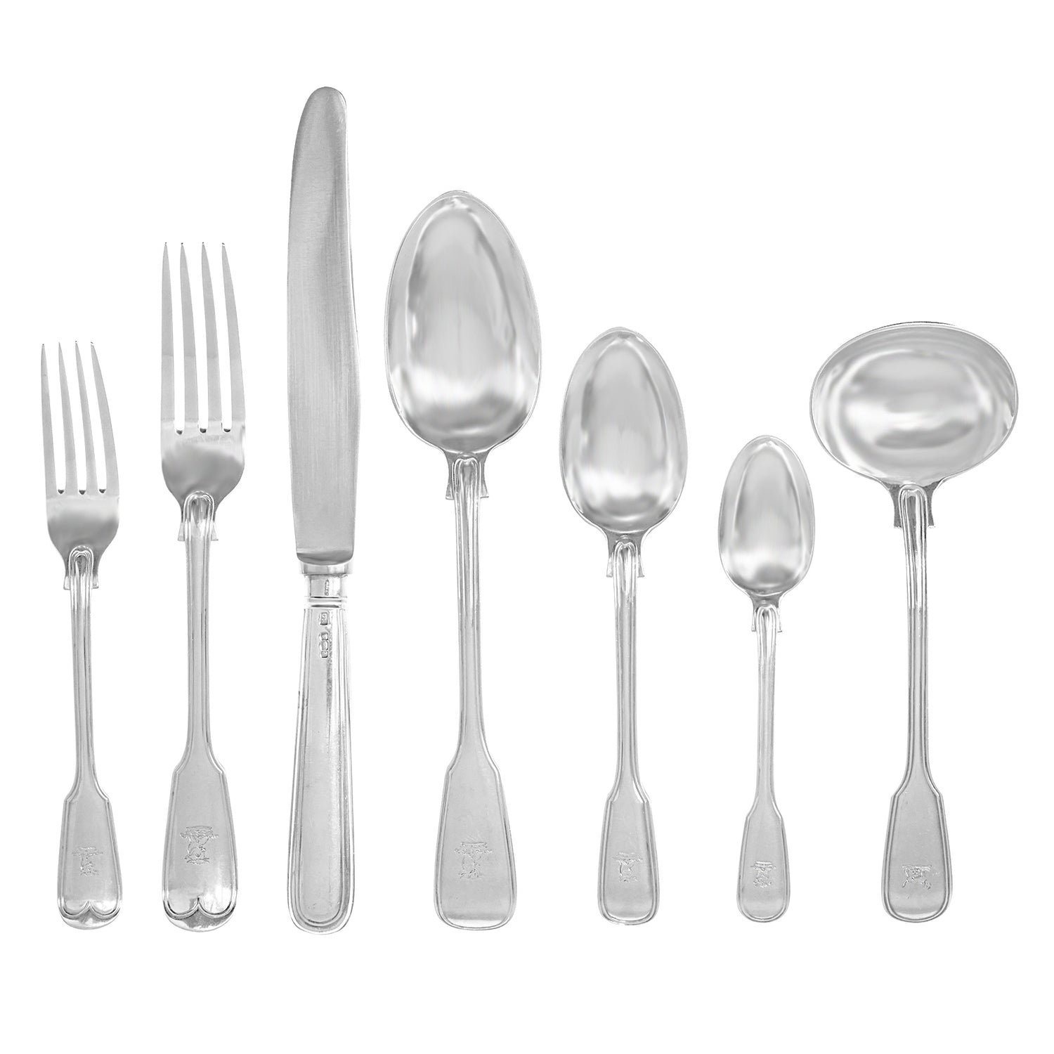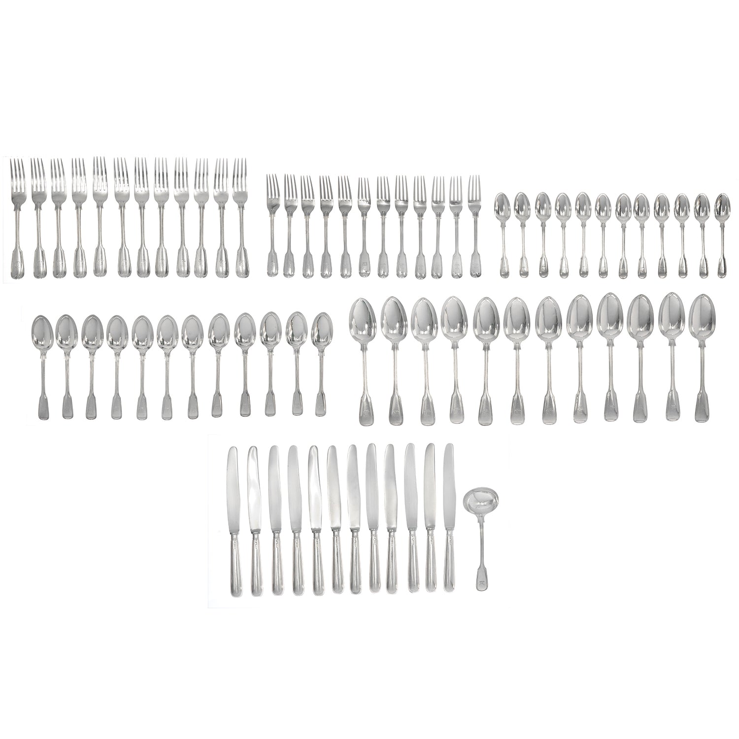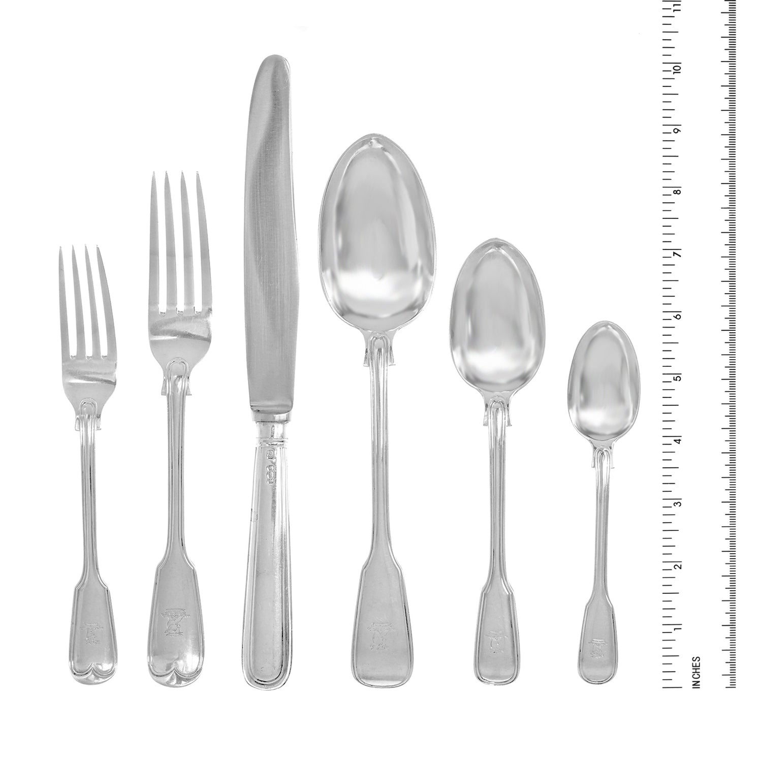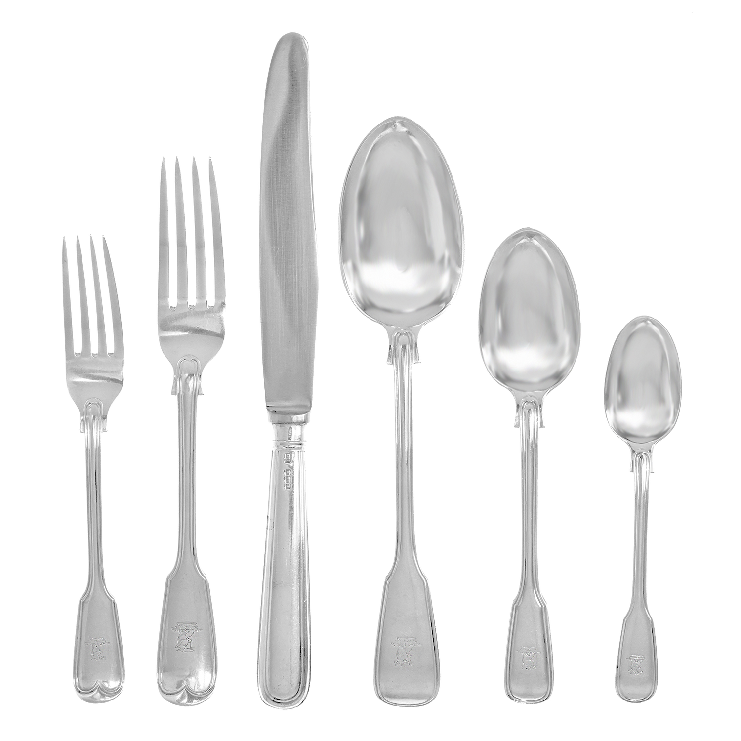 Circa 1869, Sterling, by George Adams, London, England. This fabulous complete set for twelve by George Adams, renowned London Silversmith, is in the classic fiddle and thread pattern. Heavy and well-made, they bear a wonderful cow over crown armorial, probably denoting a set from a royal’s county home. Very good condition.
