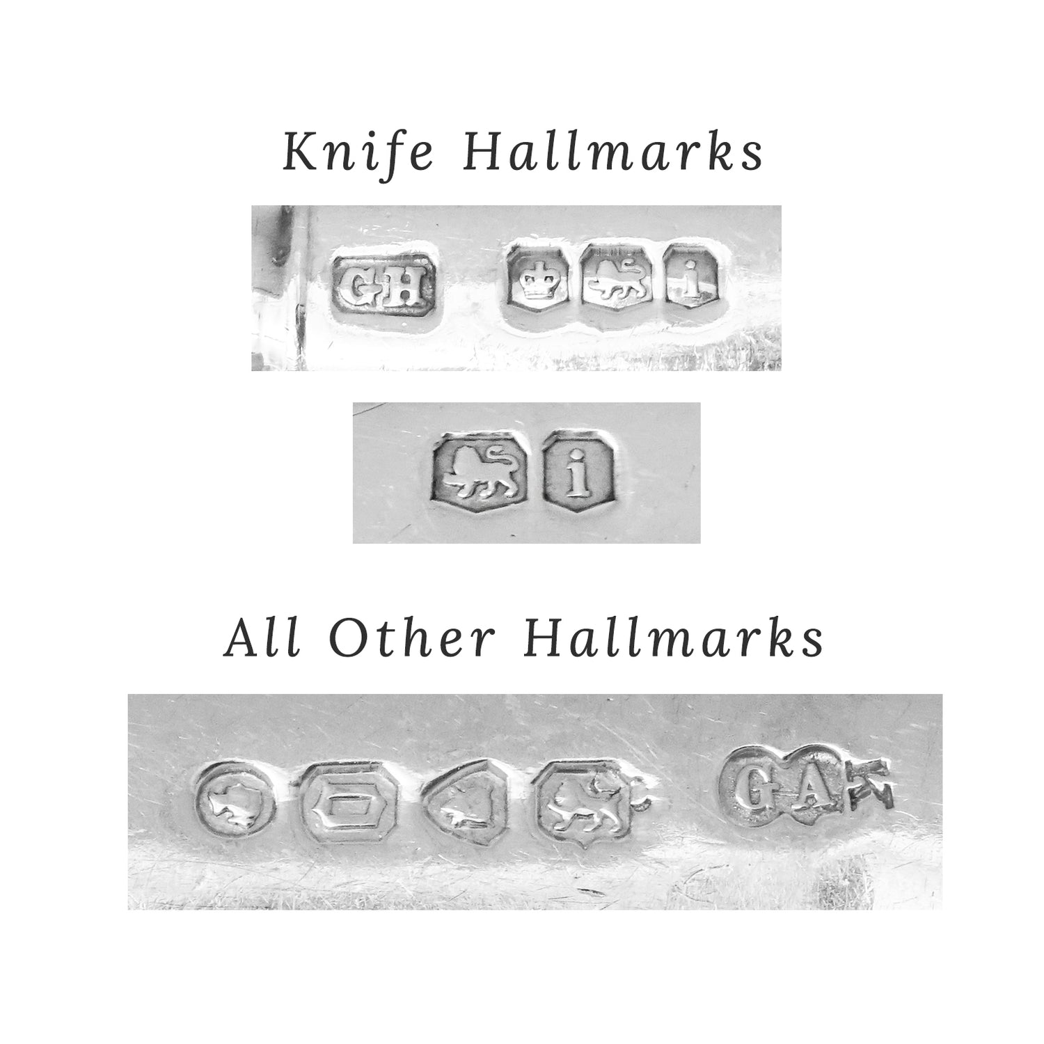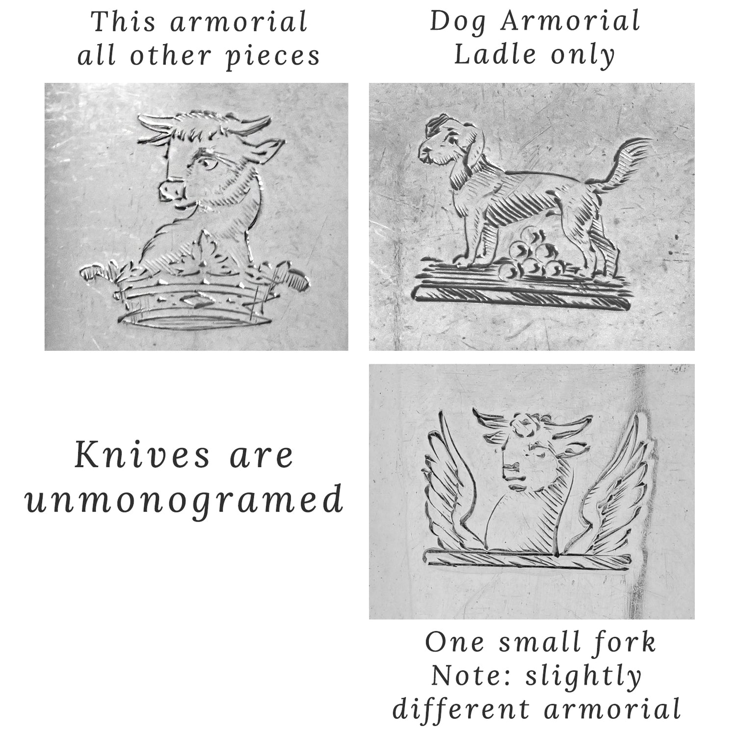 Noted: The matching sterling-handled knives are later, as sets of this period rarely had matching knives or they rarely survived. Also, one of the small forks has a slightly different armorial …the cow has wings.
