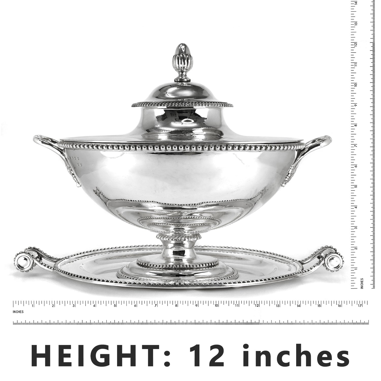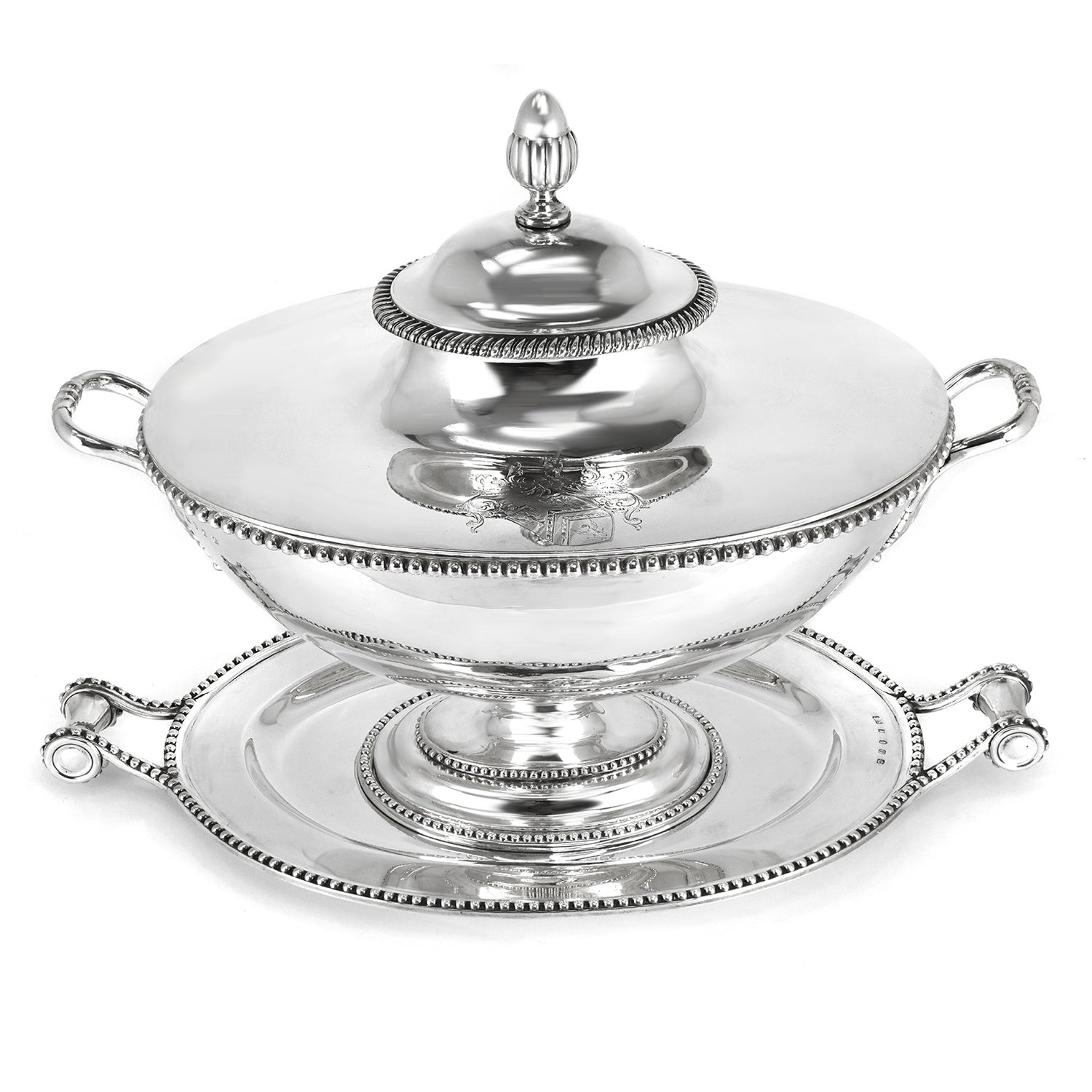 Datemarked 1850, Sterling, by James Dixon & Son, Sheffield England.  This tureen and underplate is a superb example of early Victorian British sterling. Beautifully designed, it features an acorn finial, heavily beaded edges, gadrooned edging, fabulous rolled handles, and a gorgeous coat of arms.  Heavy and well-made, it is both decorative and perfect for service. Excellent condition.
