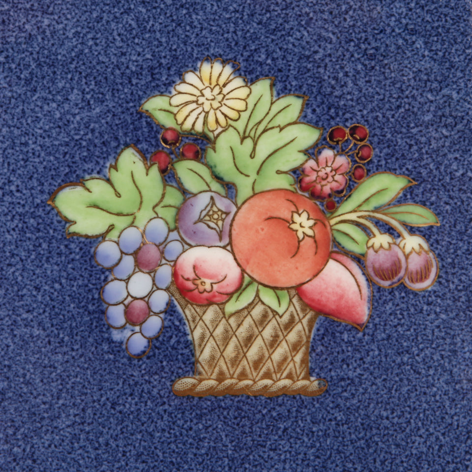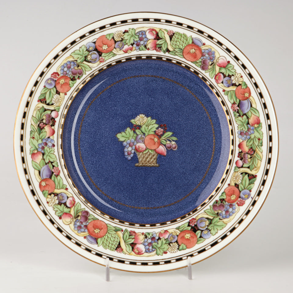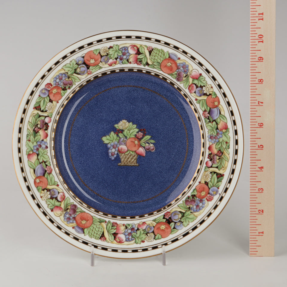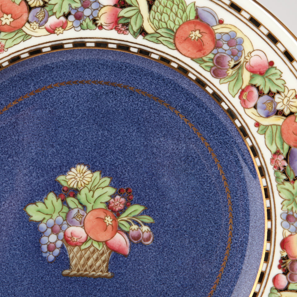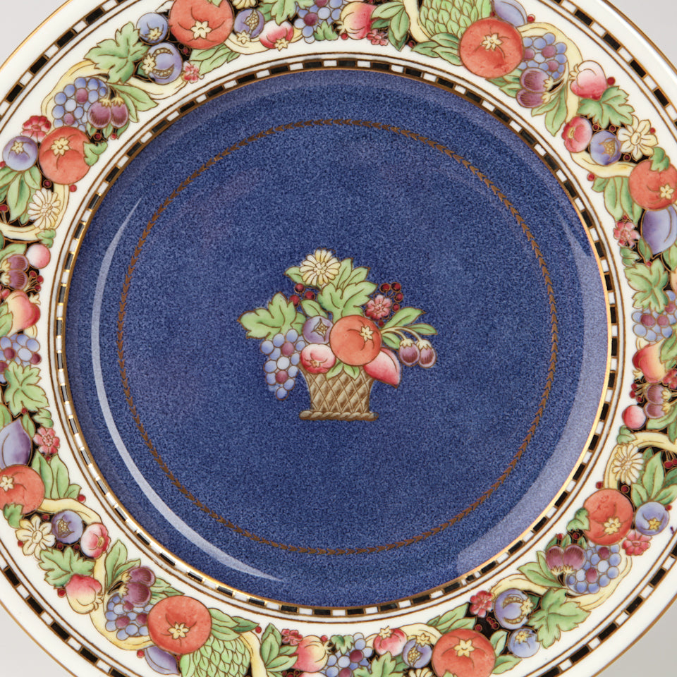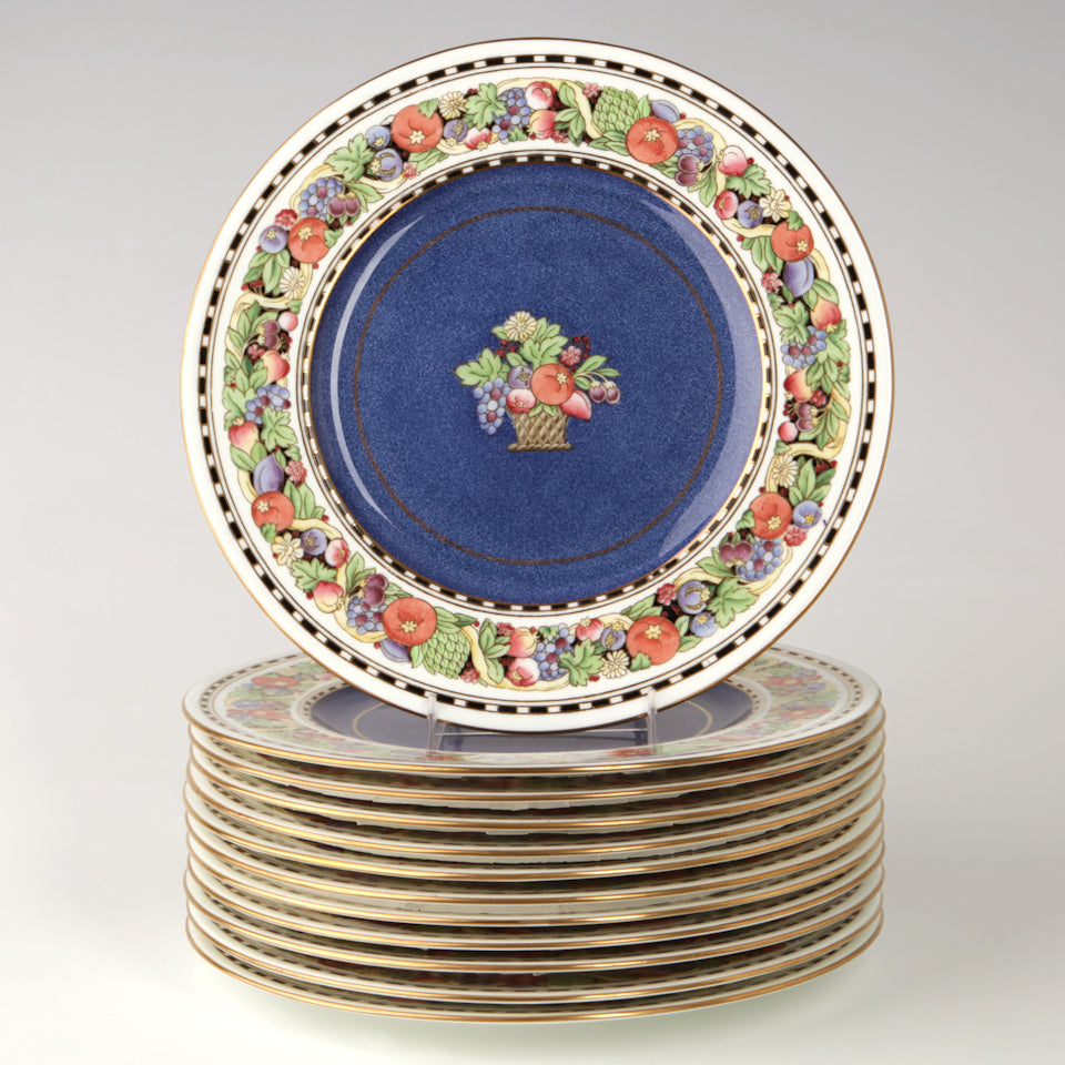 Set of 12 dinner plates, Wedgwood, circa 1890s. Pattern #x9789, Fruit design. Also, some plates are marked with a "y', and others with a "D", possibly decorator's marks. These plates are likely custom ordered; the design in the center of the plates is not normally associated with this pattern. Excellent condition throughout with no wear, damage, cracks, chips, or repairs noted.