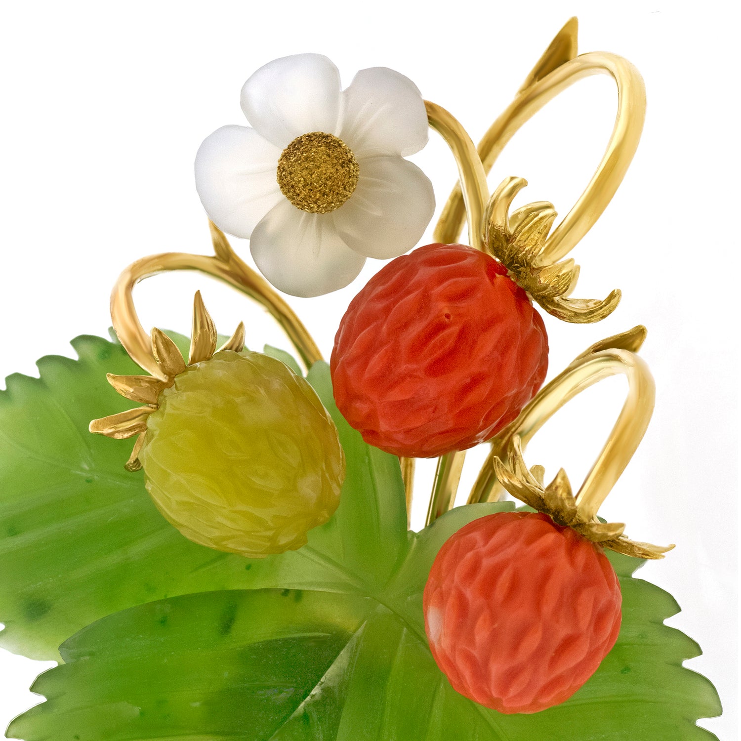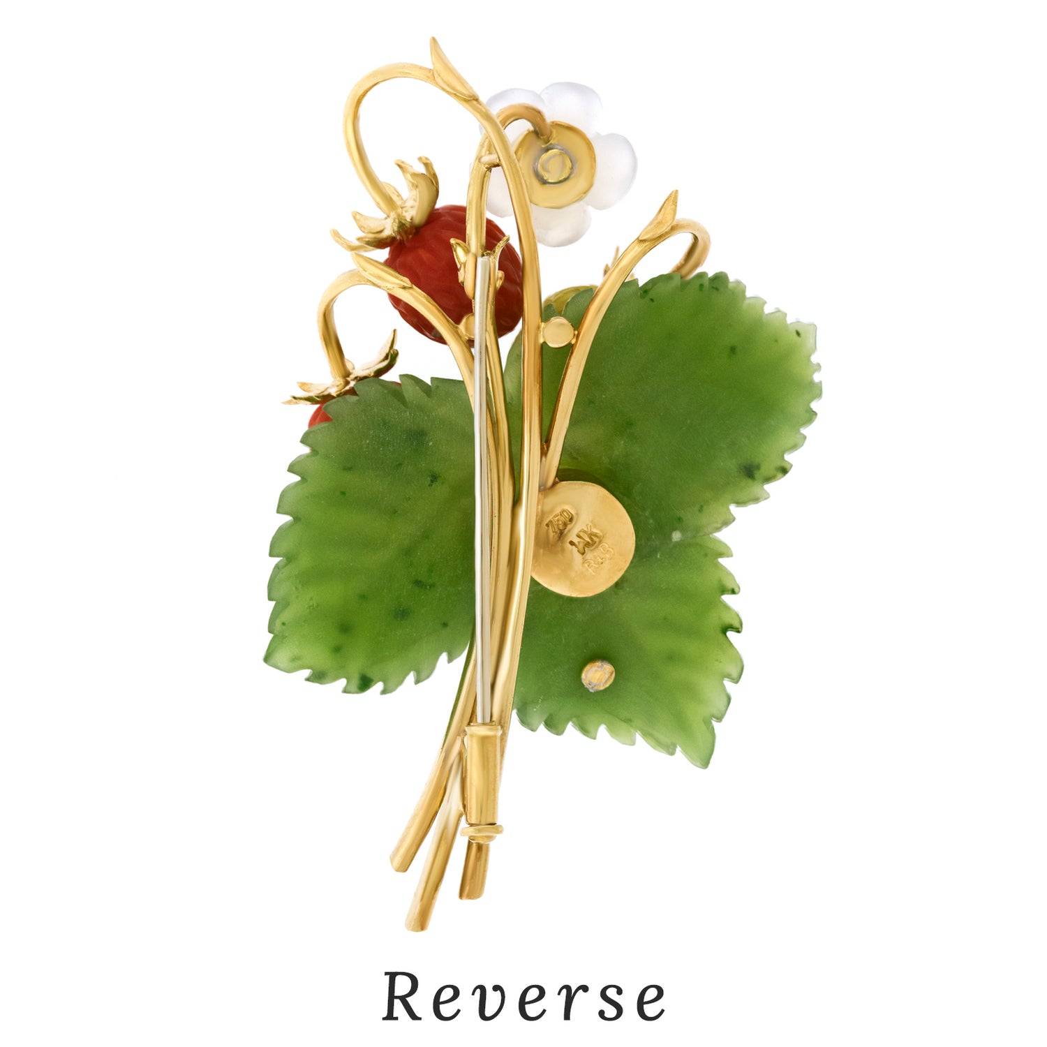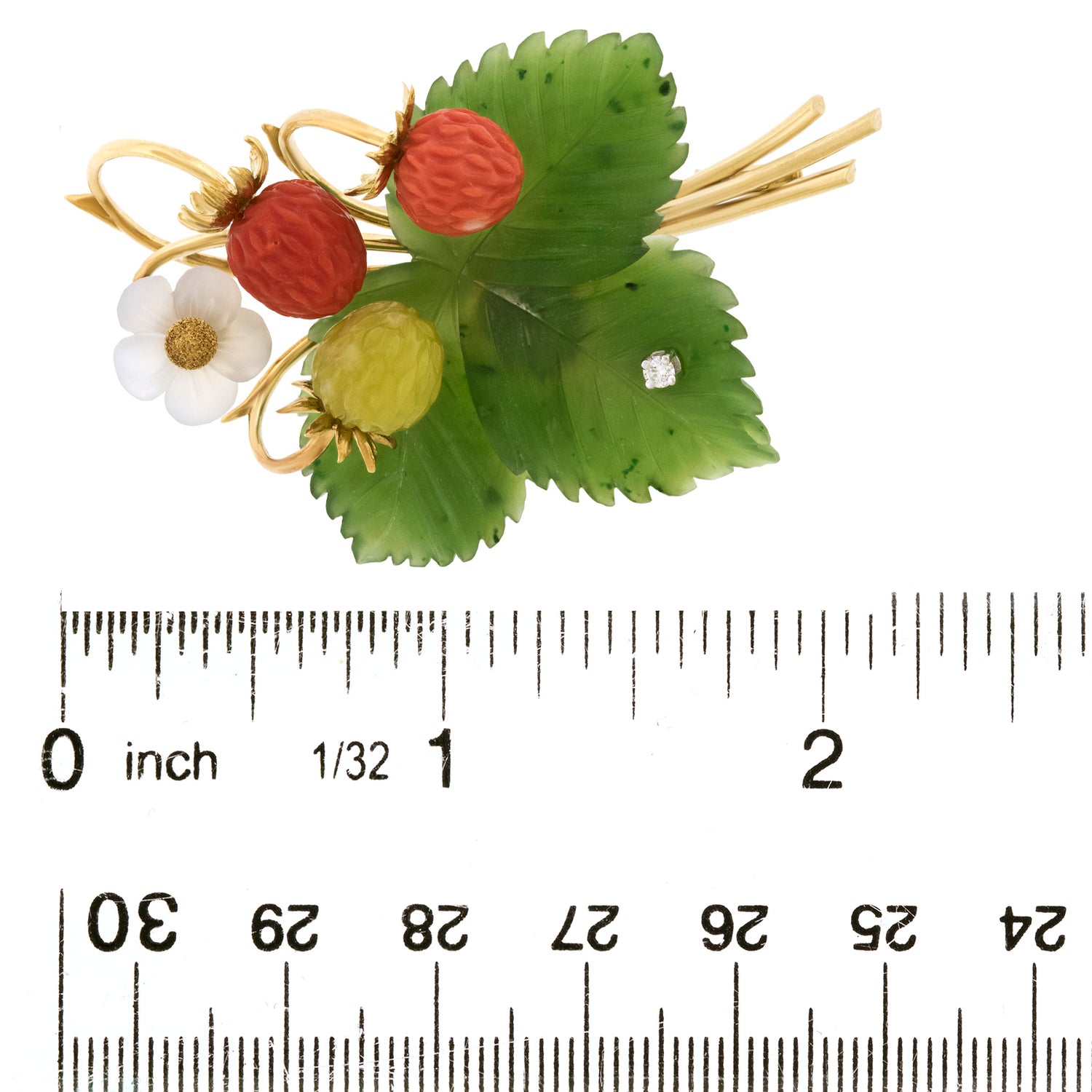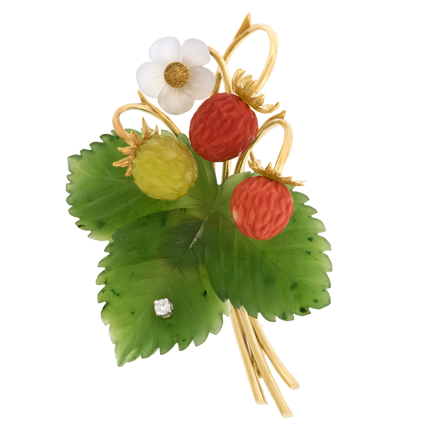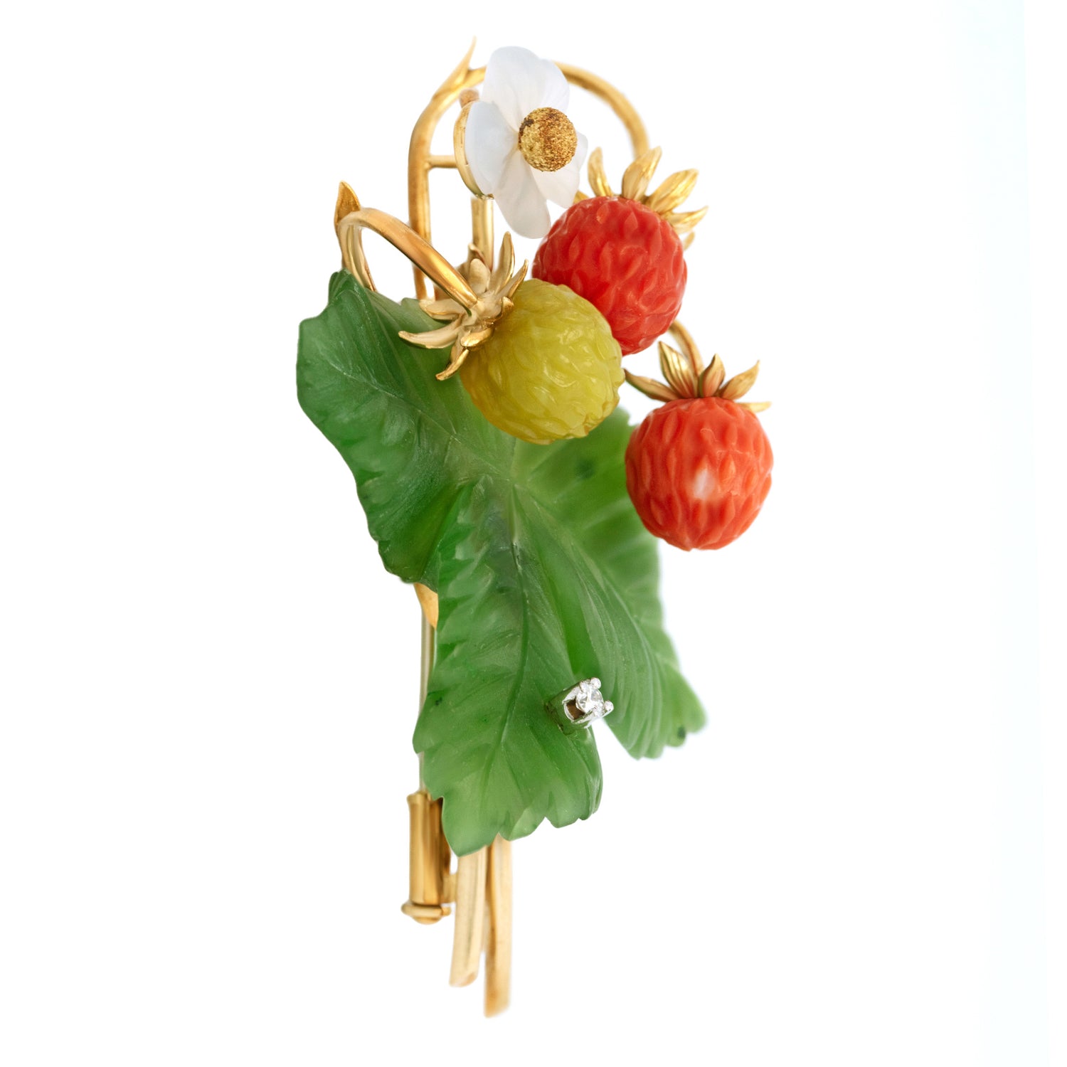 Circa 1960s, 18k, by Bolli, St. Gallen, Switzerland. This pin's spray of coral strawberries and lush jade leaves is perfect for a dress or jacket. It's breezy vintage chic effortlessly dresses up or down… try it on the bow of a sash. Hand-carved naturalistic details make this Swiss brooch a one-of-a-kind, notice the unripen third strawberry! Wild strawberries are smaller, sweeter, and tastier than store-bought, and must be eaten where and when you find them, …the enchantment of a perfect moment. Made by the esteemed goldsmith Bolli of St. Gallen established in 1933, this jewel is in excellent condition.