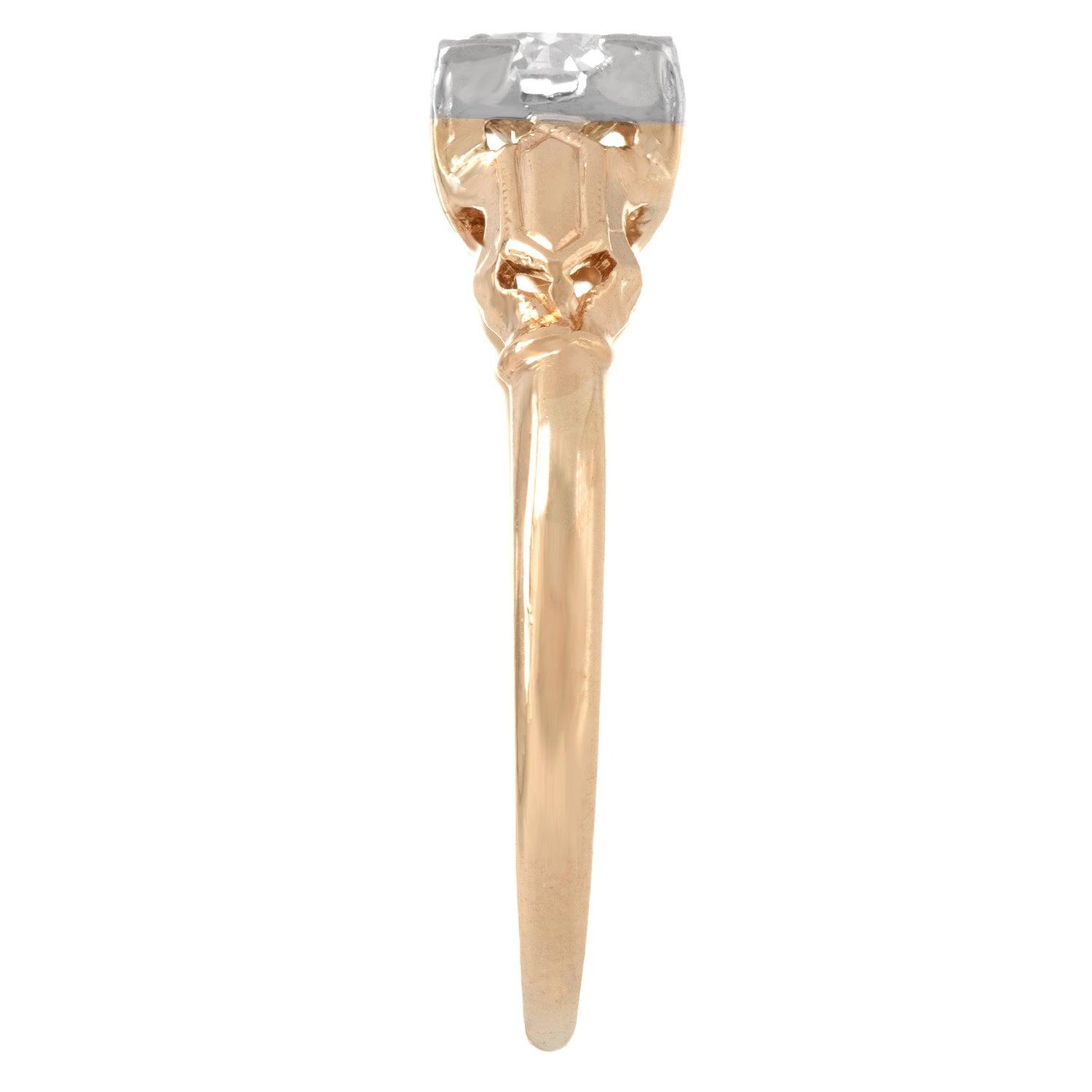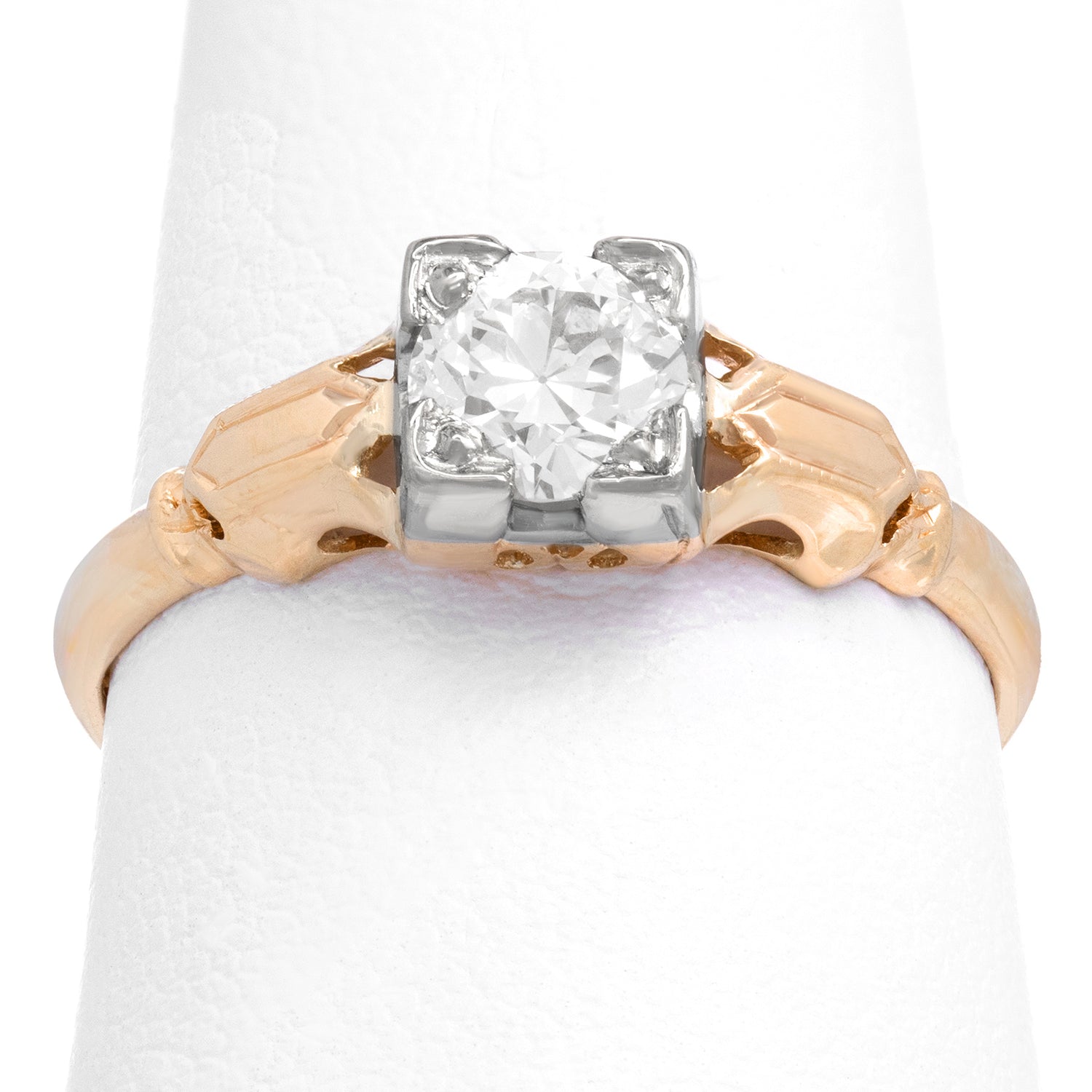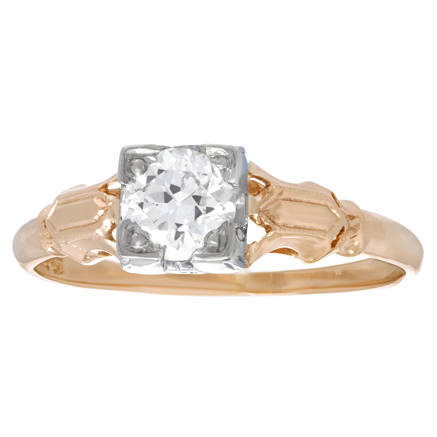 Circa 1940s, 14k, American. This gorgeous forties engagement ring has a feminine retro look. Finely fabricated in 14k yellow gold and set with a brilliant .59 carat J color SI1 clarity diamond, its beautiful form is timeless. Excellent condition.