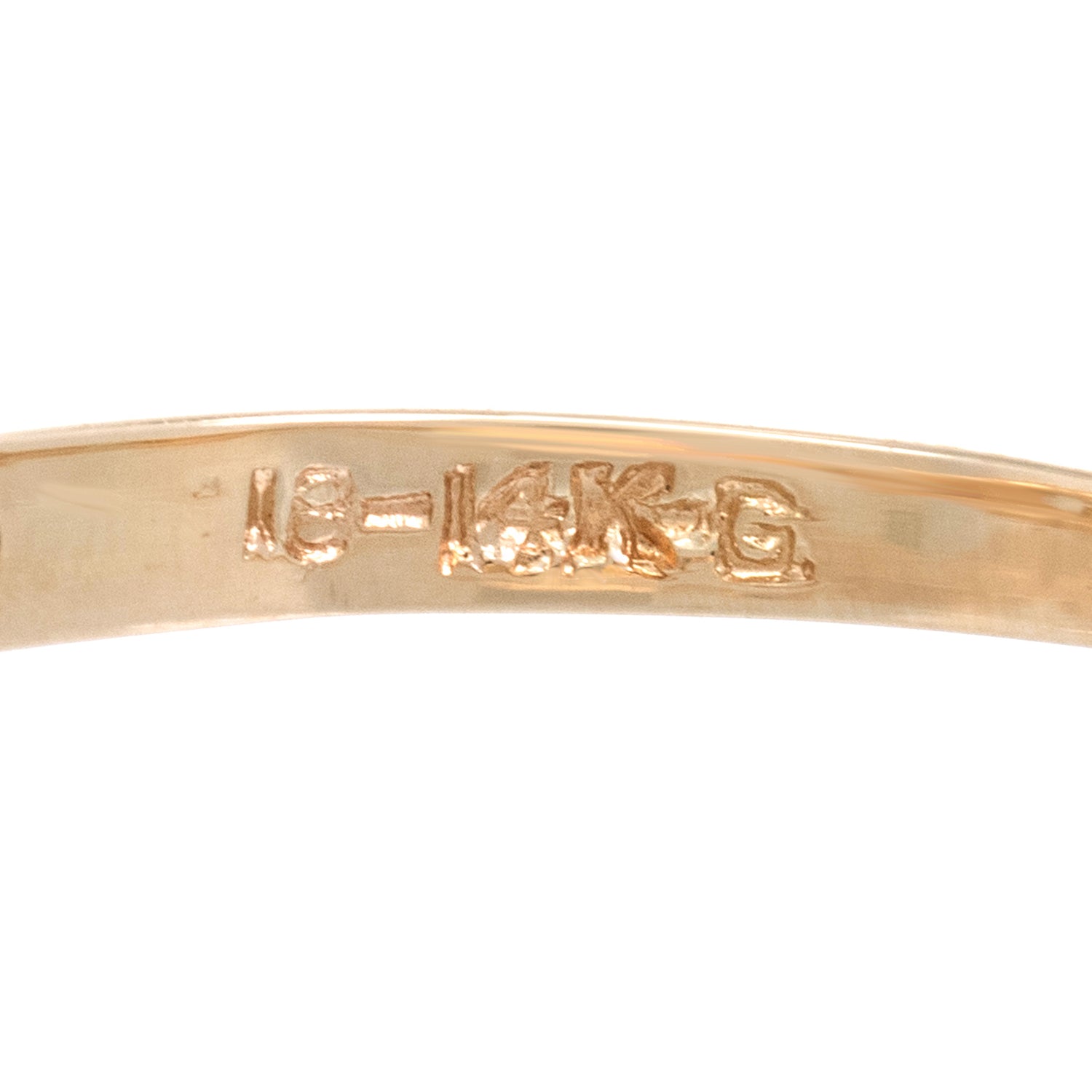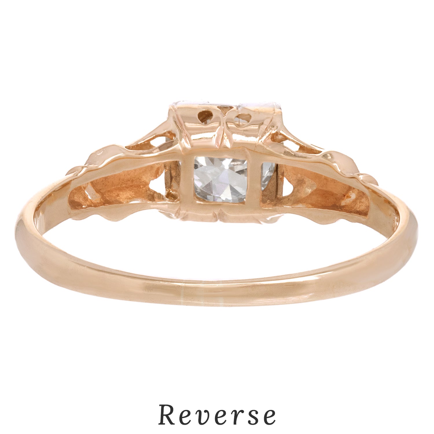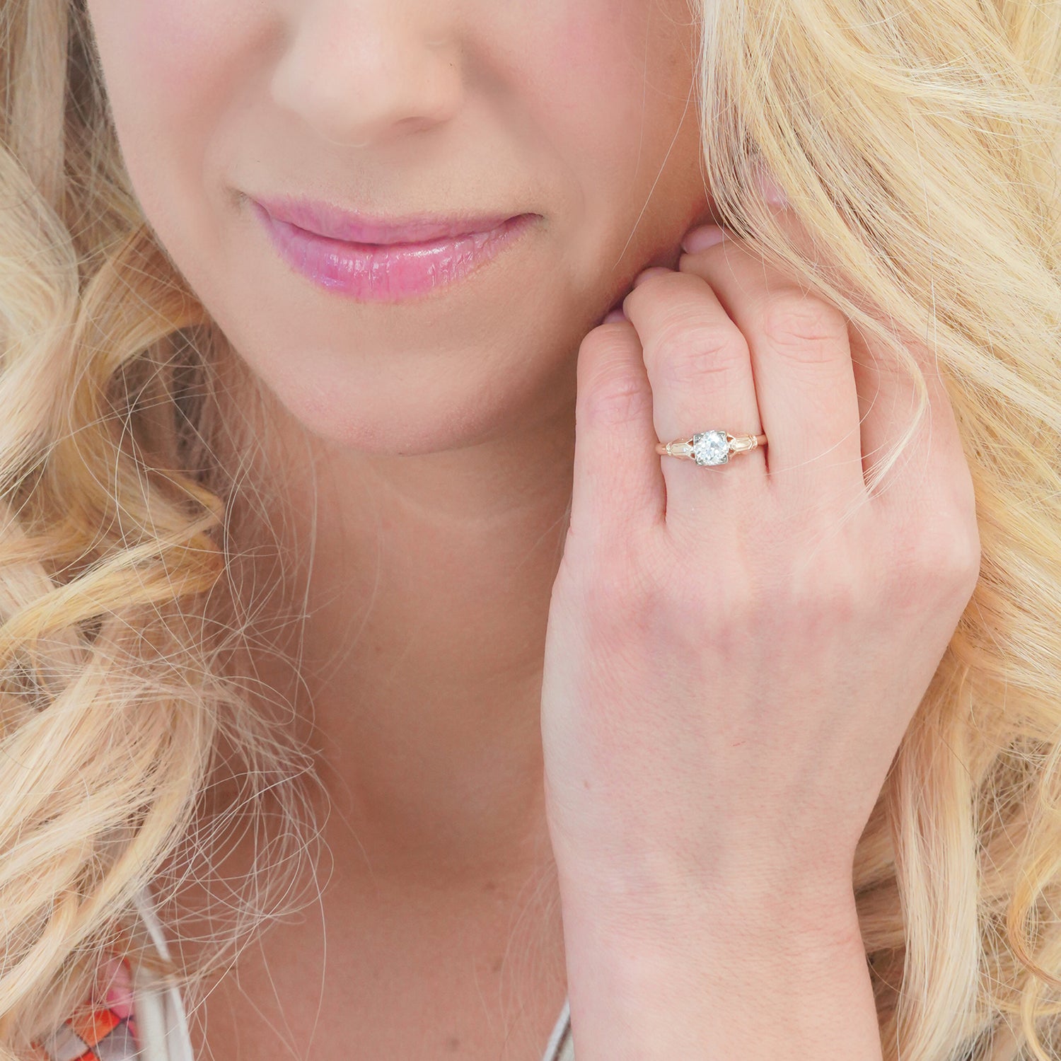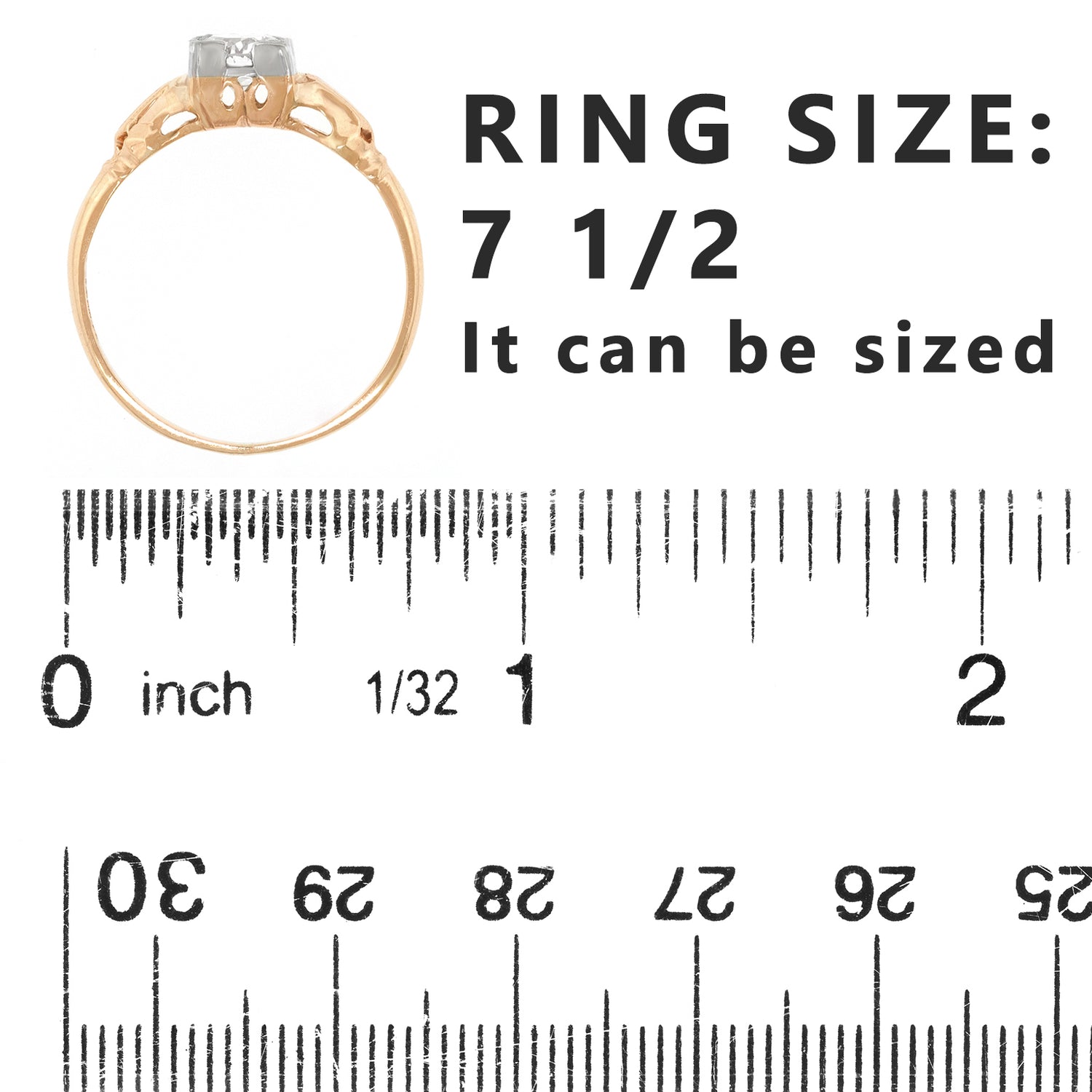 Circa 1940s, 14k, American. This gorgeous forties engagement ring has a feminine retro look. Finely fabricated in 14k yellow gold and set with a brilliant .59 carat J color SI1 clarity diamond, its beautiful form is timeless. Excellent condition.
